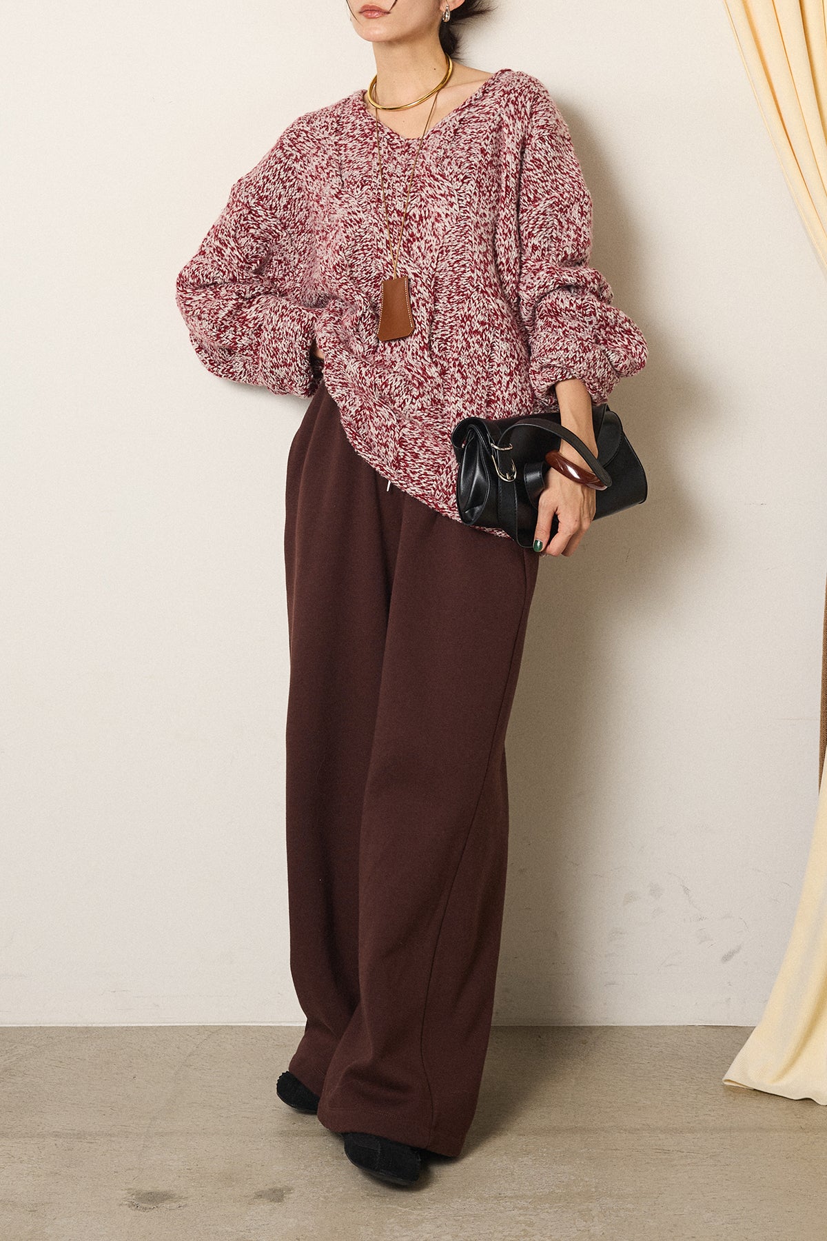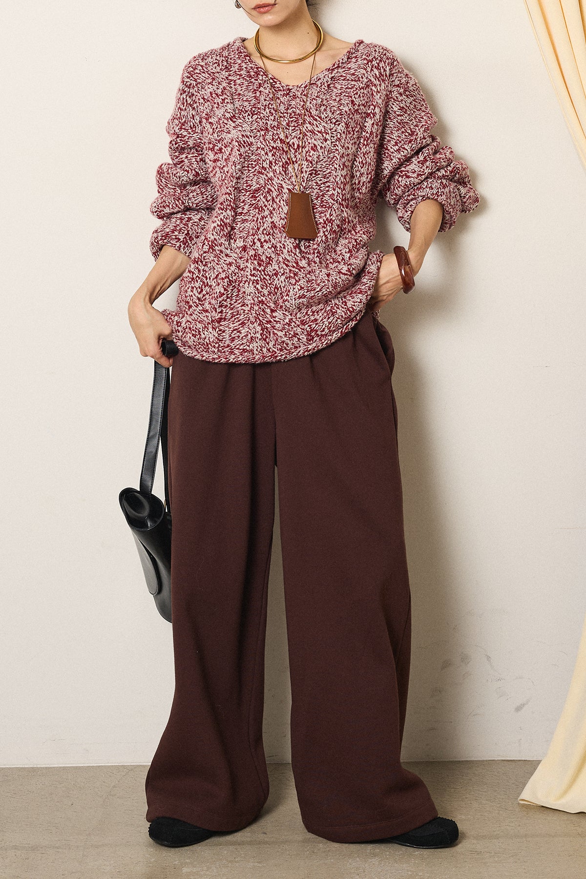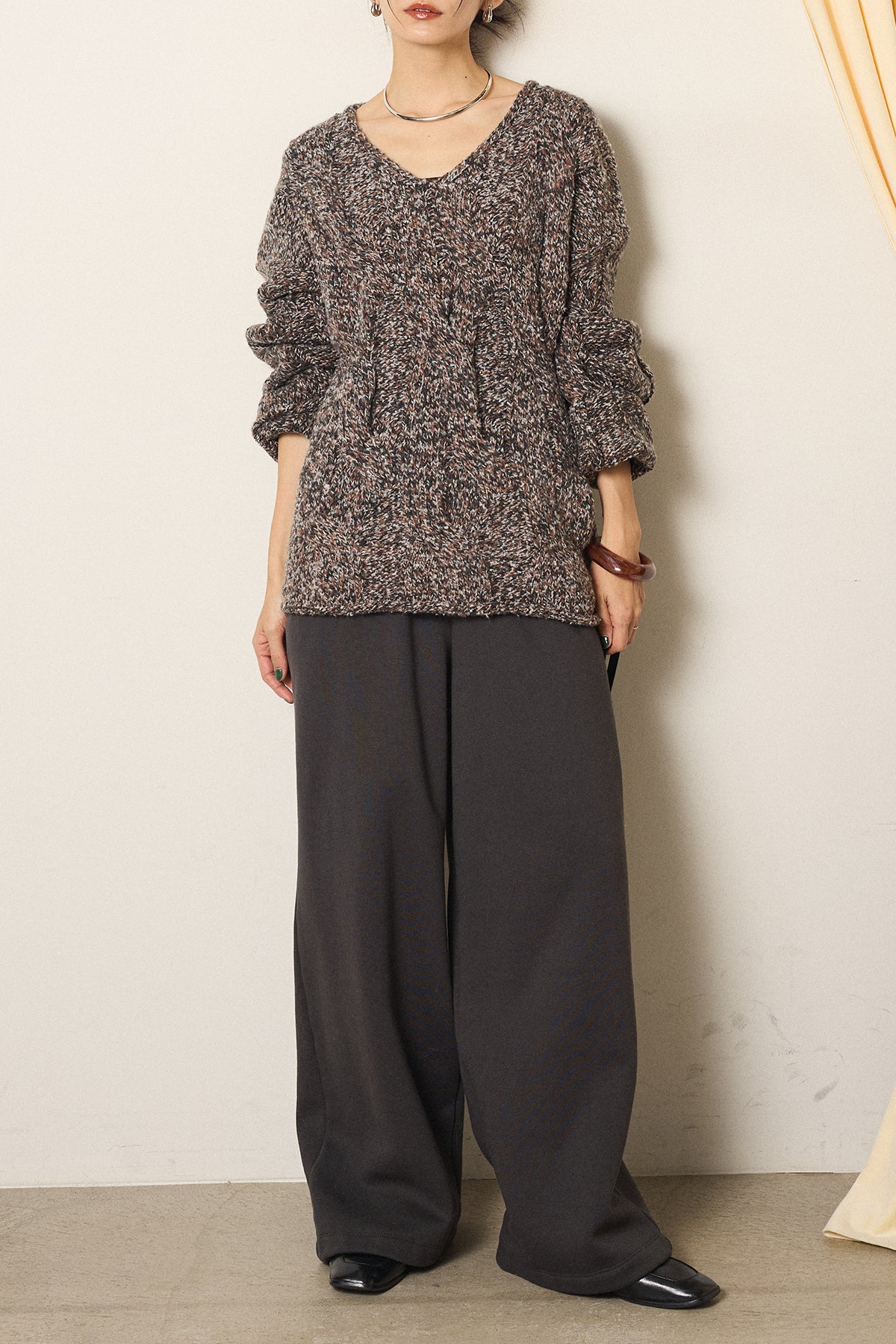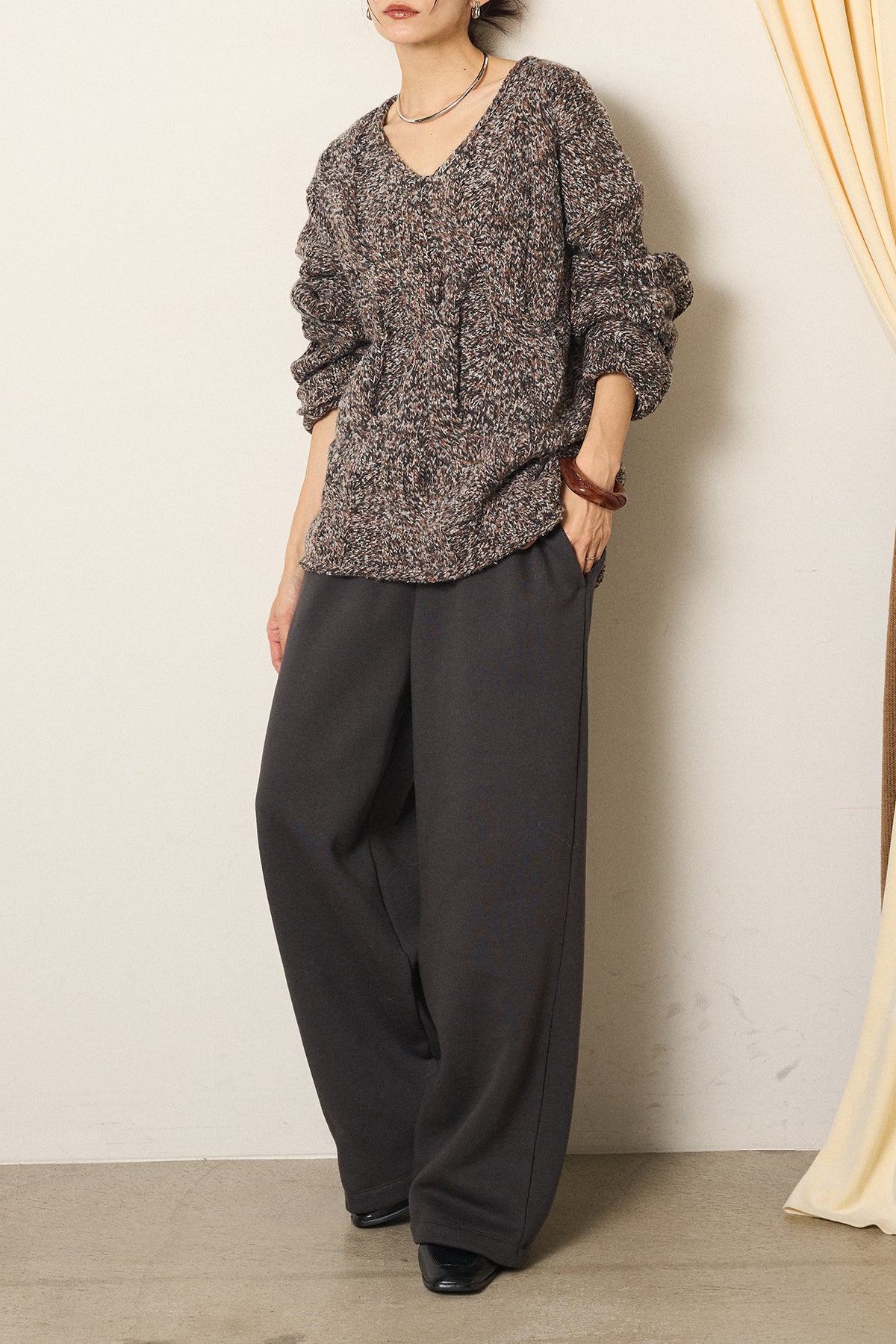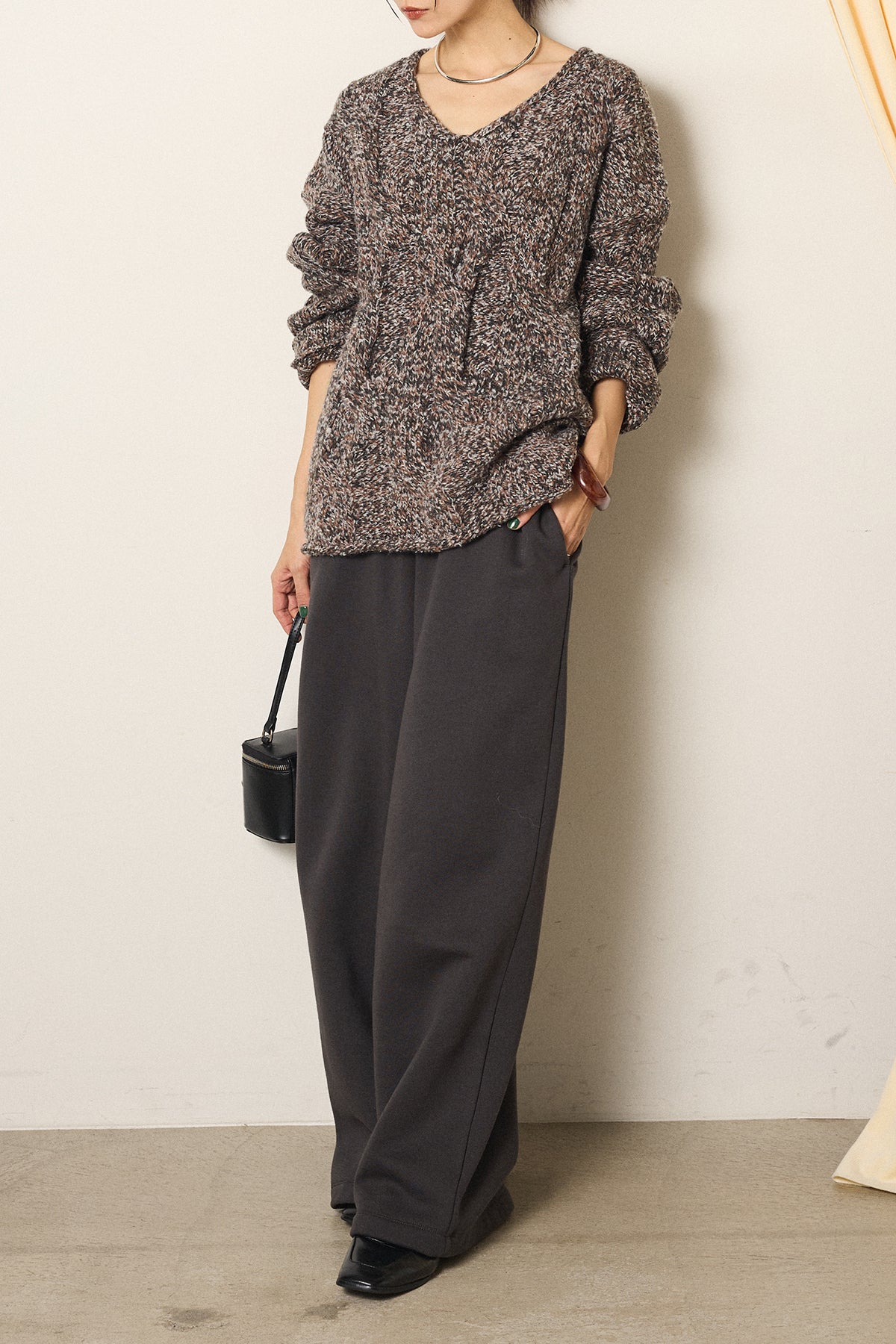 [SET]Vネックミックス編みニットトップス+裏起毛スウェットワイドパンツ(2set)