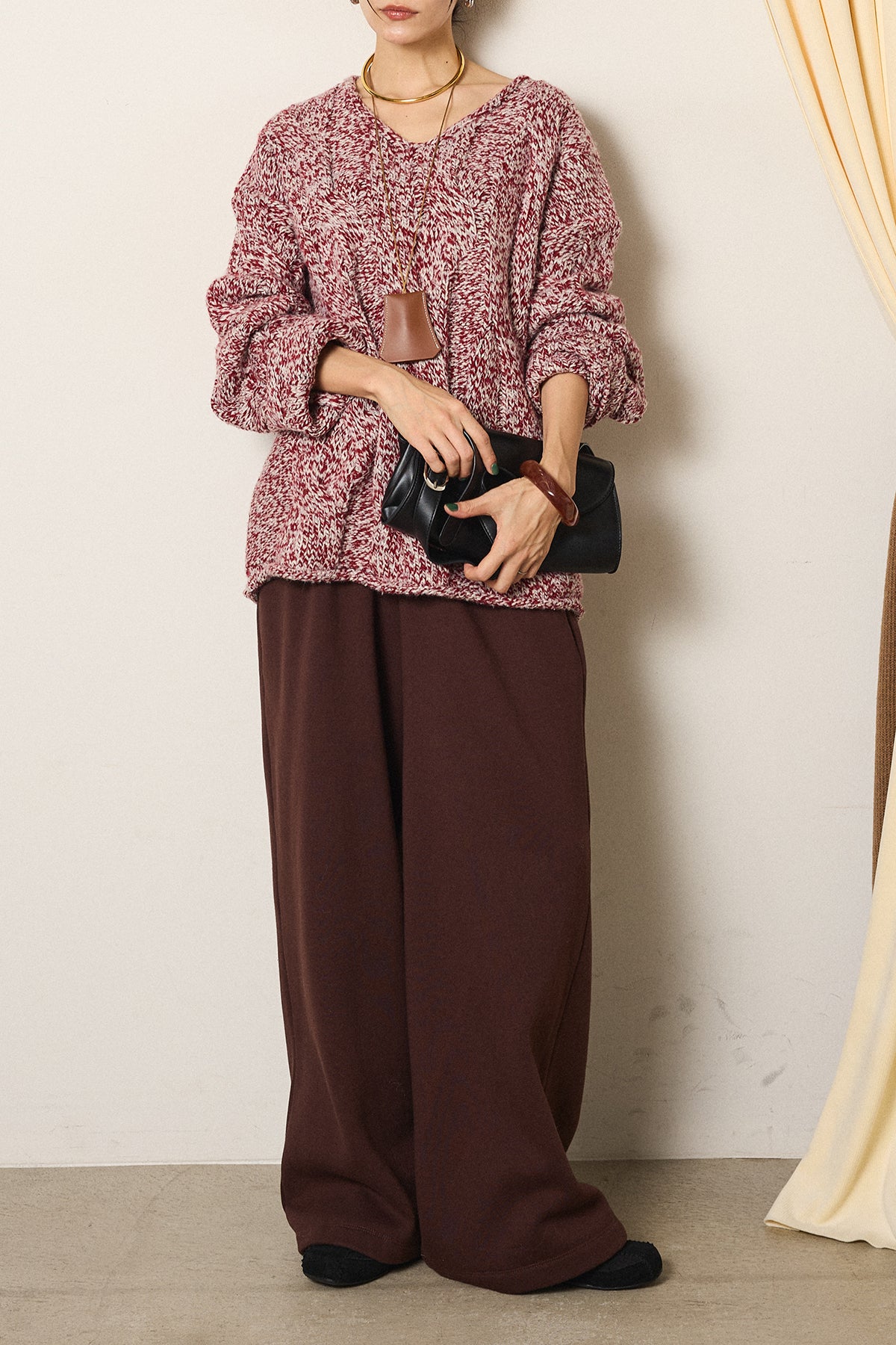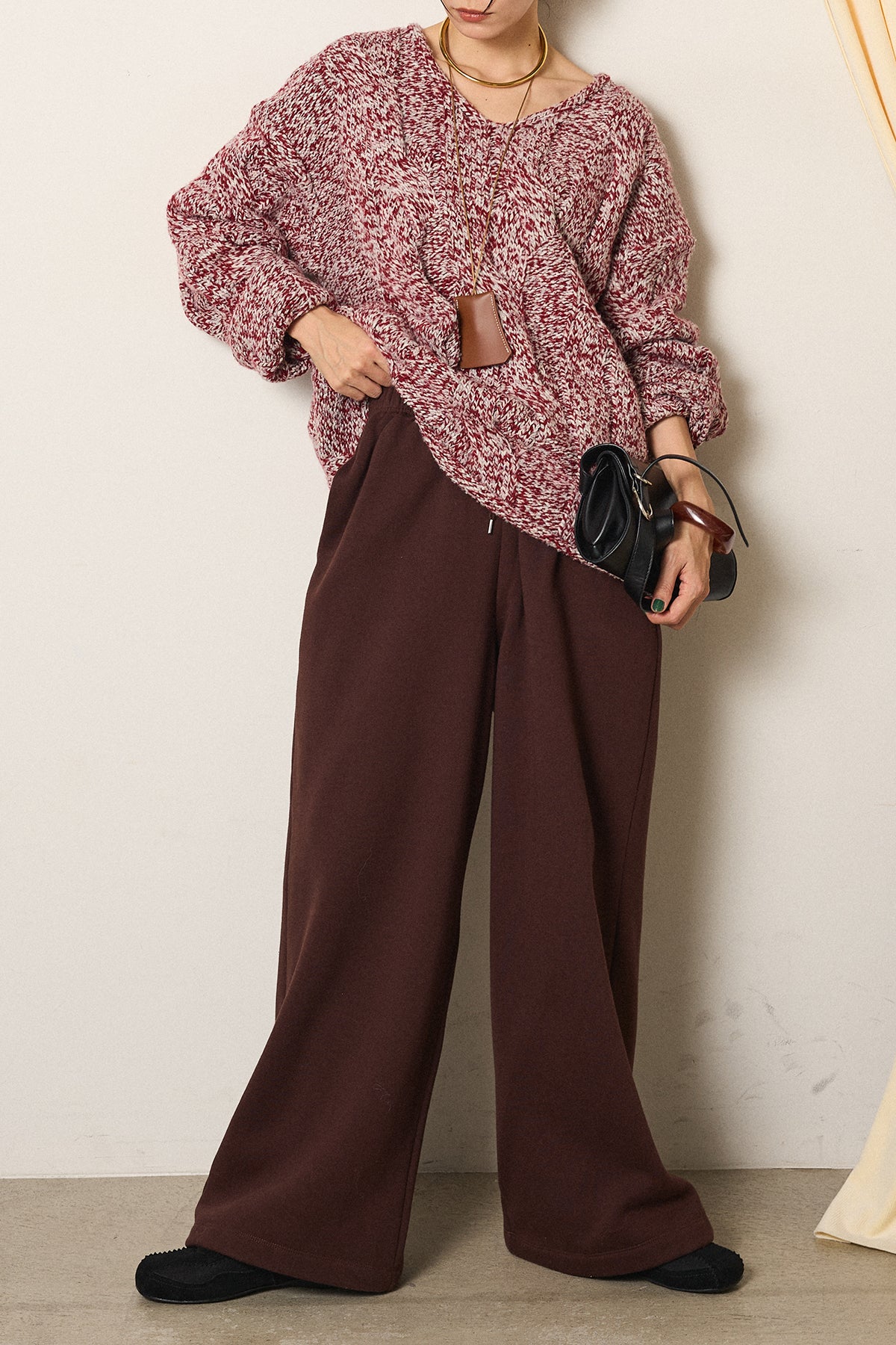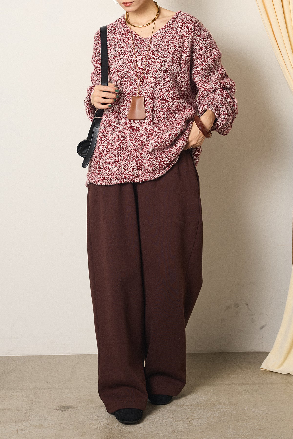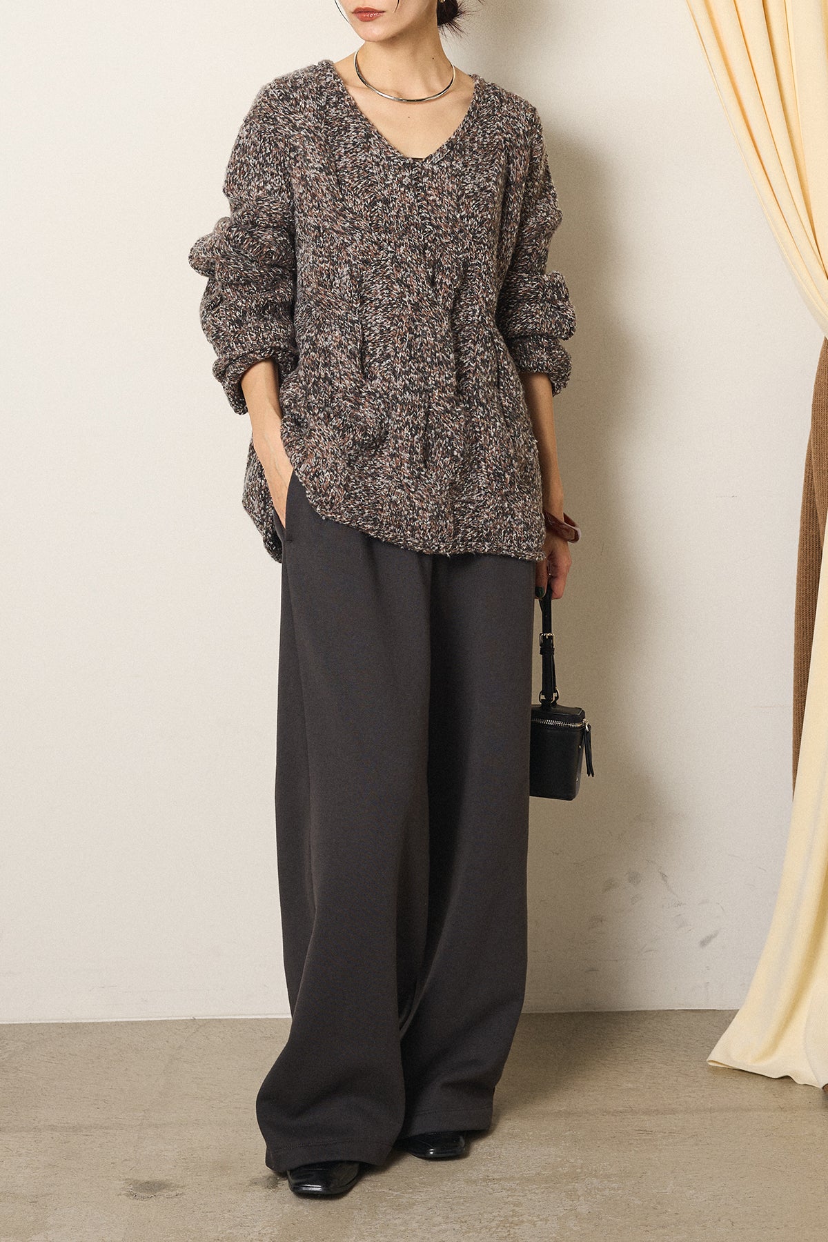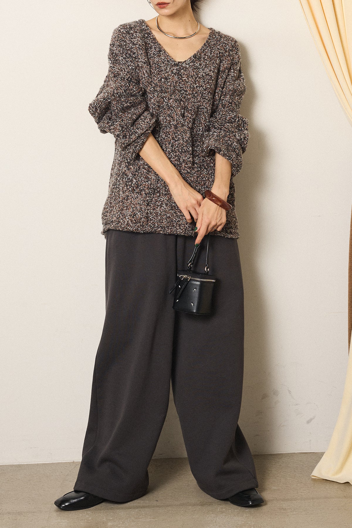 [SET]Vネックミックス編みニットトップス+裏起毛スウェットワイドパンツ(2set)
