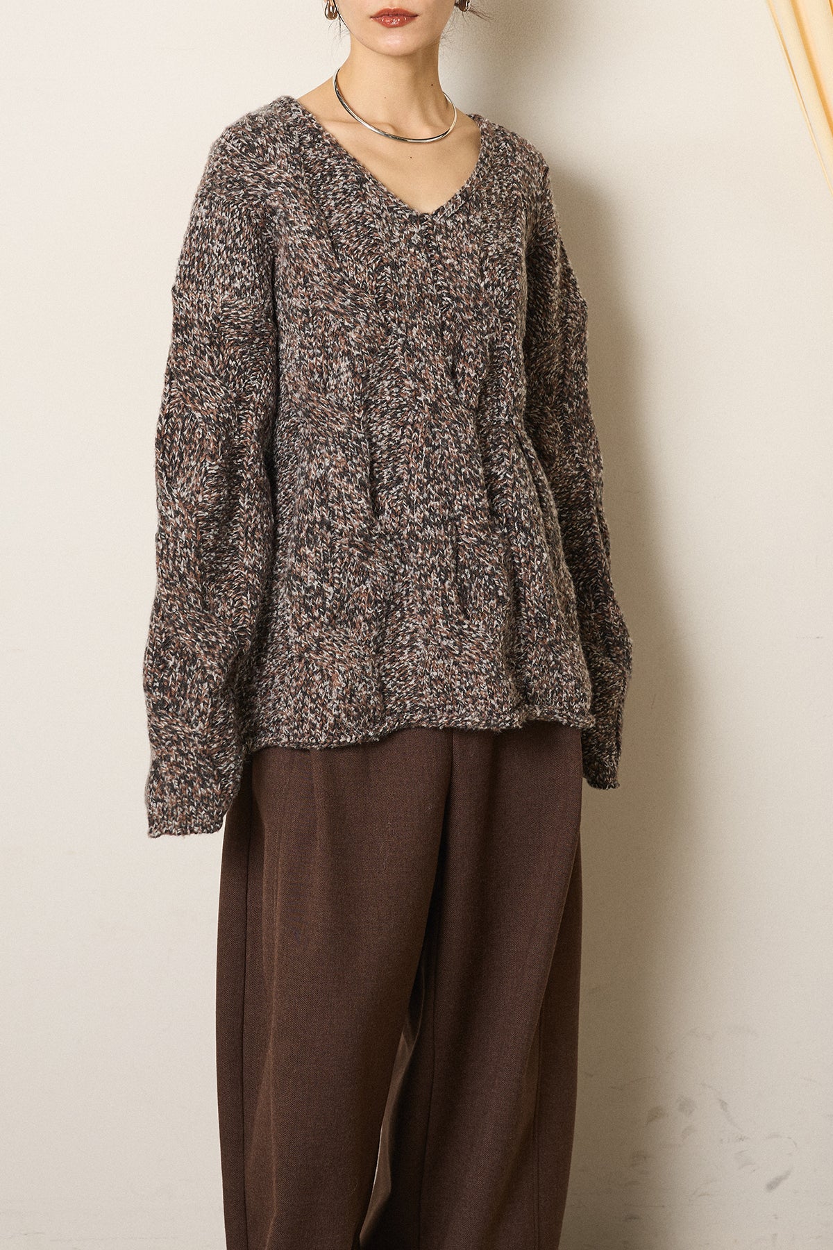 ◆ Vネックミックス編みニットトップス