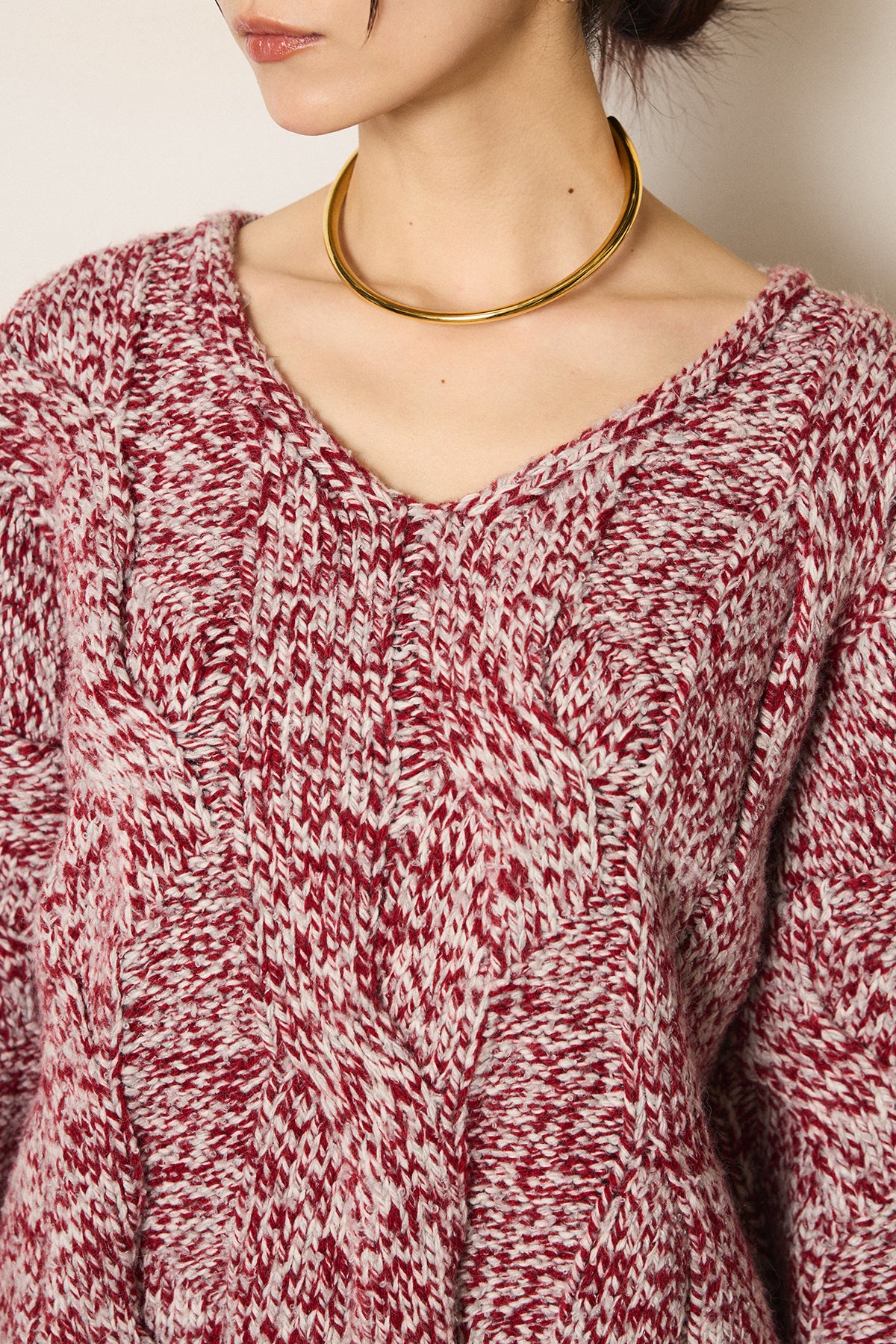 Vネックミックス編みニットトップス