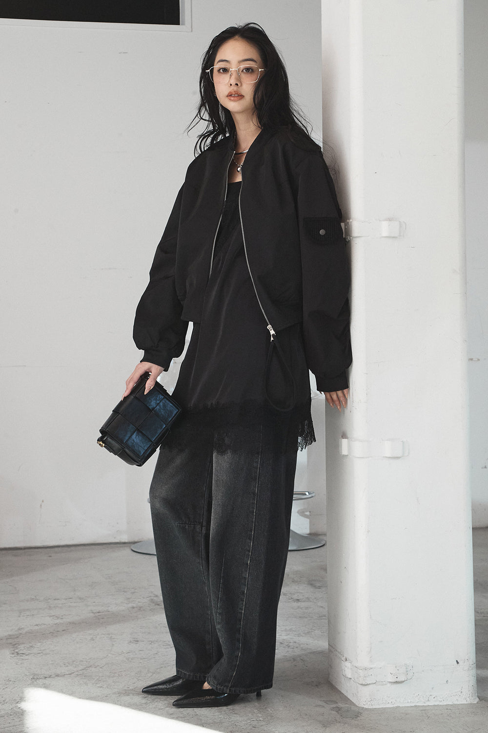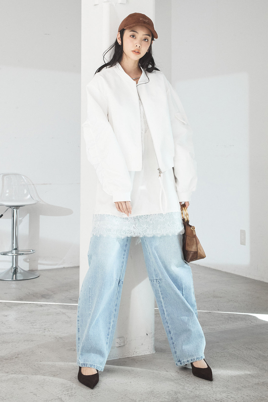 [SET]袖ギャザーデザインブルゾン+レース切り替えキャミソール+デニムアシメカーブパンツ(3set)