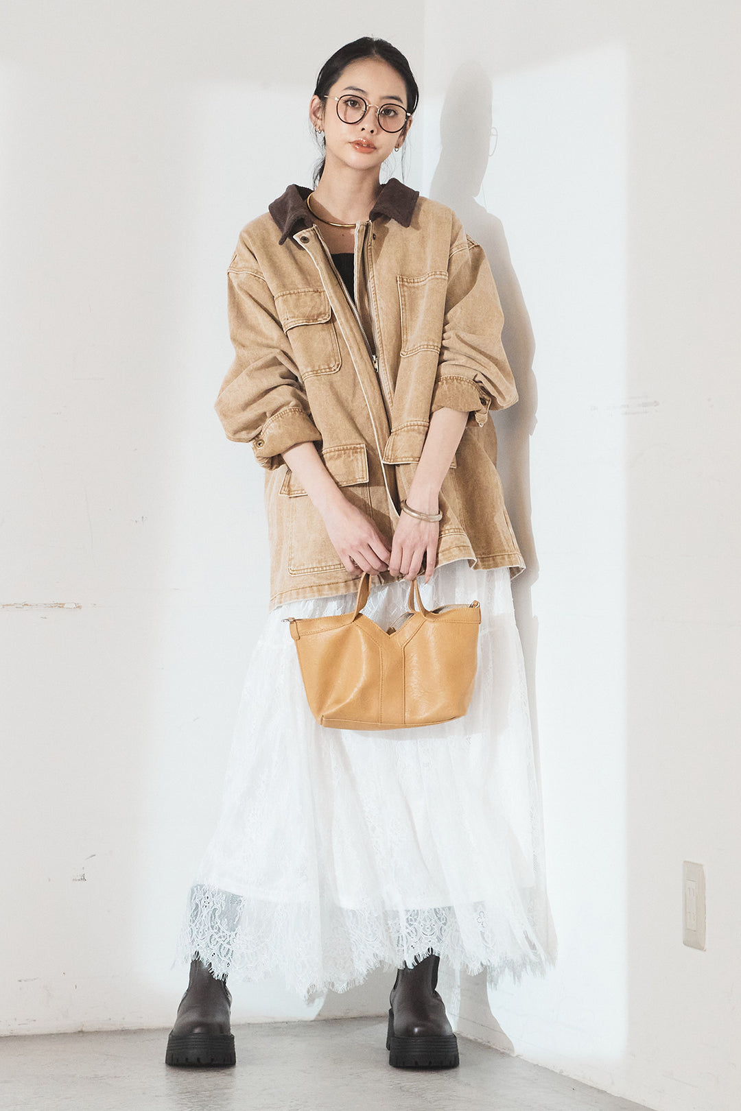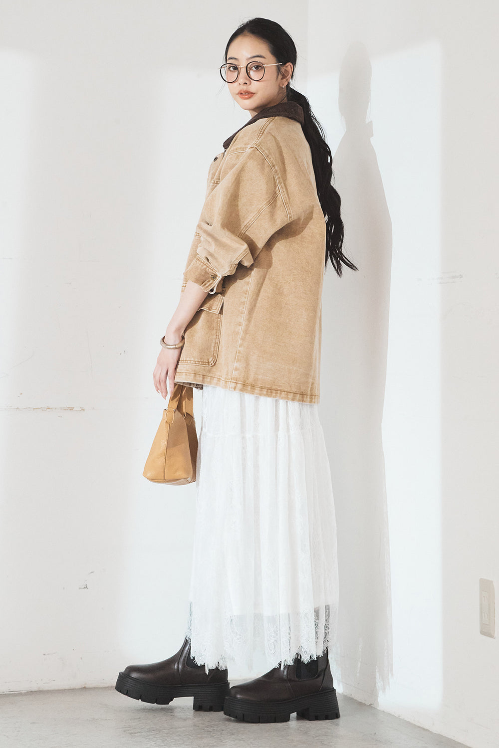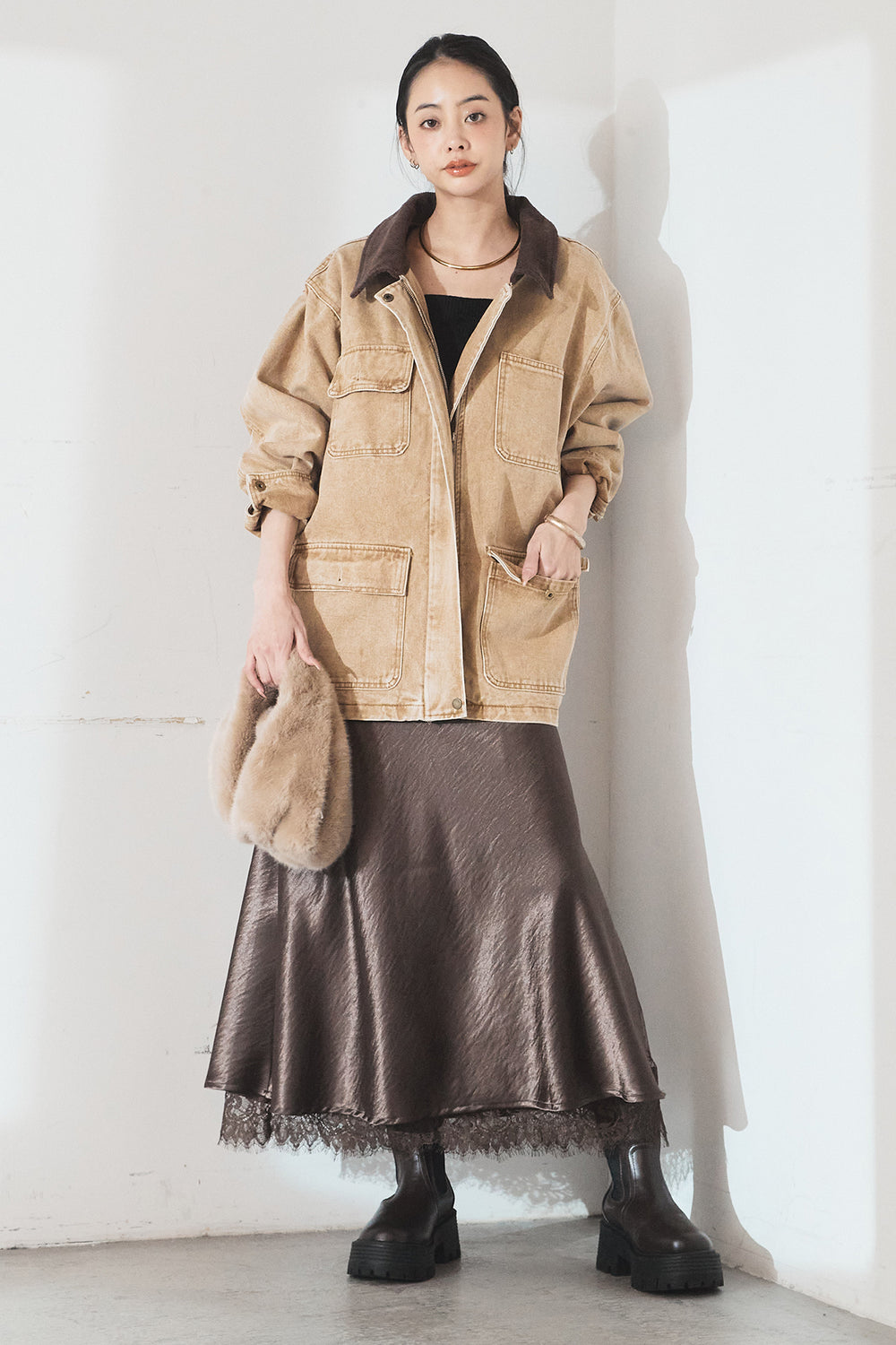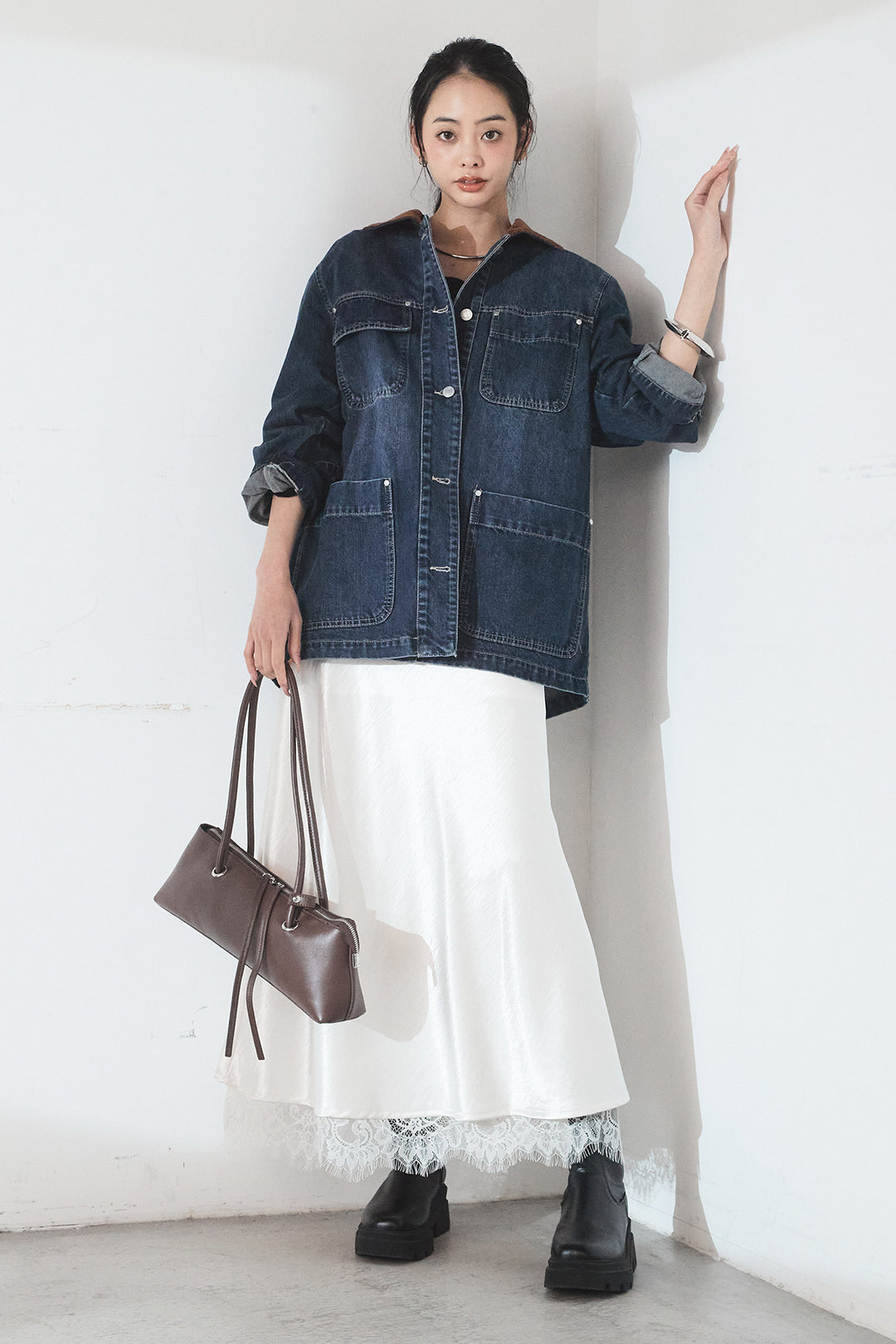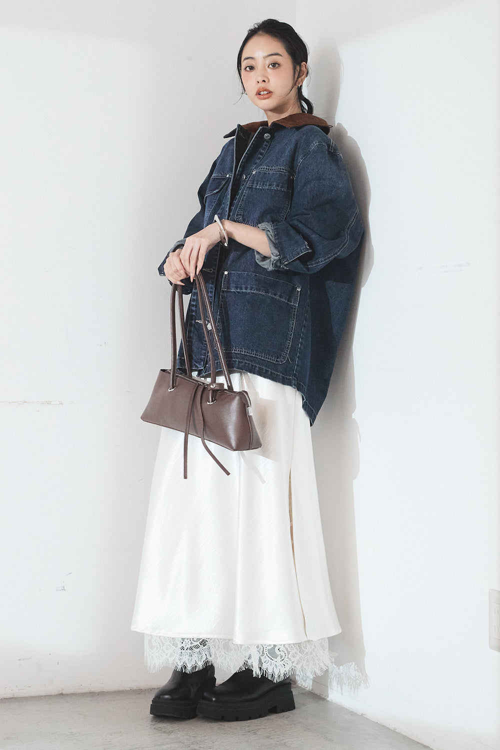 [SET]襟コーデュロイデニムカバーオール+裾レースデザインサテンスカート(2set)