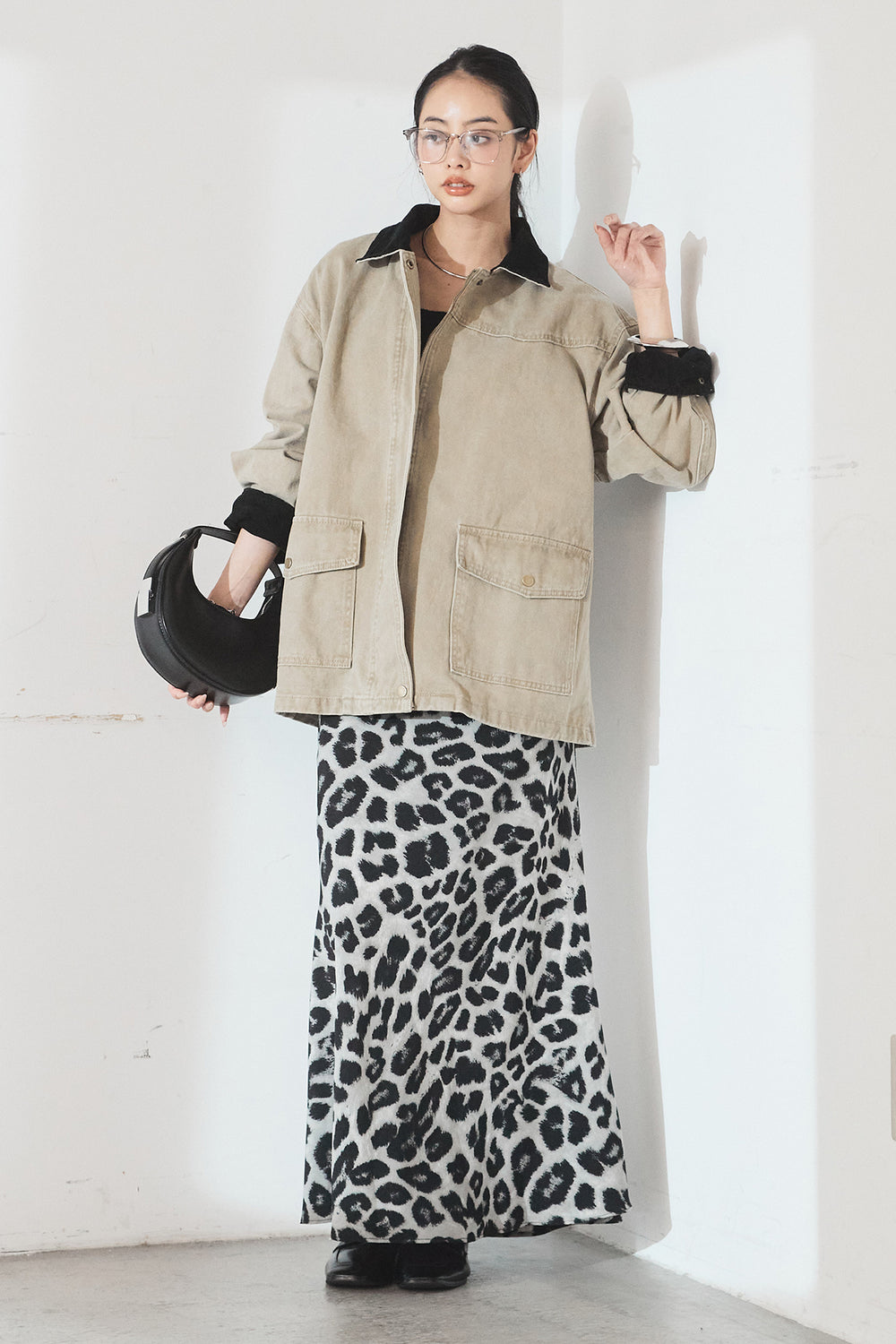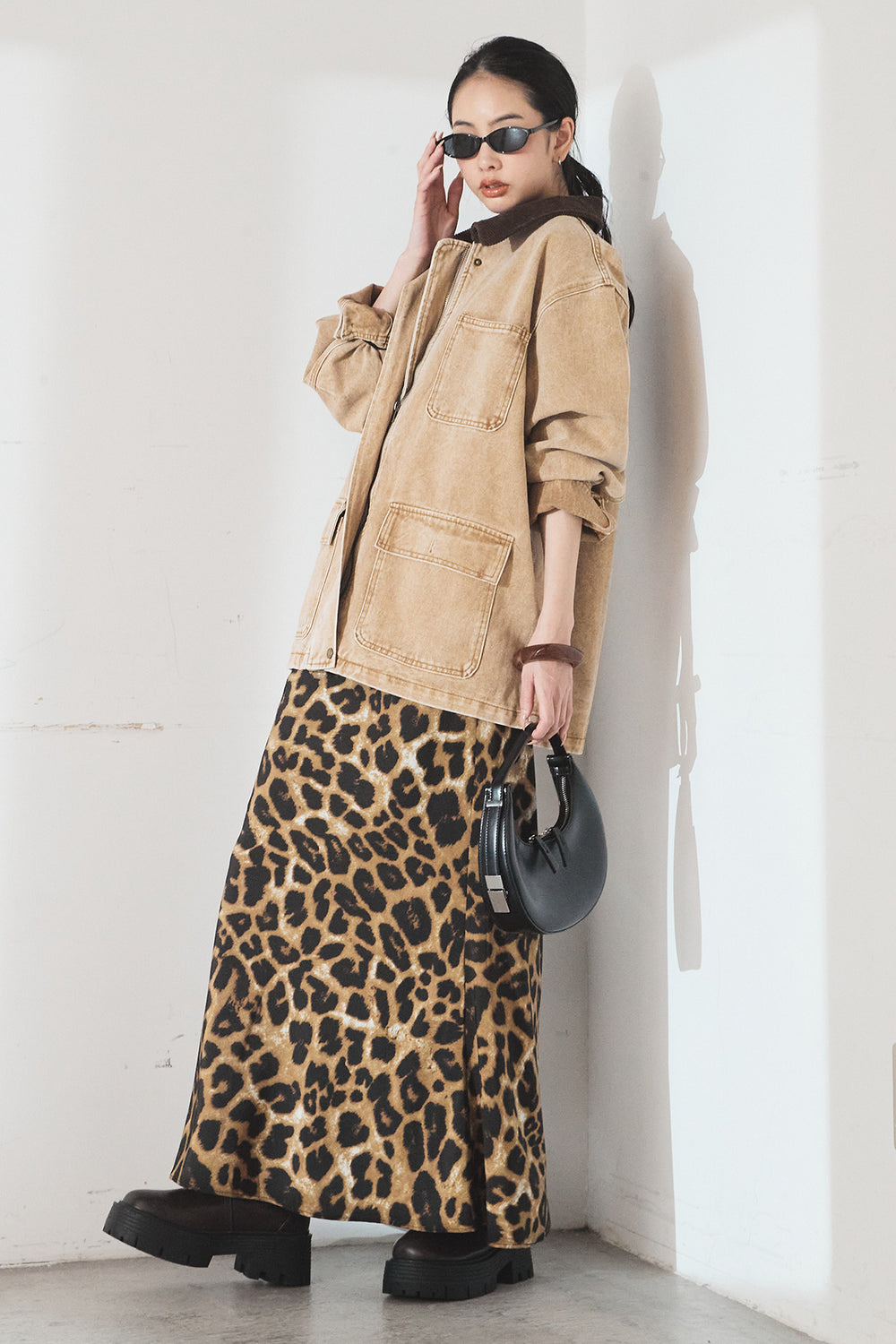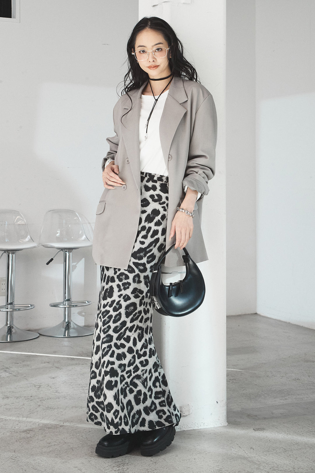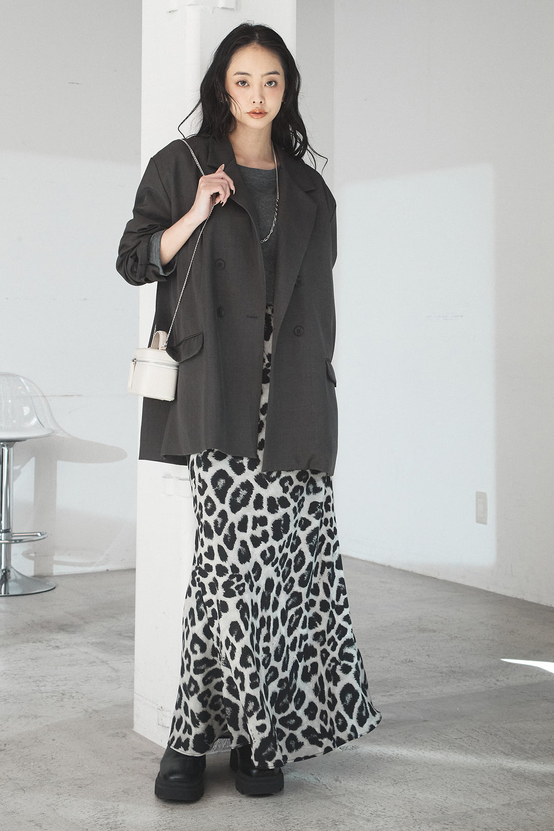 [SET]ルーズシルエットダブルテーラードジャケット+ストレッチロングTシャツ+レオパードサテンナロースカート(3set)