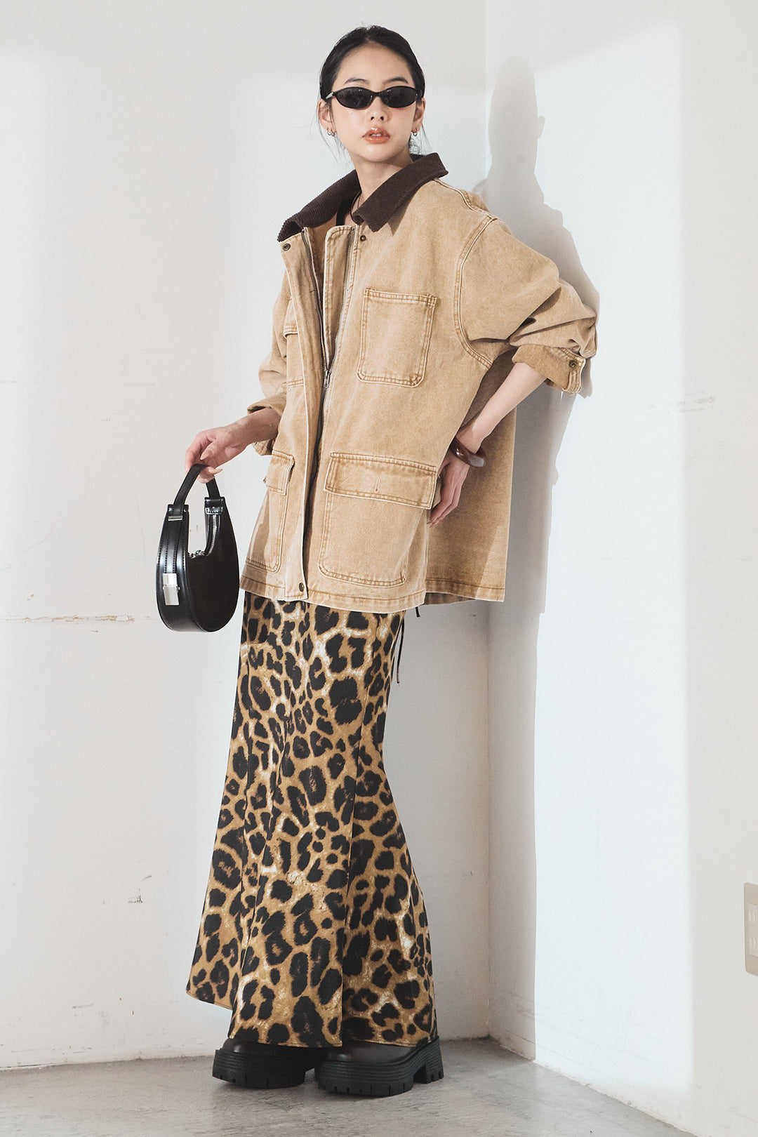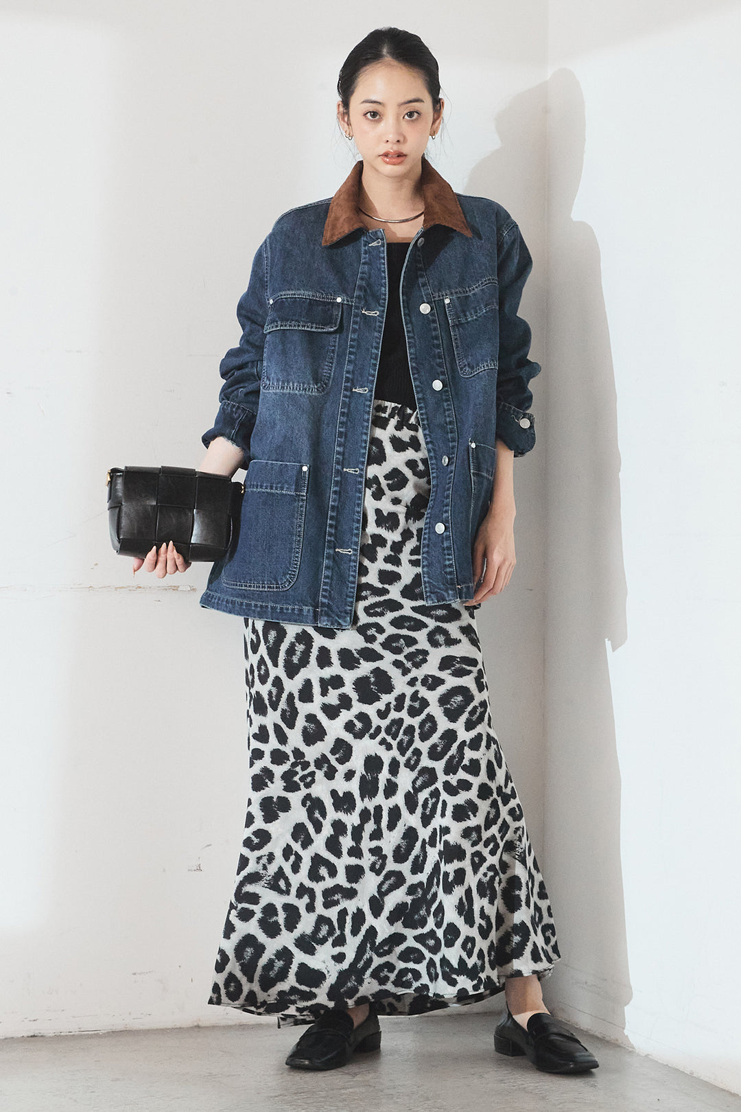 [SET]襟コーデュロイデニムカバーオール+レオパードサテンナロースカート(2set)