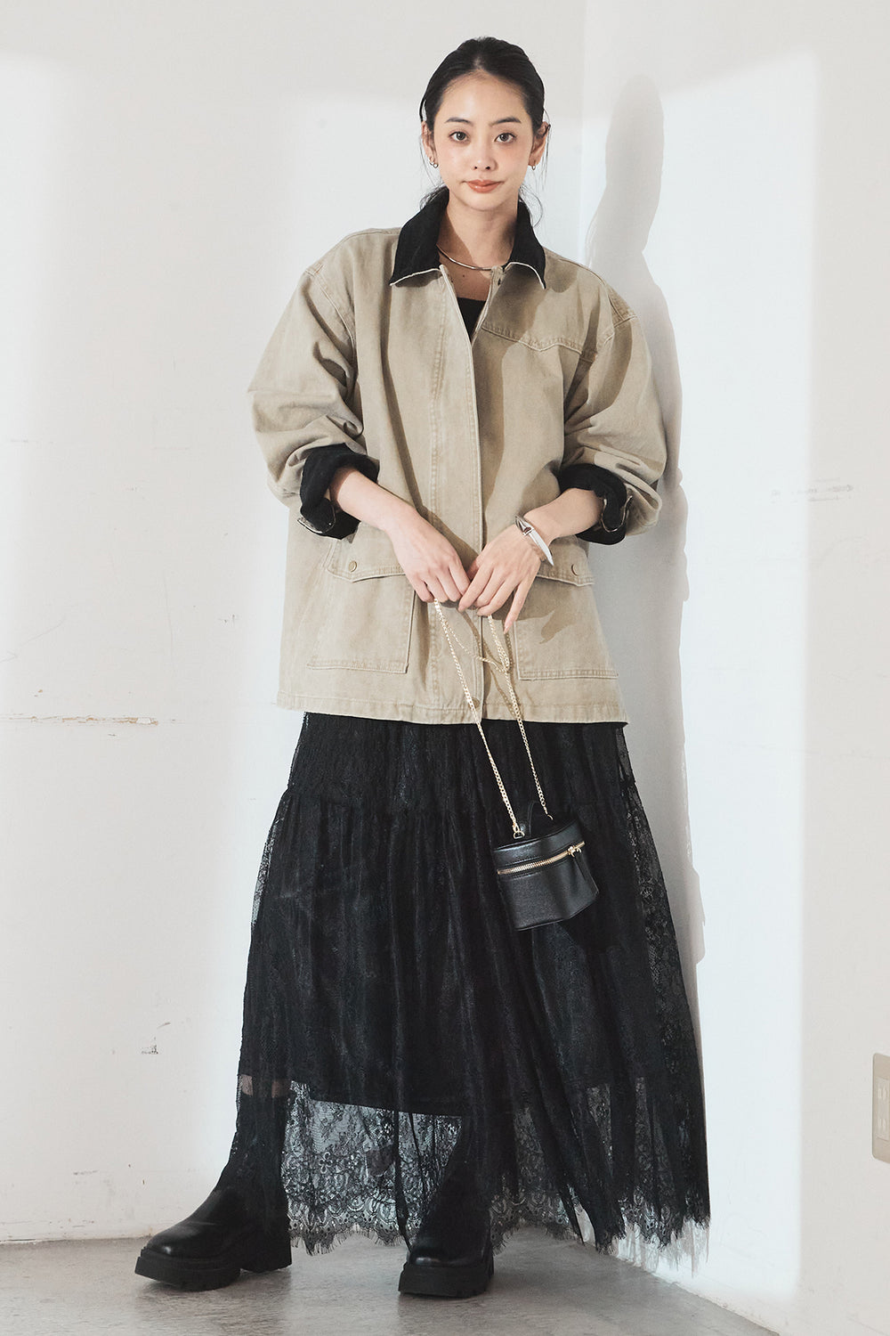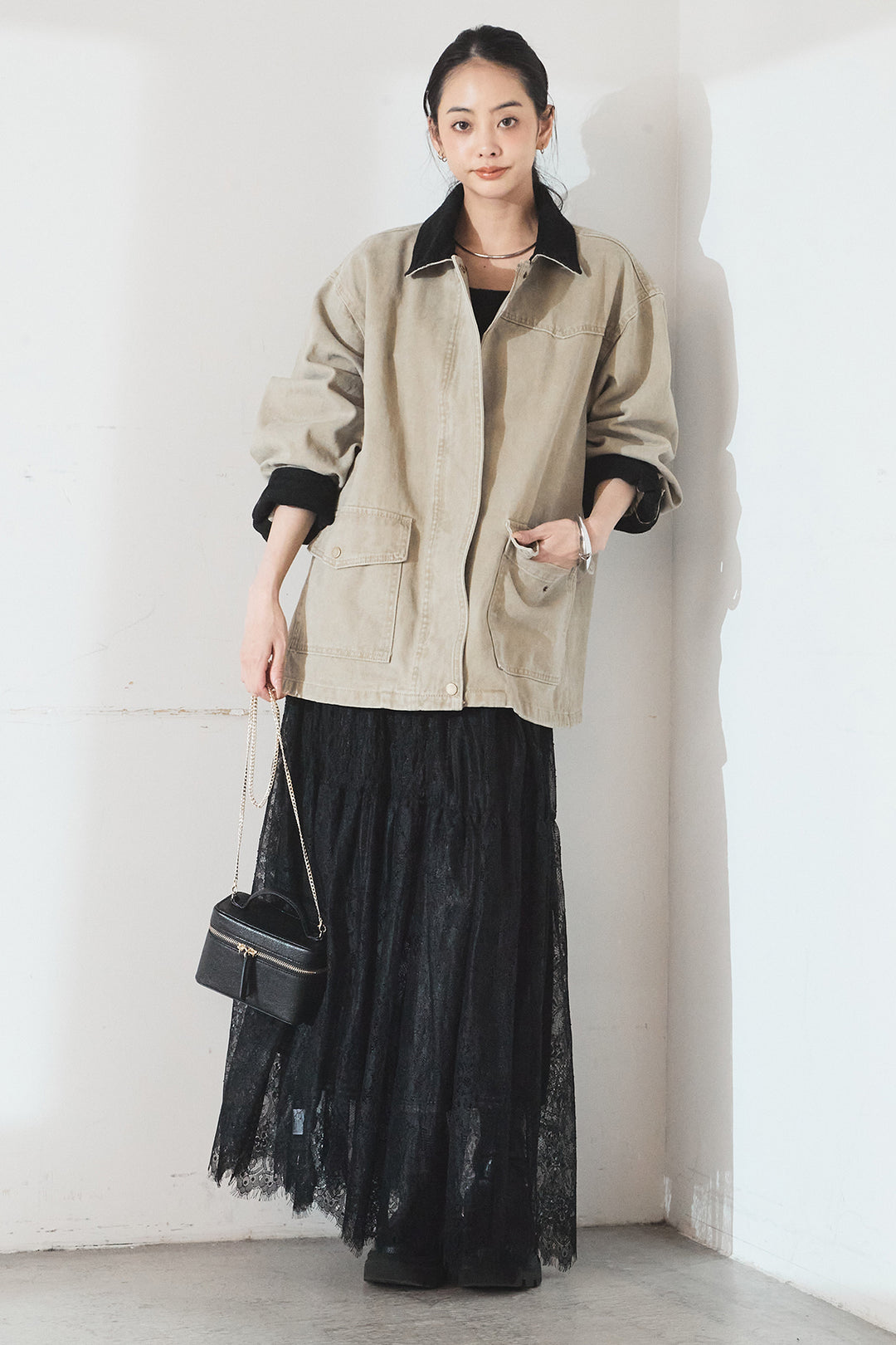 [SET]襟コーデュロイジップデニム調カバーオール+ひげレース切替ロング丈スカート(2set)