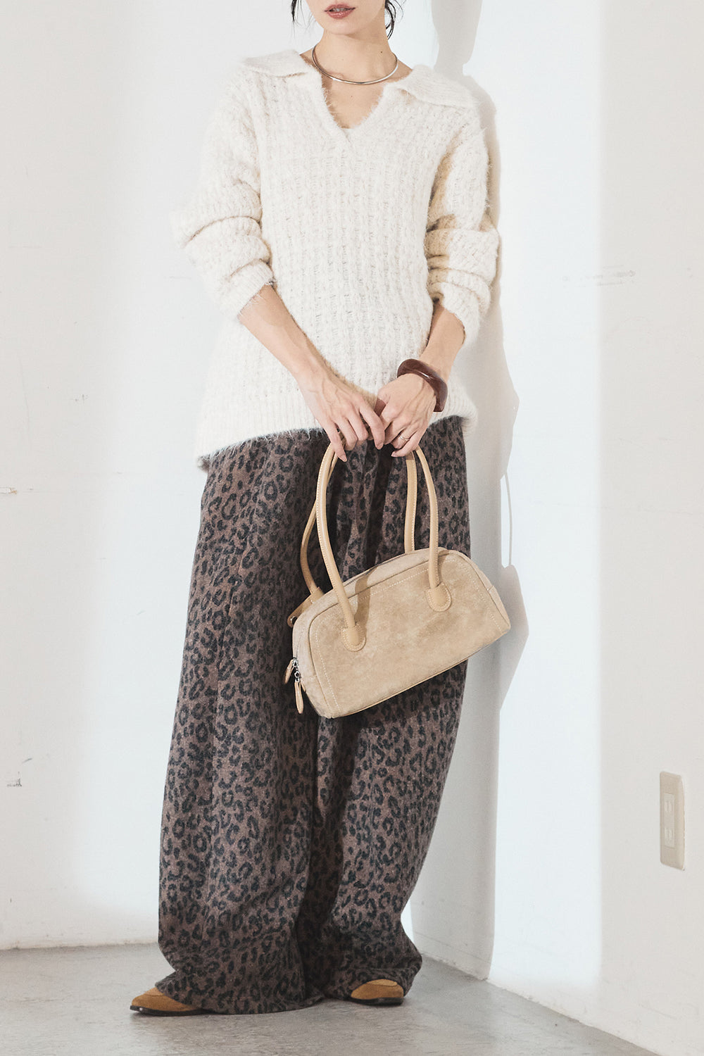 [SET]襟付きVネックニットトップス+リラックスレオパード柄ワイドパンツ(2set)
