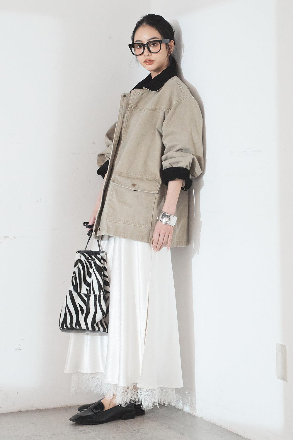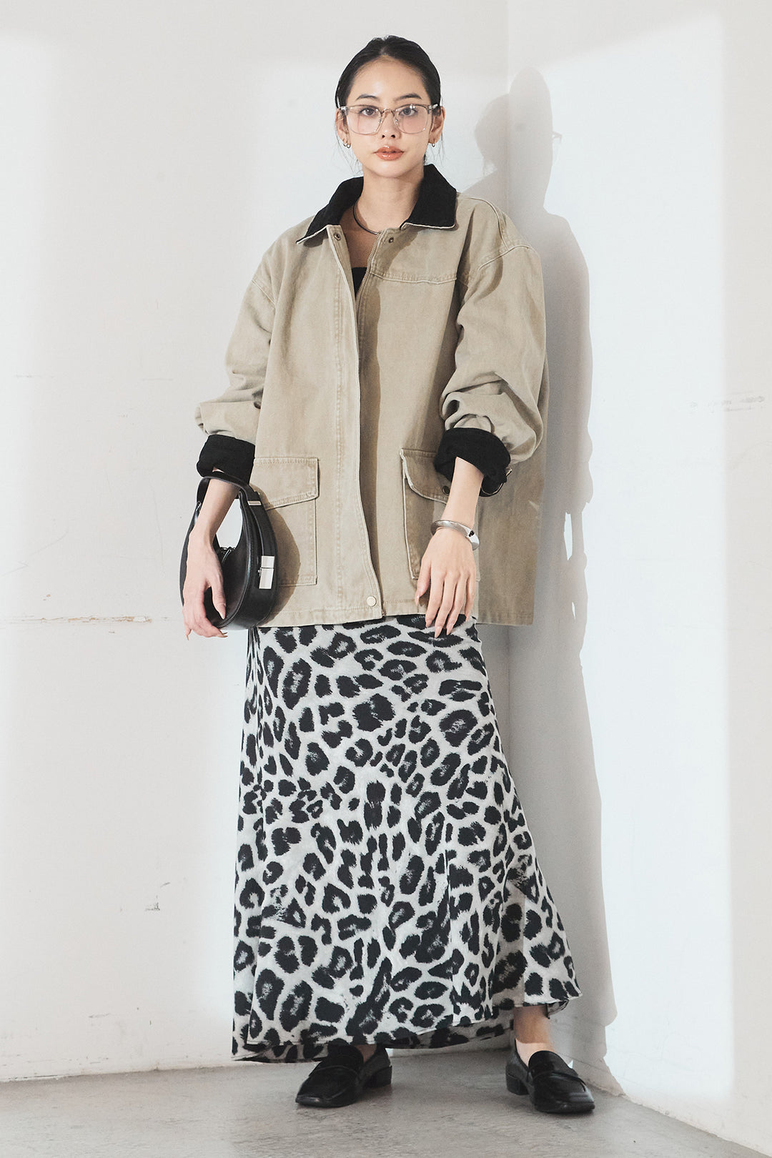 [SET]ルーズシルエットダブルテーラードジャケット+レオパードサテンナロースカート(2set)