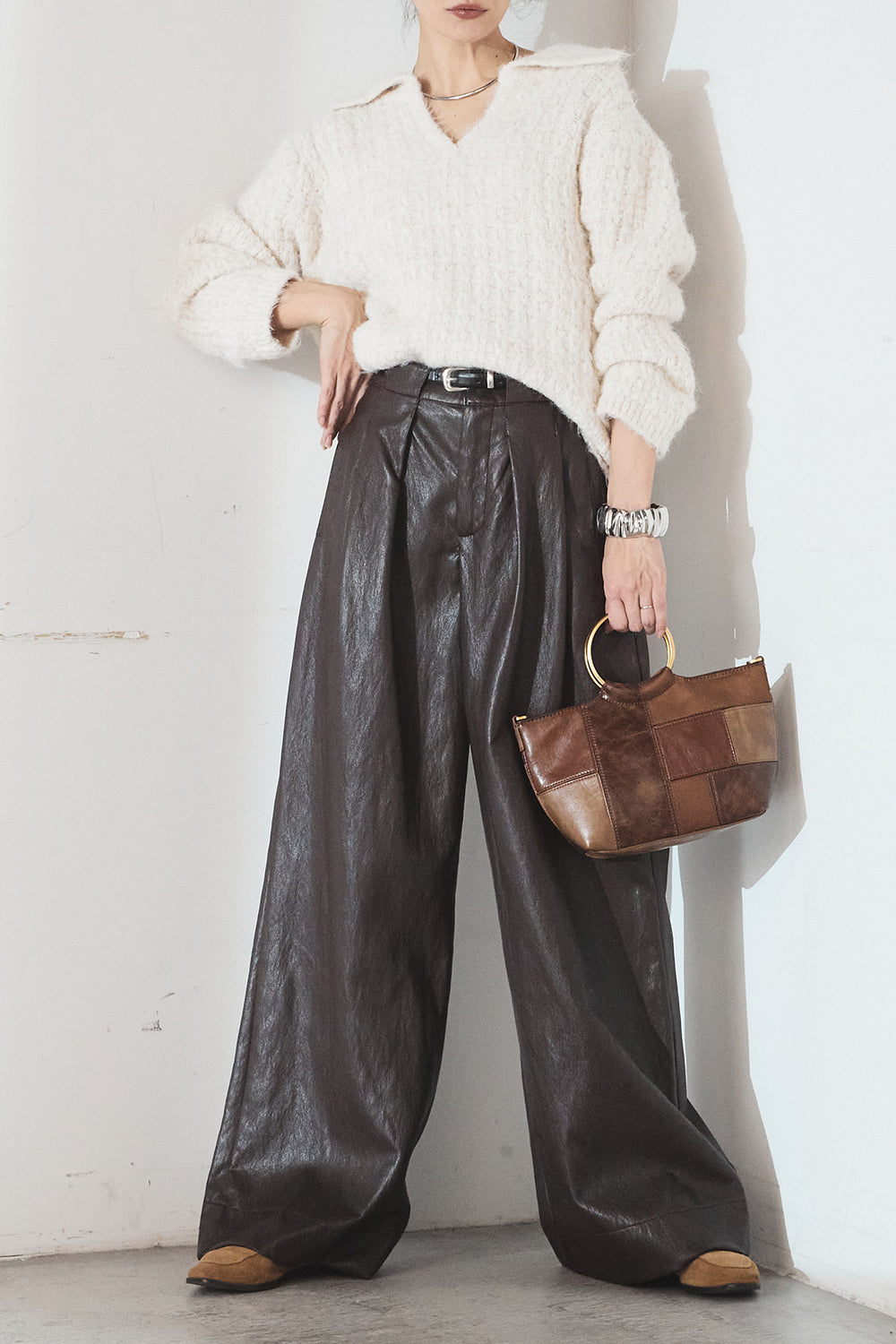 [SET]襟付きVネックニットトップス+ベルト付きレザーライクタックパンツ(2set)