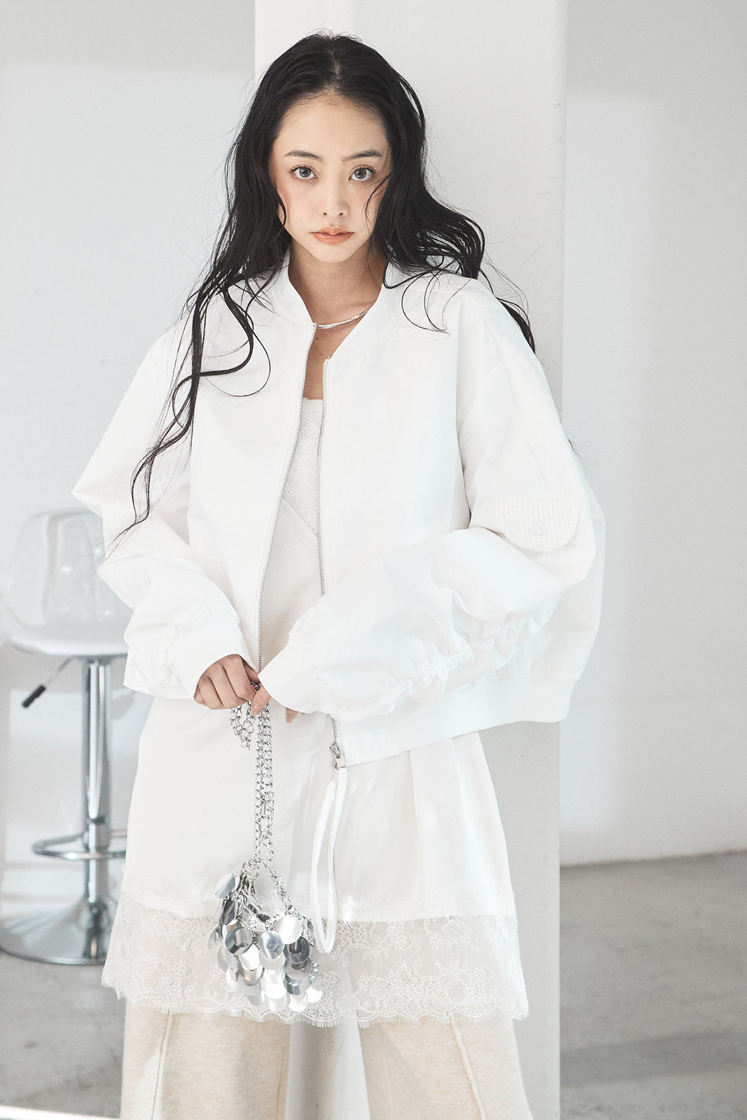 [SET]袖ギャザーデザインブルゾン+レース切り替えキャミソール(2set)