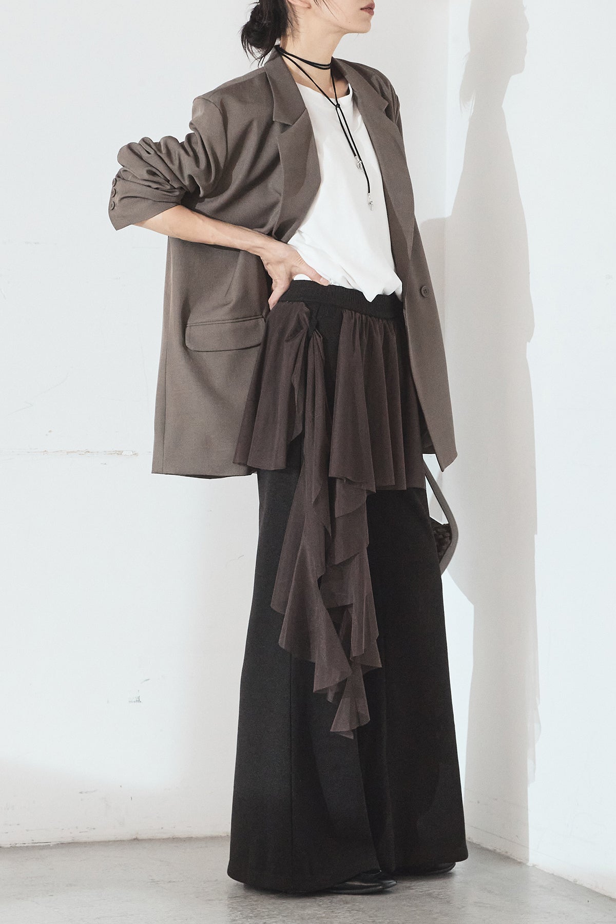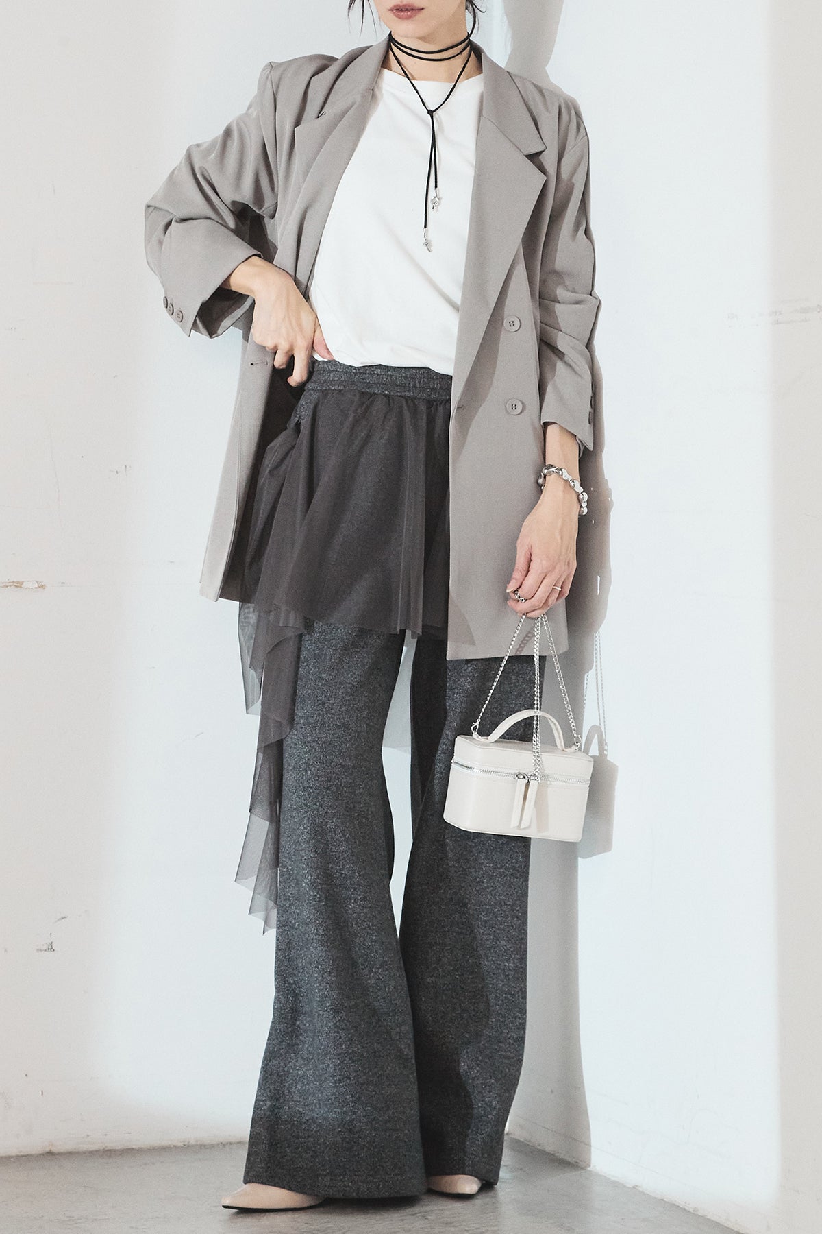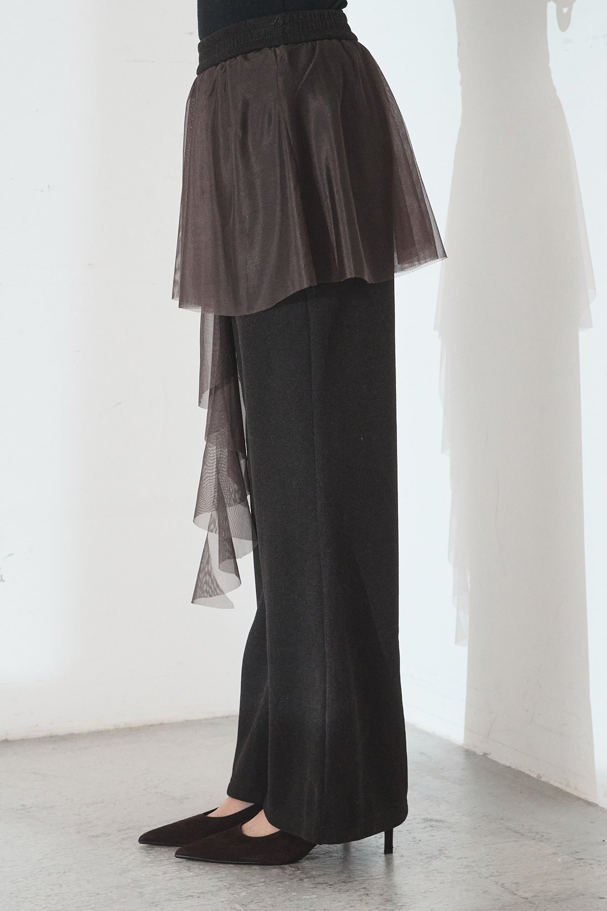 ニットパンツにチュールを重ねた、レイヤードデザインが目を引く一本。柔らかなニット素材に軽やかなチュールを合わせることで、甘さとモード感をバランスよく表現しています。縦に落ちるシルエットが脚のラインをすっきりと見せ、動くたびに表情の変化を楽しめるのも魅力。シンプルなトップスを合わせるだけで、スタイリングに奥行きを添えてくれるアイテムです。