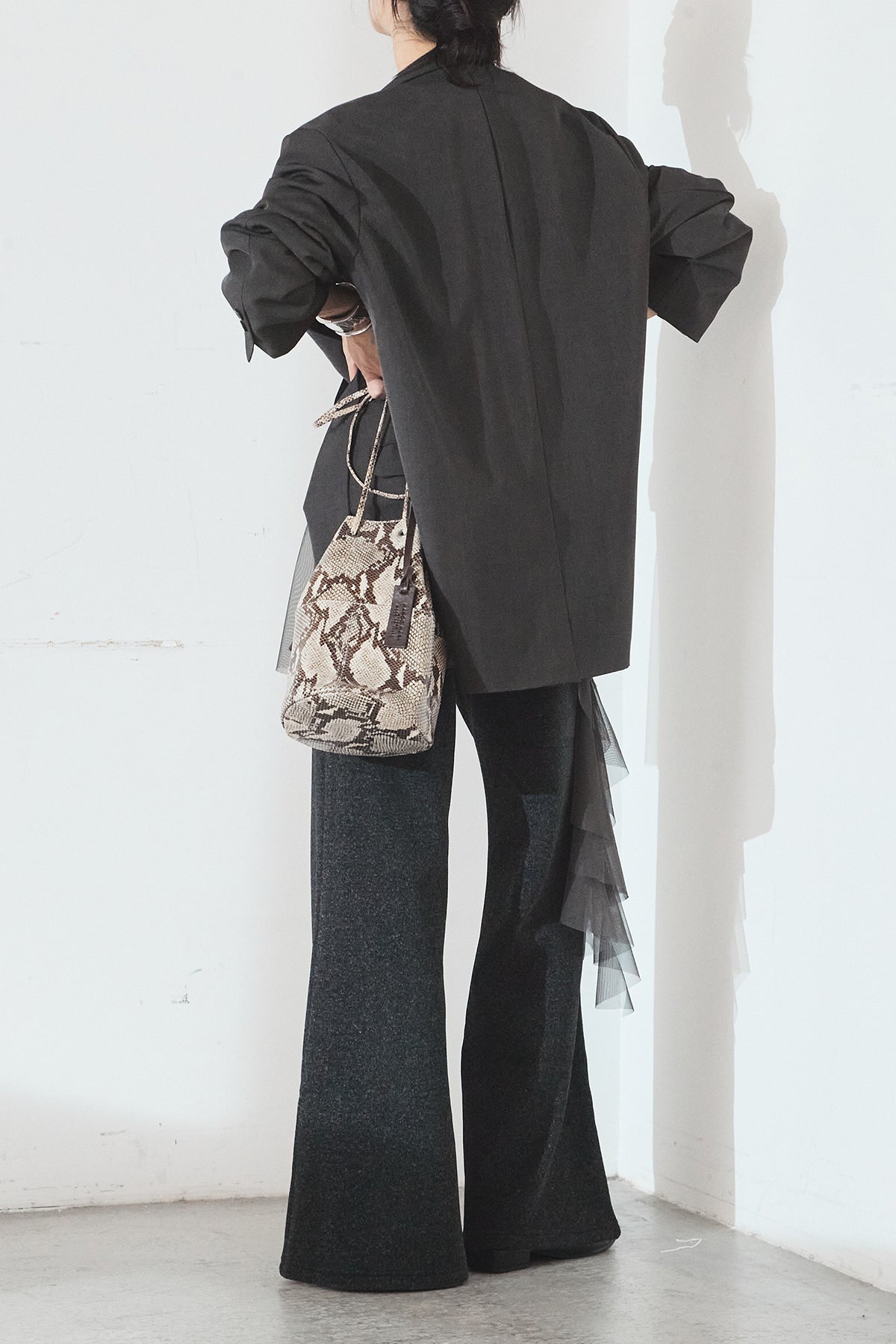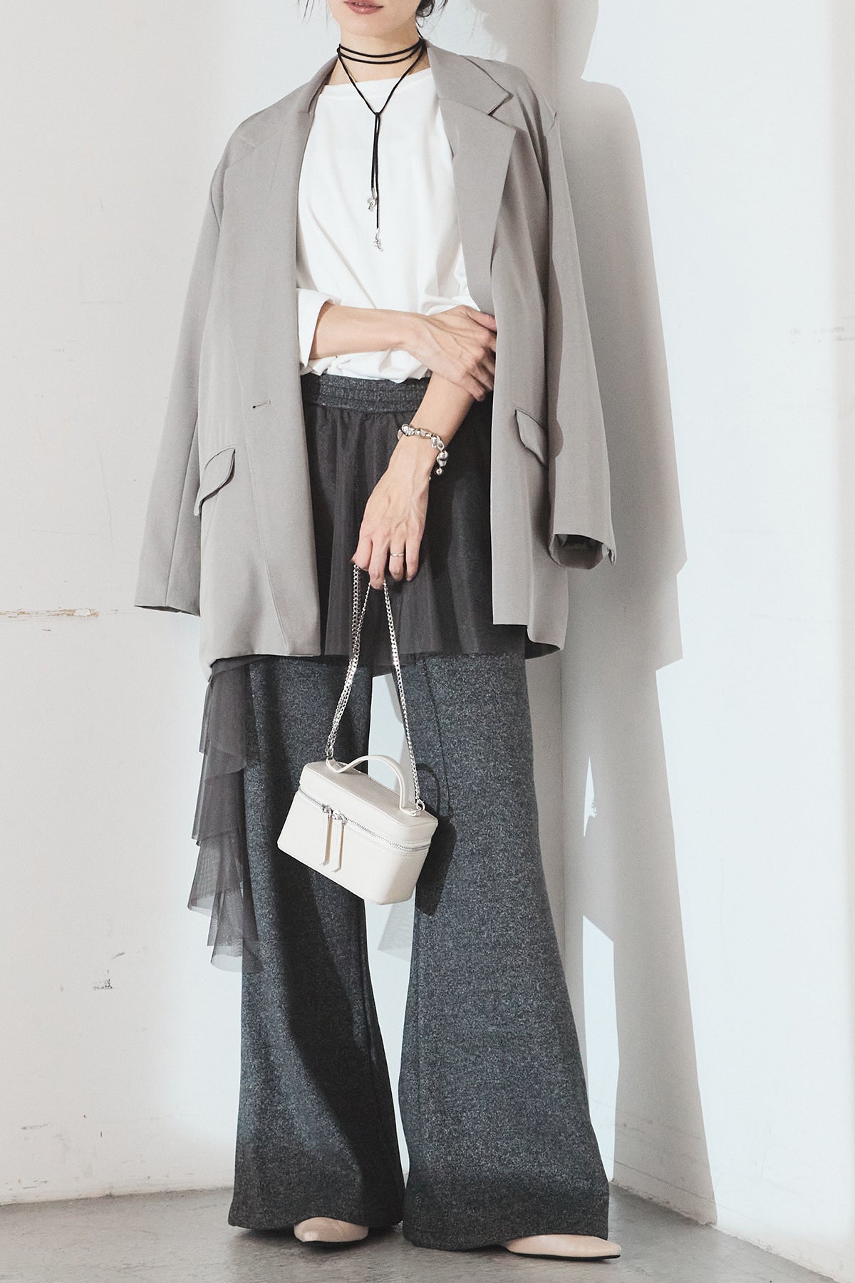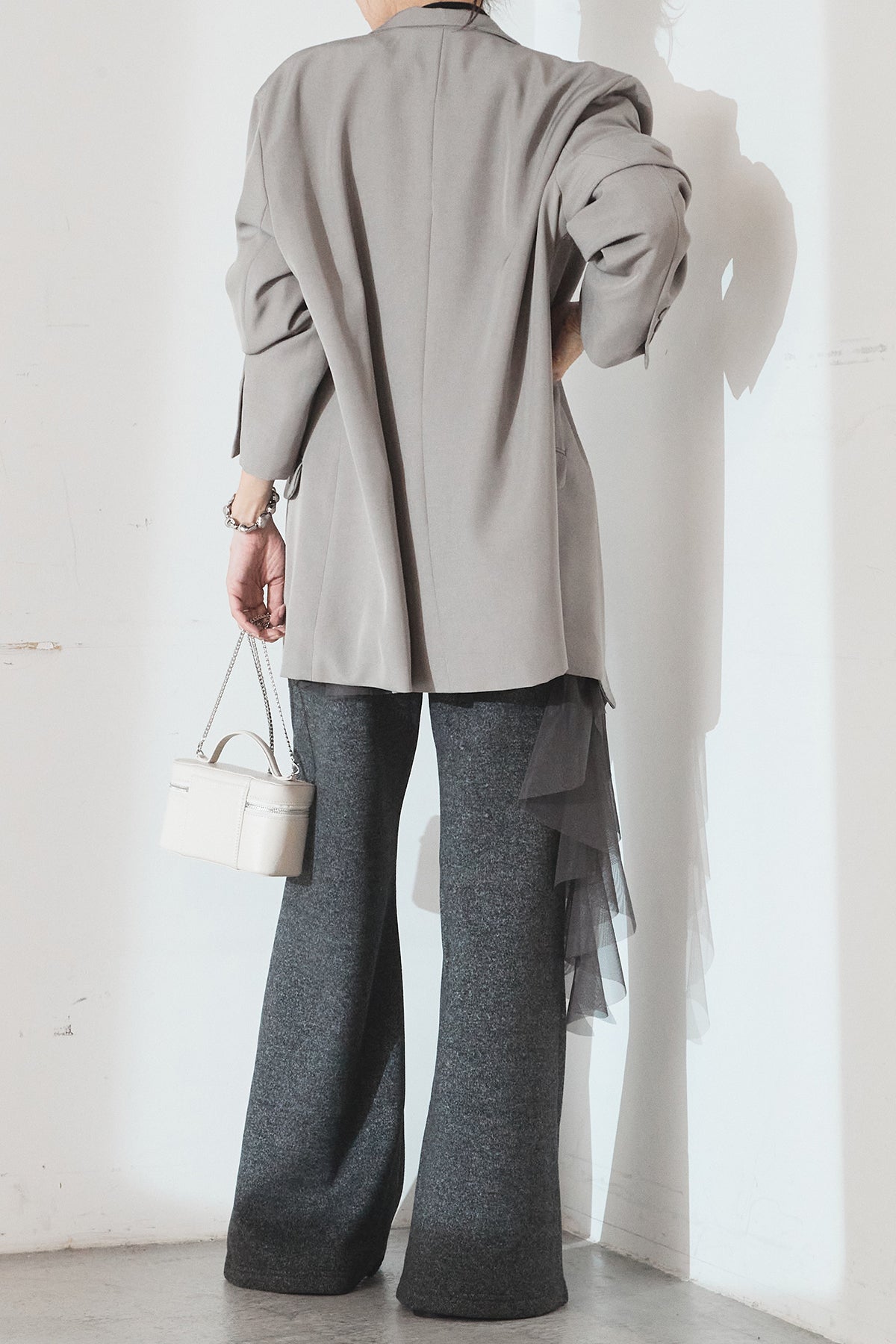 ニットパンツにチュールを重ねた、レイヤードデザインが目を引く一本。柔らかなニット素材に軽やかなチュールを合わせることで、甘さとモード感をバランスよく表現しています。縦に落ちるシルエットが脚のラインをすっきりと見せ、動くたびに表情の変化を楽しめるのも魅力。シンプルなトップスを合わせるだけで、スタイリングに奥行きを添えてくれるアイテムです。