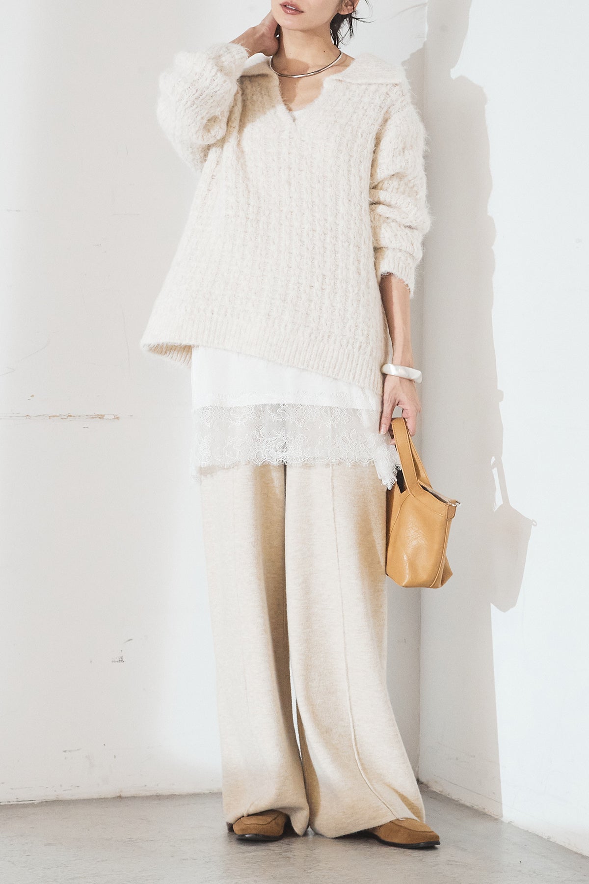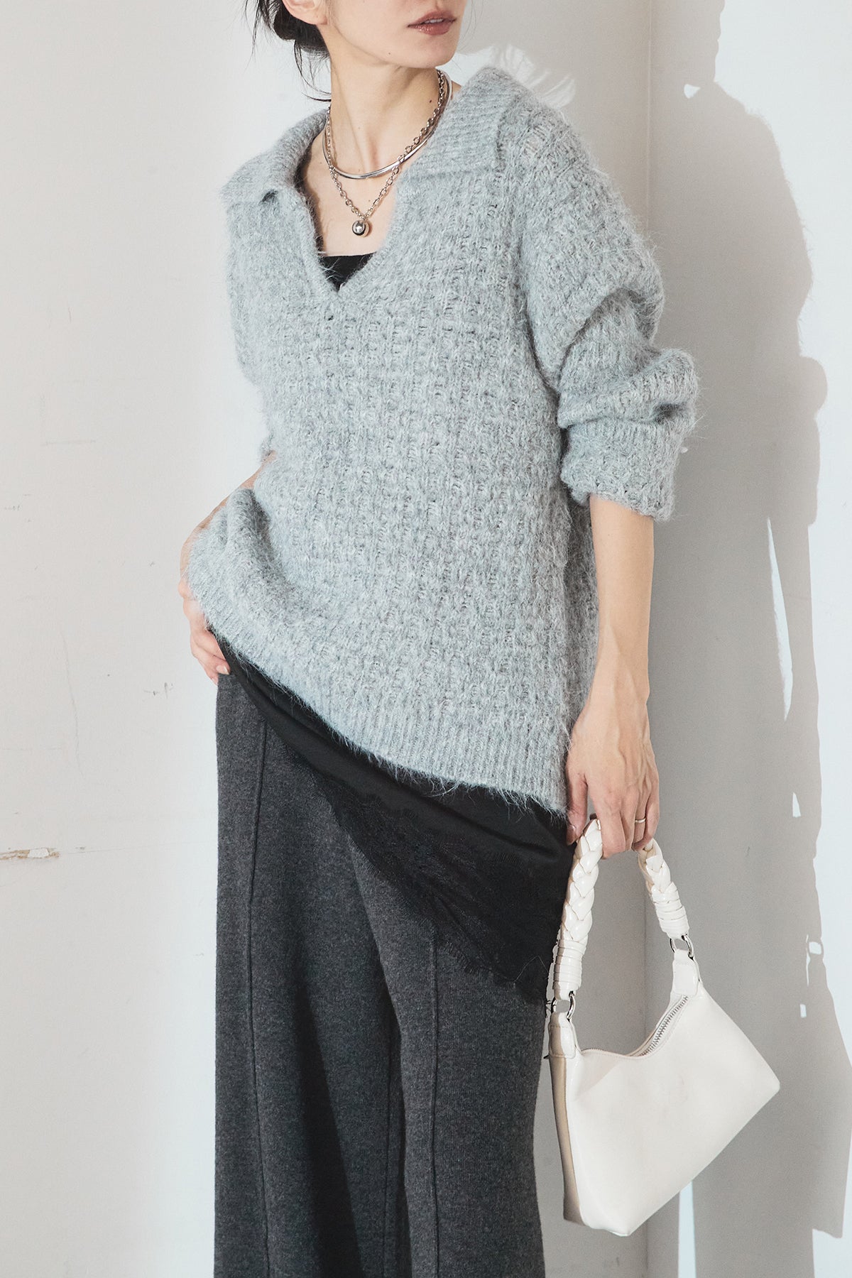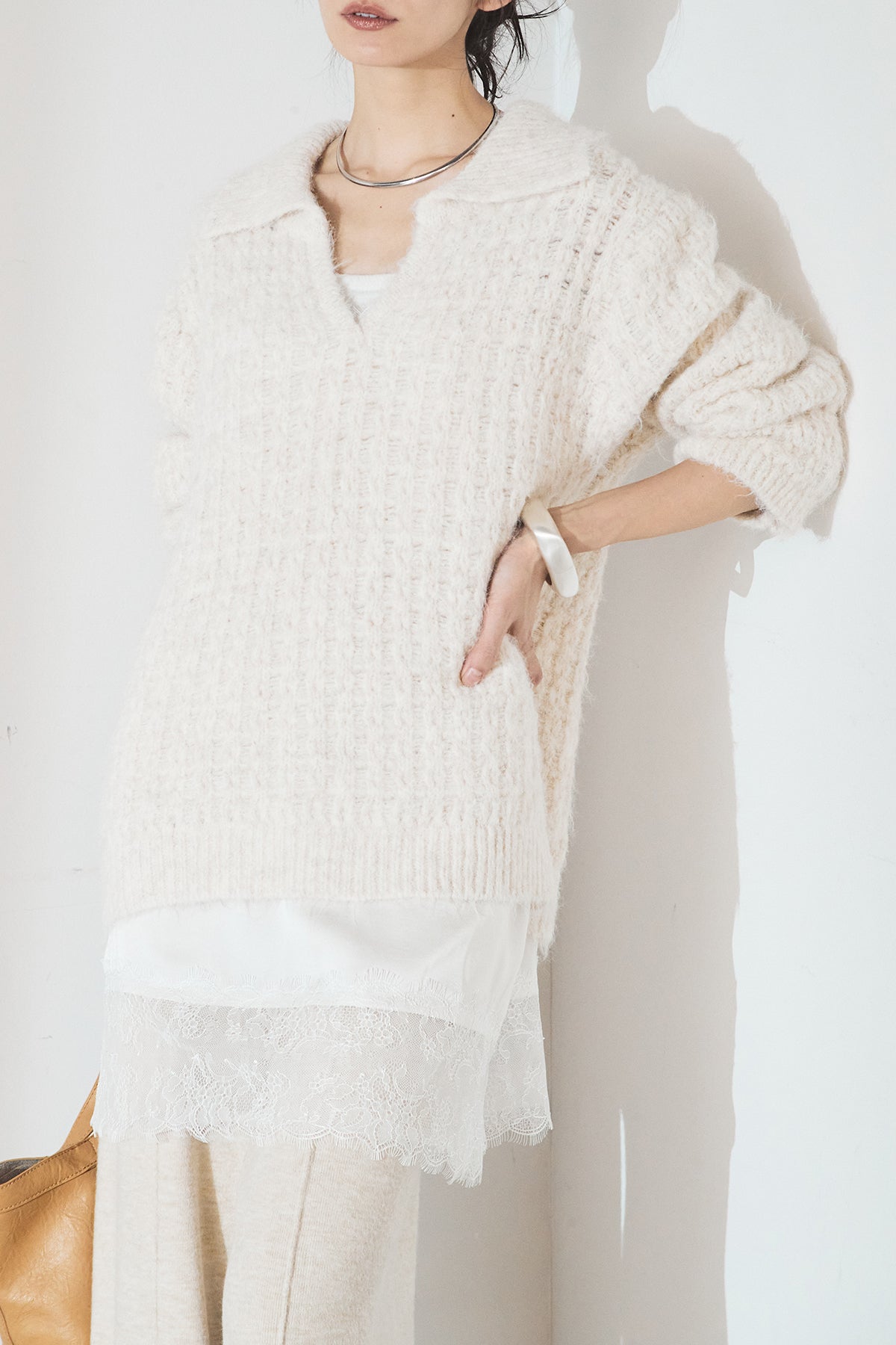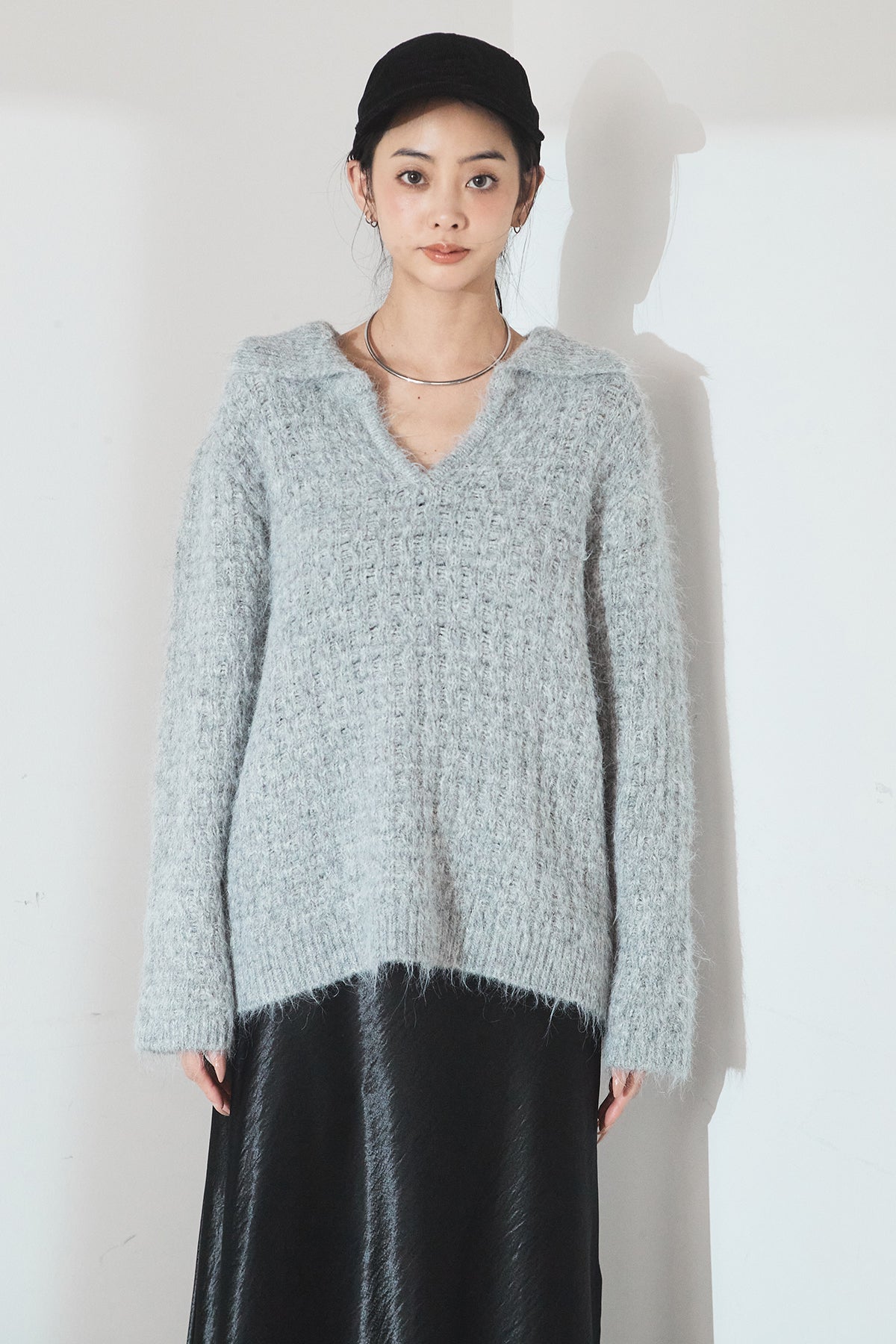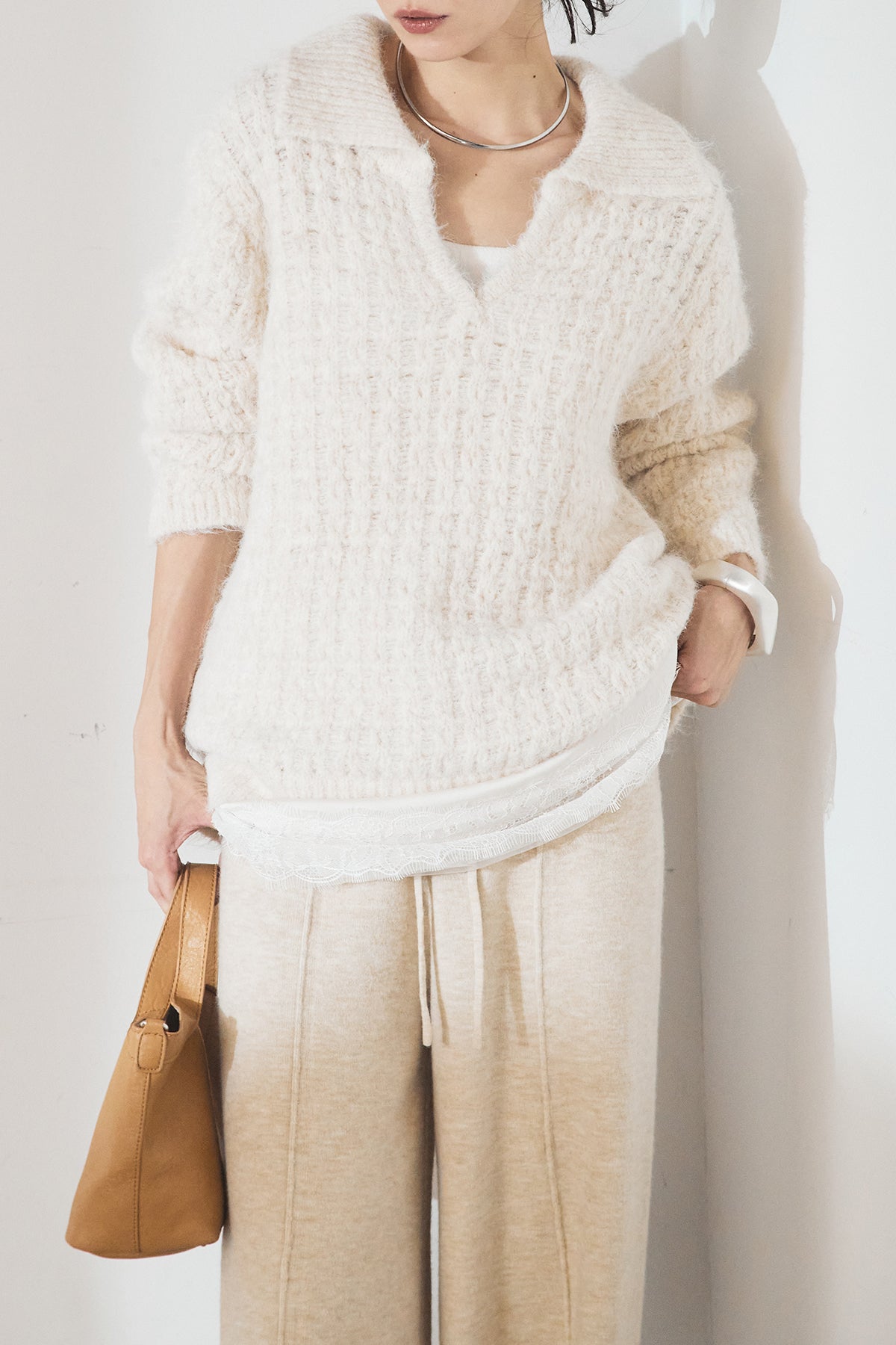 柔らかな風合いのニットに、襟付きのVネックデザインを取り入れたトップス。程よく開いたVラインが顔まわりをすっきり見せ、きちんと感と抜け感を両立します。ゆとりのあるシルエットでリラックスした着心地ながら、上品な印象に仕上がるのも魅力。パンツにもスカートにも合わせやすく、デイリーに活躍する一枚です。