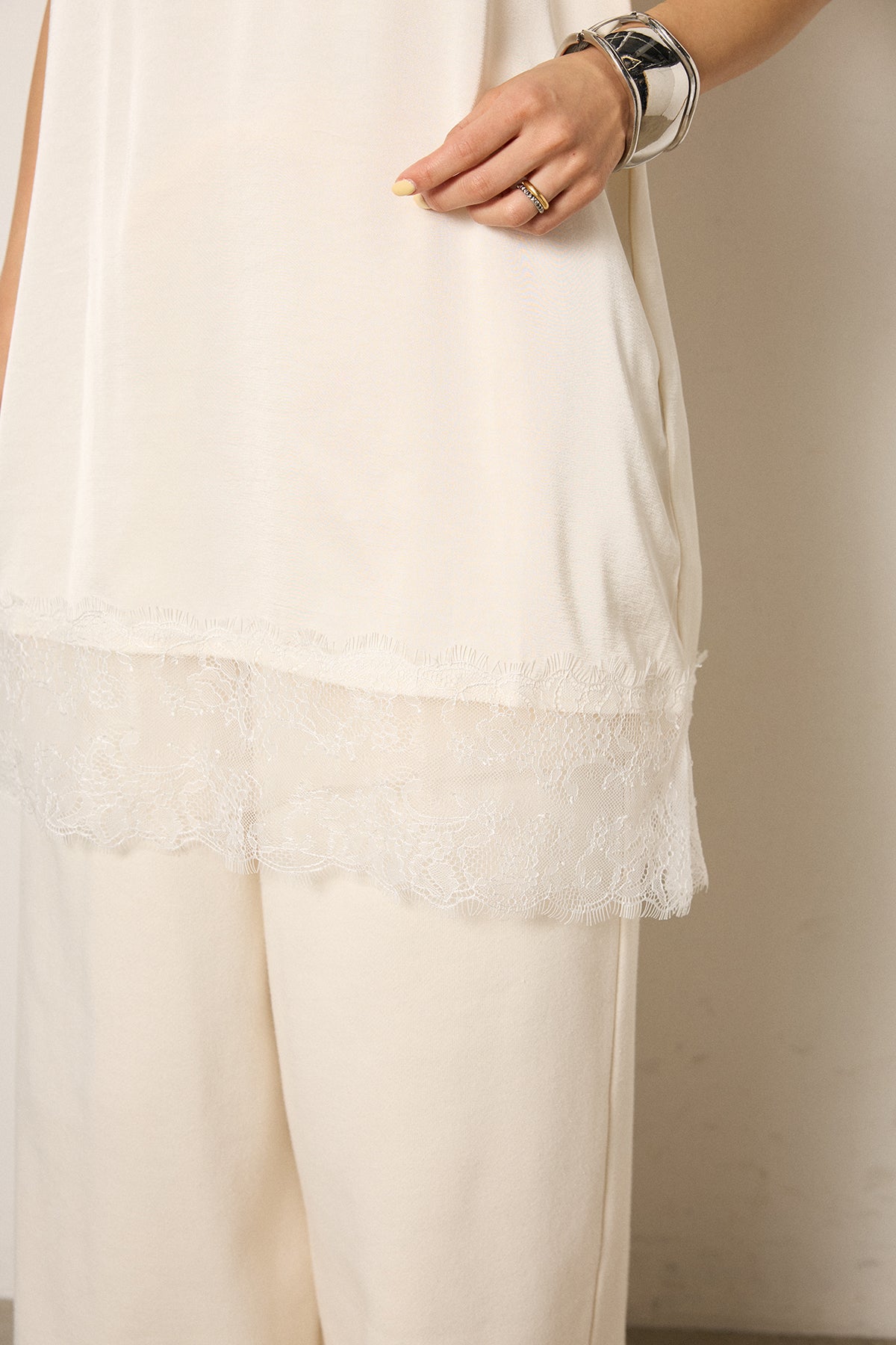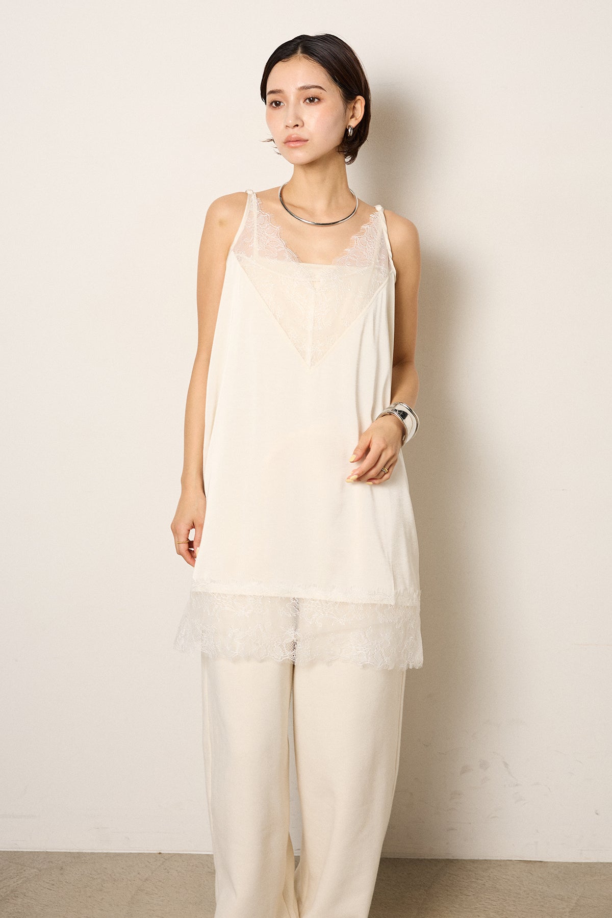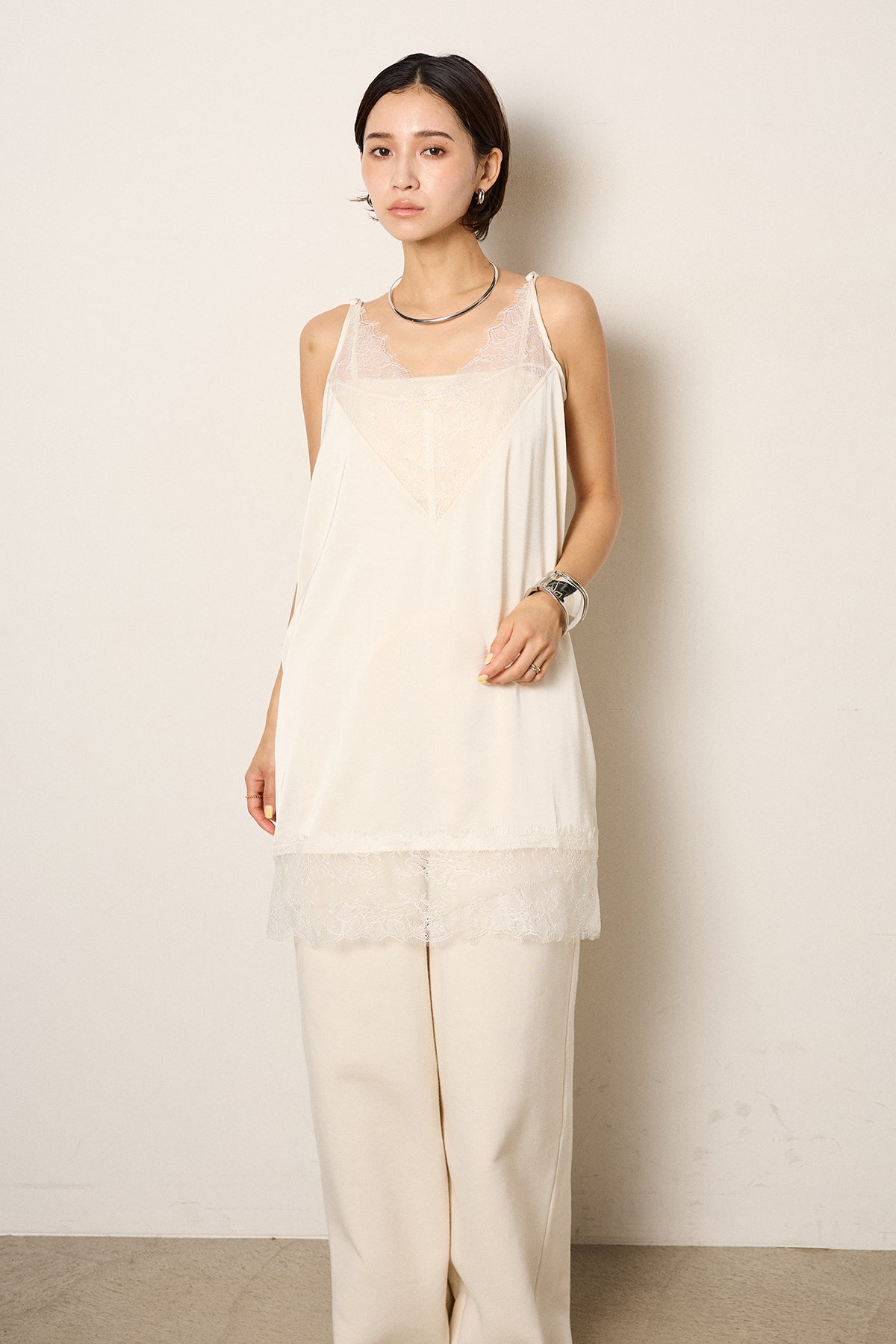 繊細なレースを切り替えたキャミソールデザイン。ほどよい透け感と流れるような落ち感が、軽やかなレイヤードスタイルをつくります。長めの着丈で安心感があり、ニットやスウェットの裾から覗かせてスタイリングのアクセントに。ワイドパンツやスカートとも馴染みやすく、普段の着こなしに取り入れるだけで新鮮なバランスに仕上がるアイテムです。