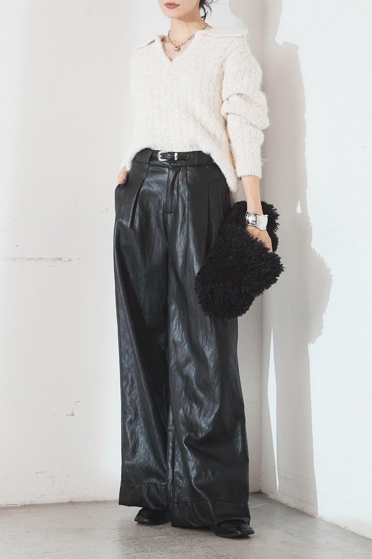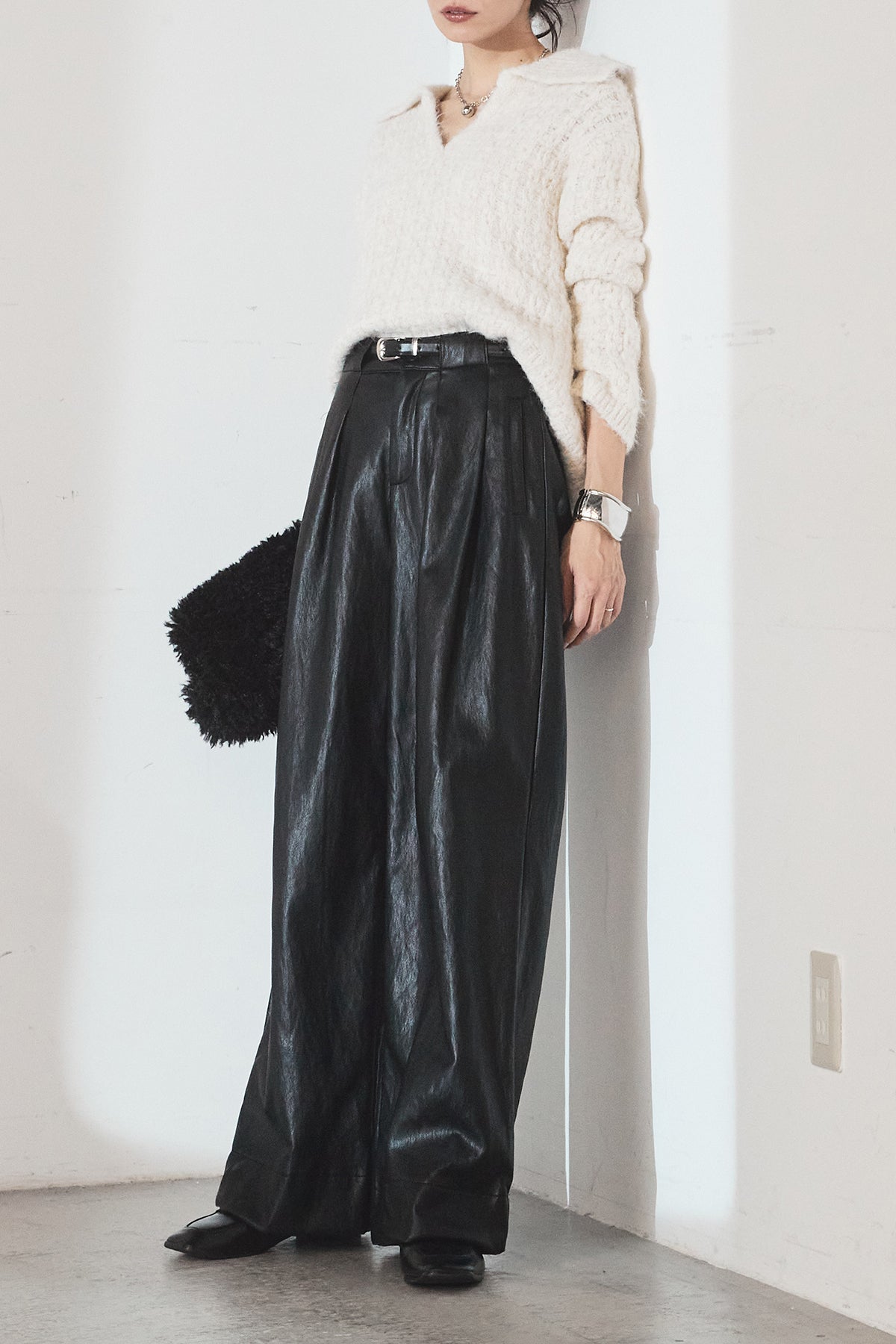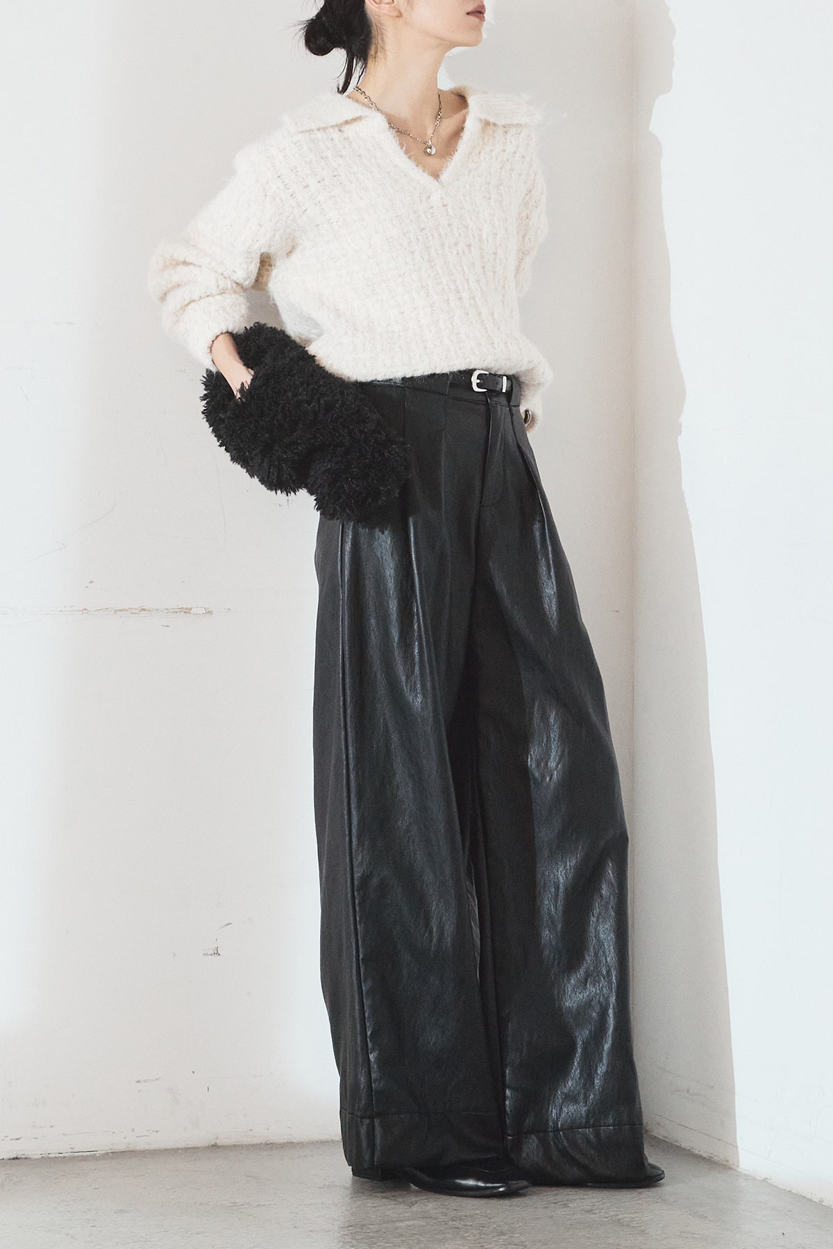 レザーライク素材で仕上げたタック入りパンツ。 ウエストまわりに程よいゆとりがあり、すっきりとしたバランスで着用できます。 付属ベルト付きで、トップスをインしたスタイルもまとまりやすい一本。 シンプルな合わせでもコーデに表情が出やすく、普段使いから外出まで幅広く活躍します。