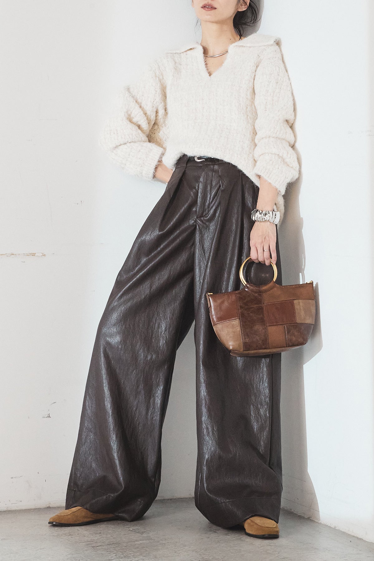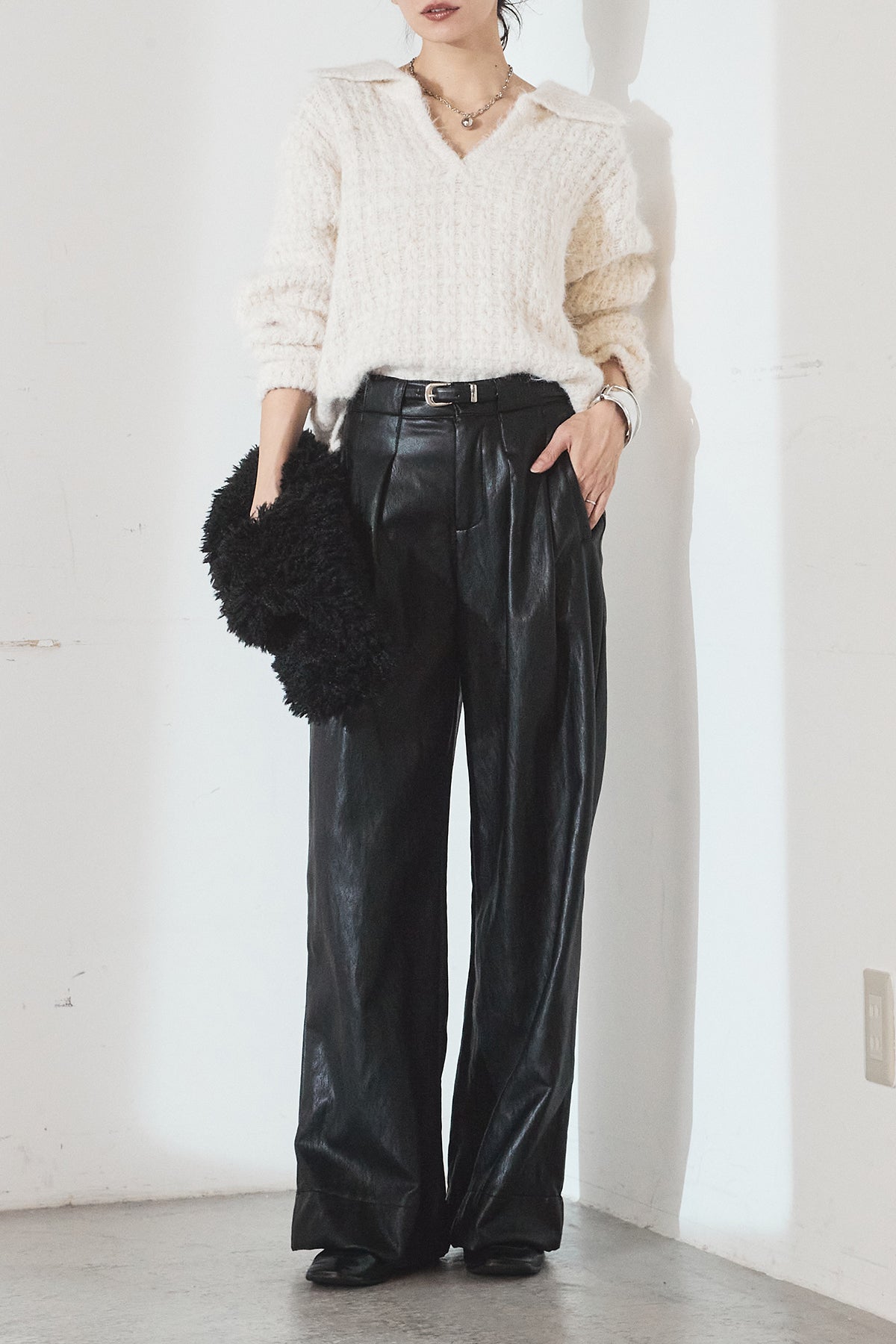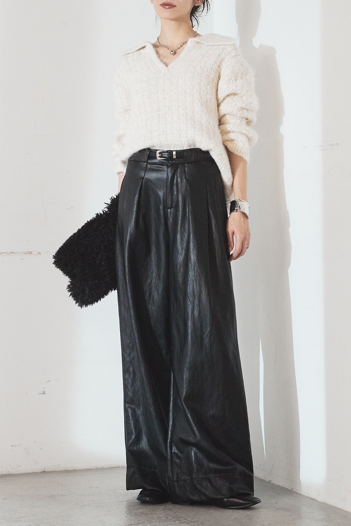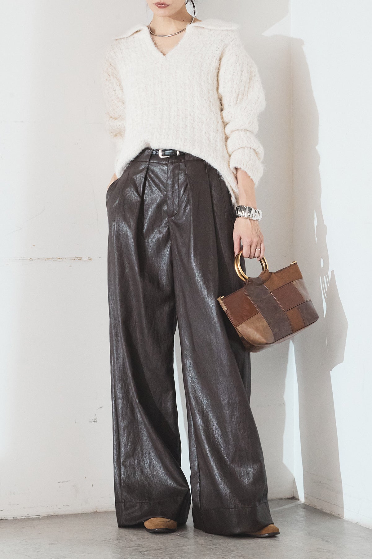 レザーライク素材で仕上げたタック入りパンツ。 ウエストまわりに程よいゆとりがあり、すっきりとしたバランスで着用できます。 付属ベルト付きで、トップスをインしたスタイルもまとまりやすい一本。 シンプルな合わせでもコーデに表情が出やすく、普段使いから外出まで幅広く活躍します。