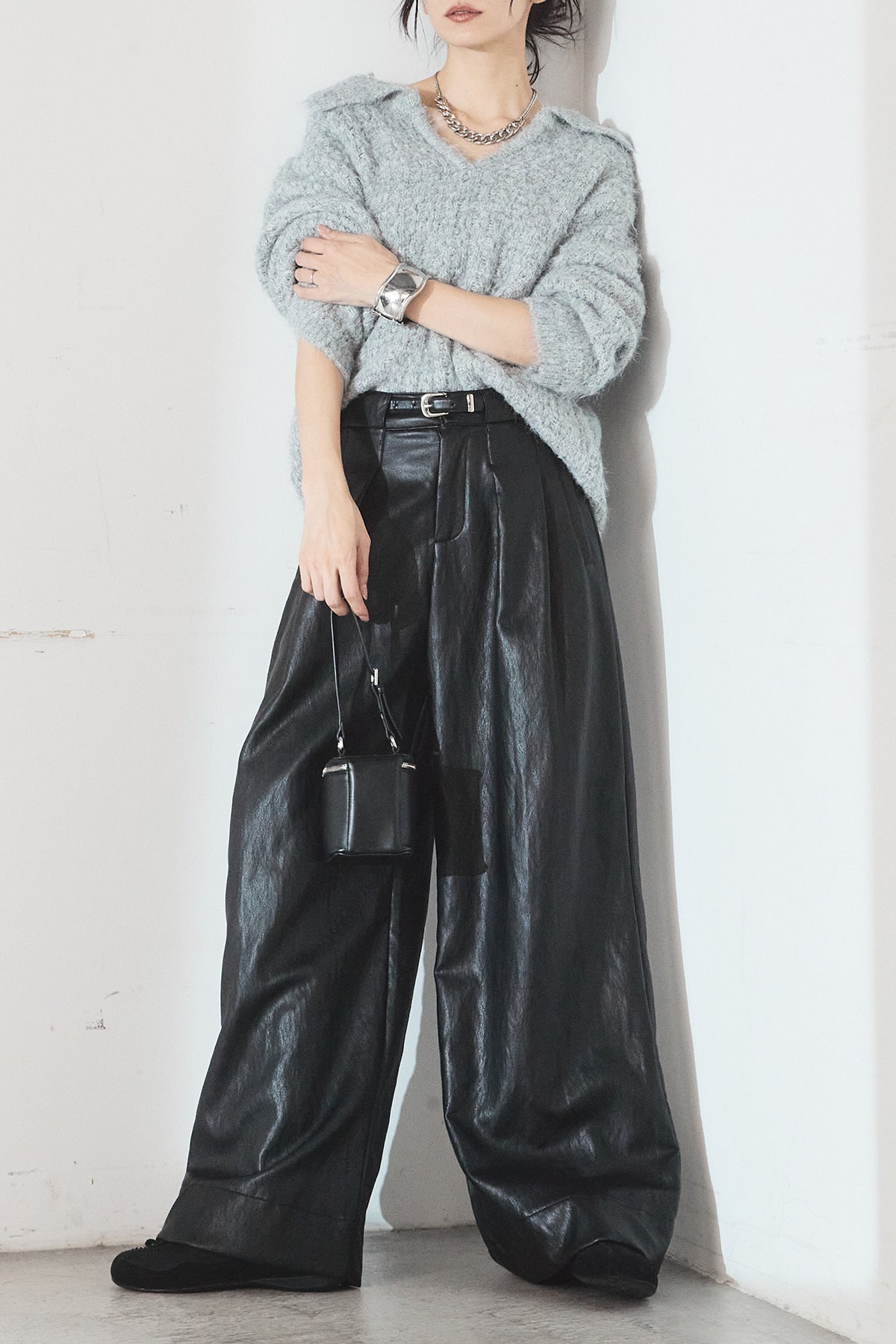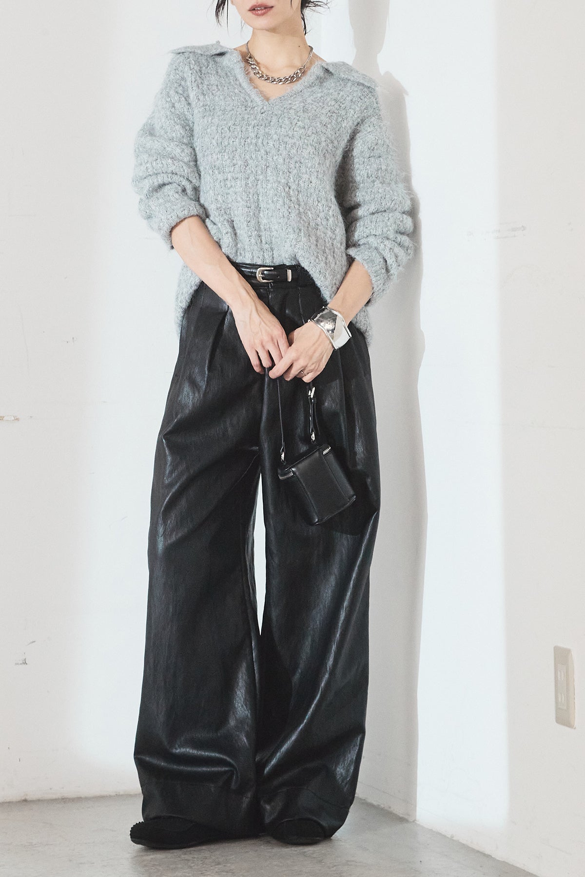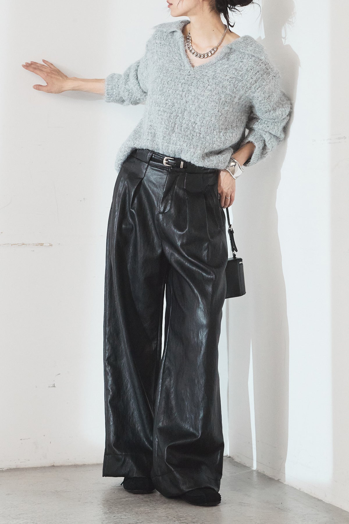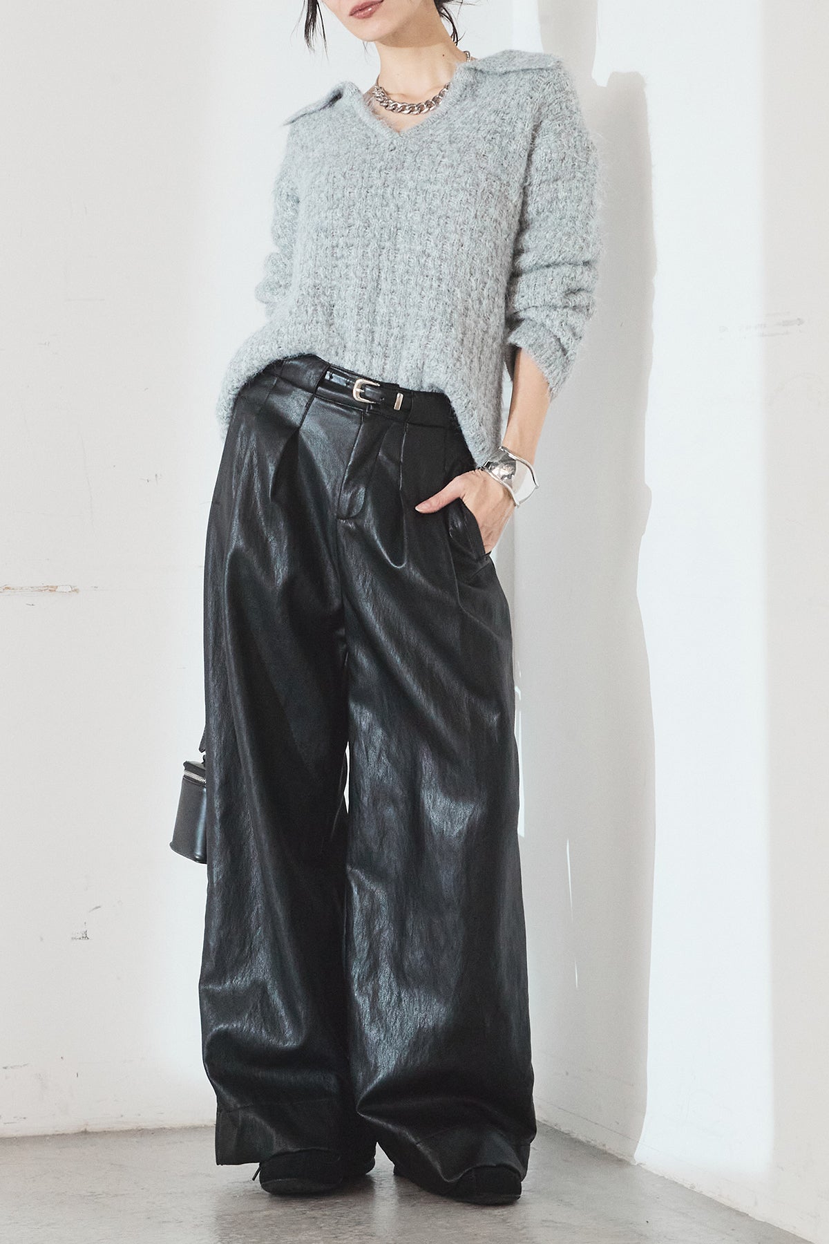 [SET]襟付きVネックニットトップス+ベルト付きレザーライクタックパンツ(2set)