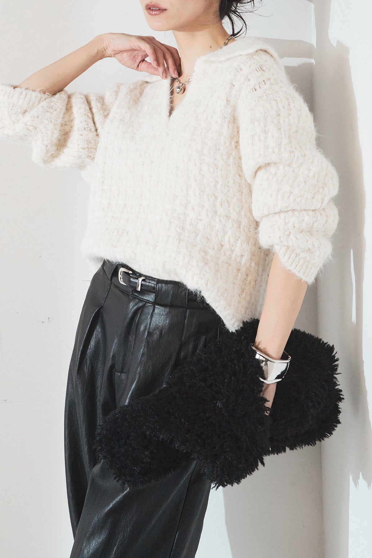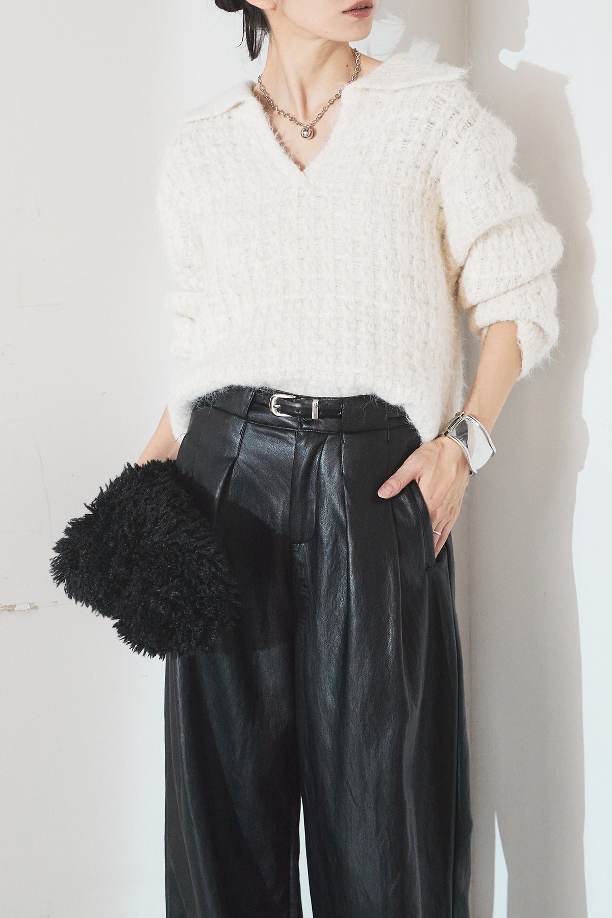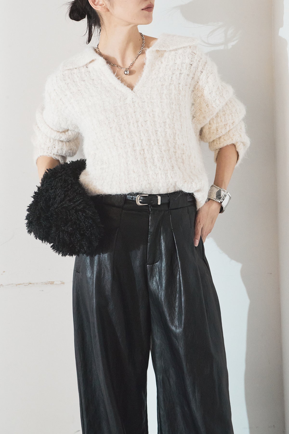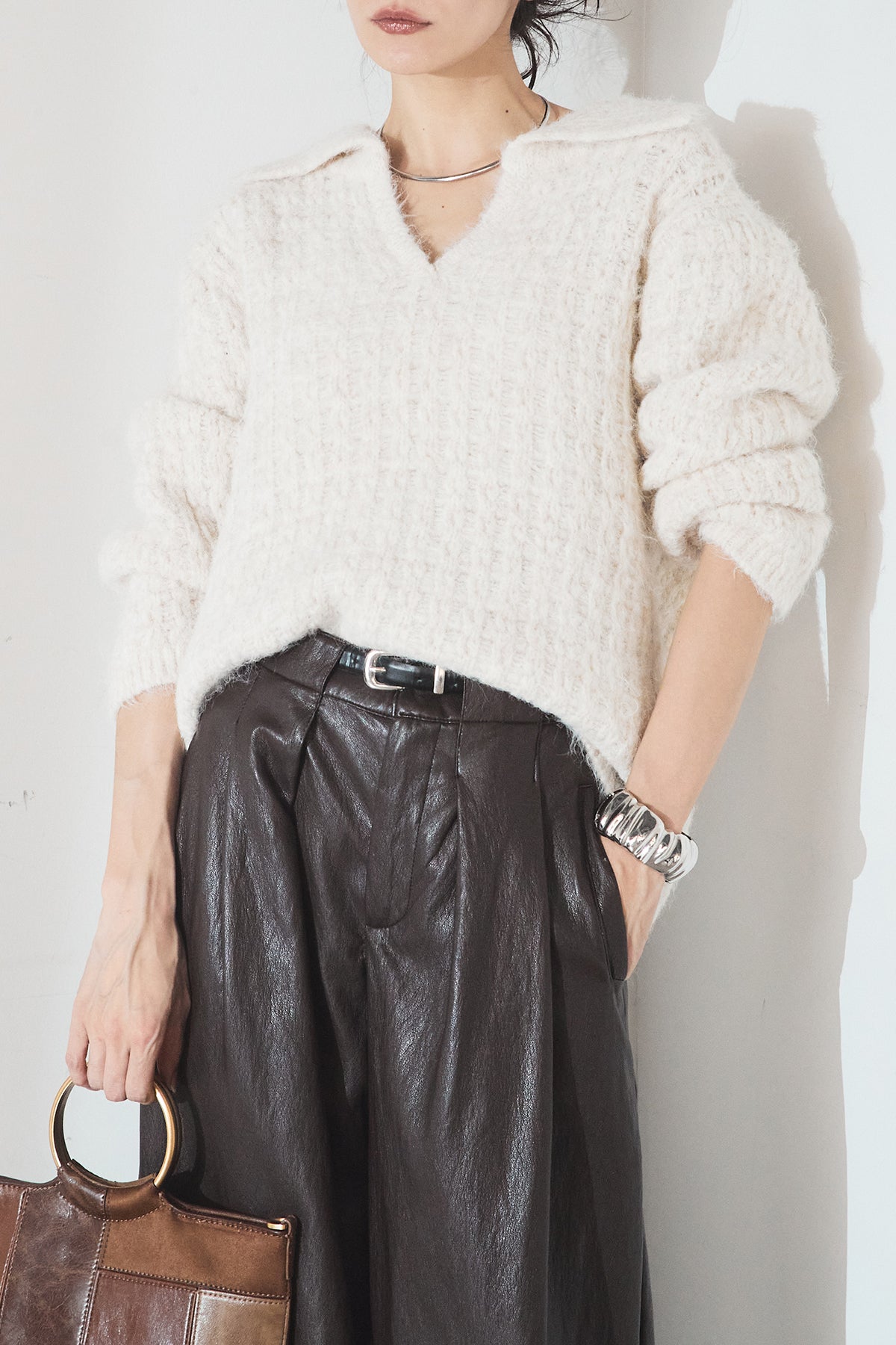 [SET]襟付きVネックニットトップス+ベルト付きレザーライクタックパンツ(2set)