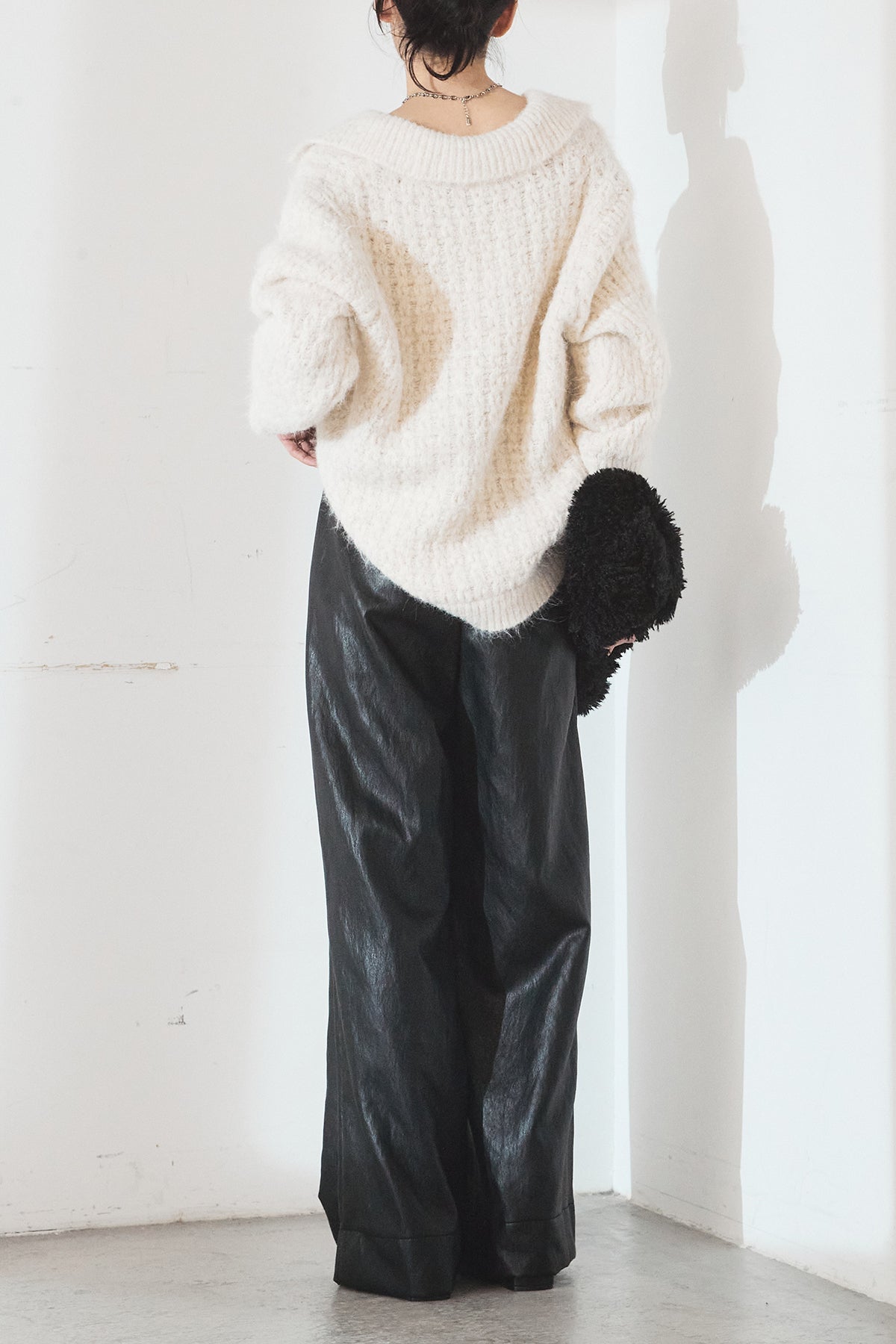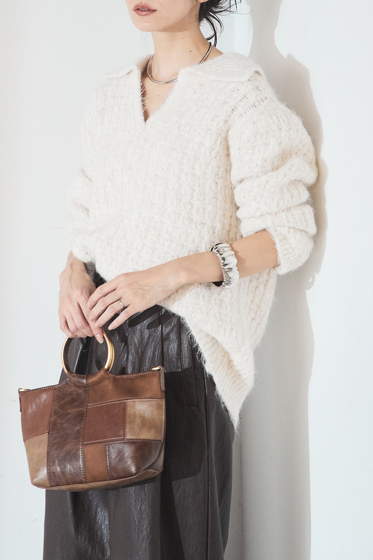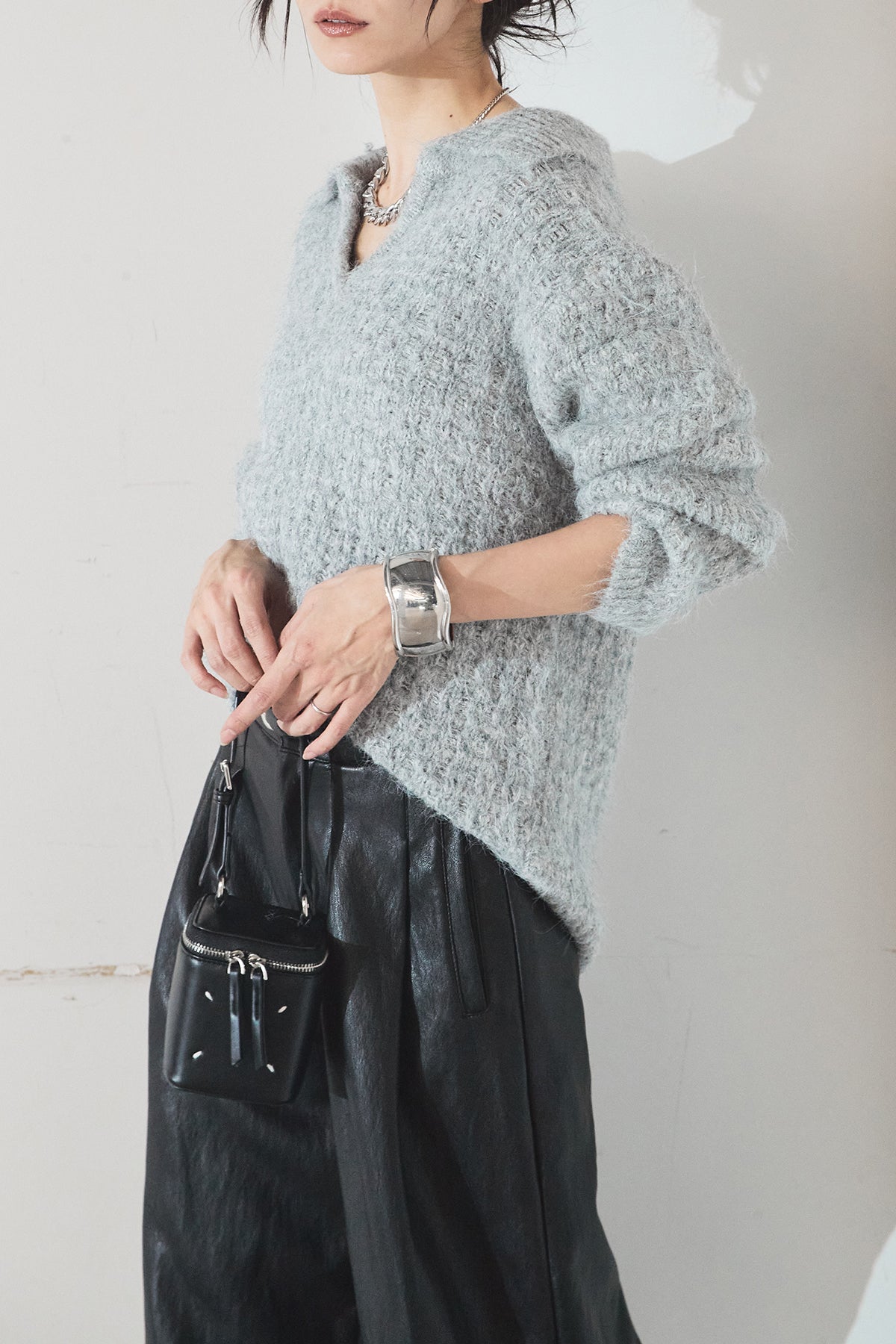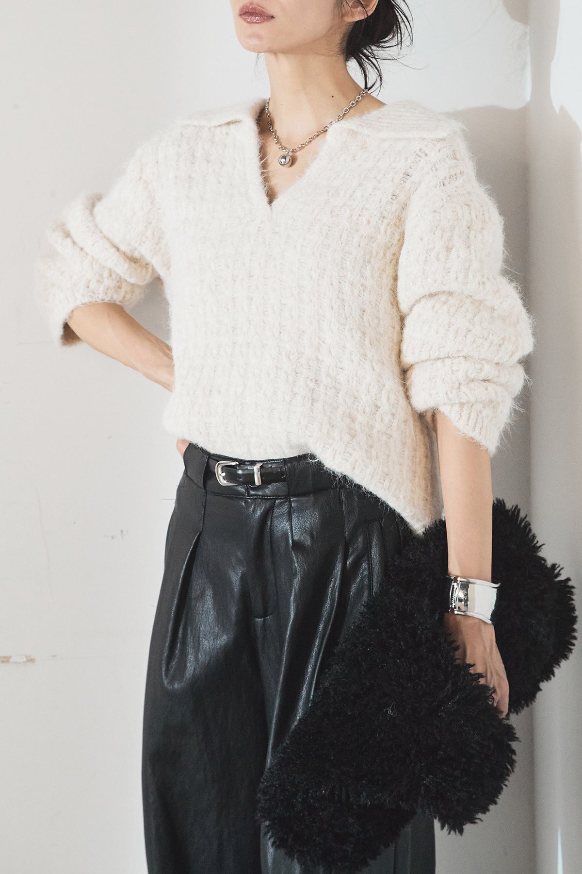 柔らかな風合いのニットに、襟付きのVネックデザインを取り入れたトップス。程よく開いたVラインが顔まわりをすっきり見せ、きちんと感と抜け感を両立します。ゆとりのあるシルエットでリラックスした着心地ながら、上品な印象に仕上がるのも魅力。パンツにもスカートにも合わせやすく、デイリーに活躍する一枚です。