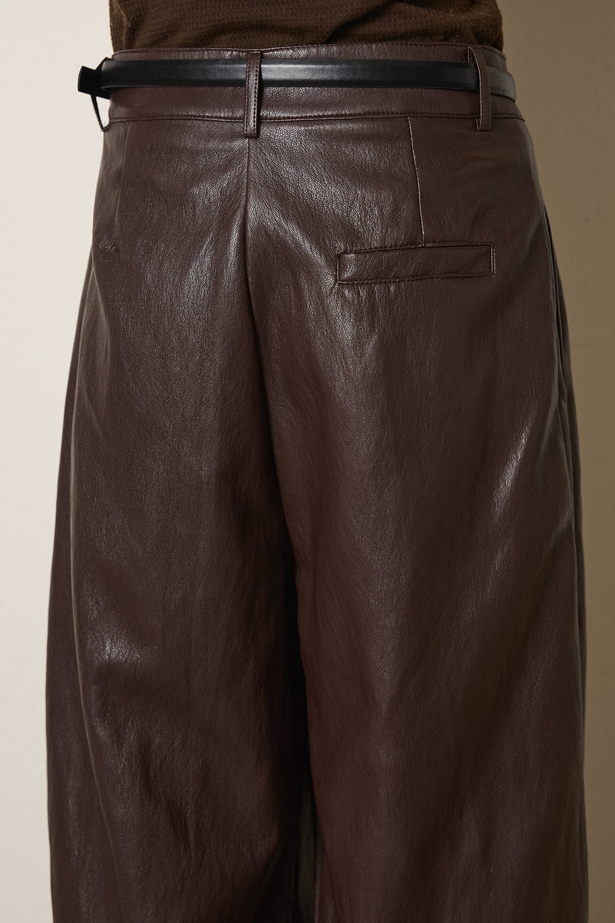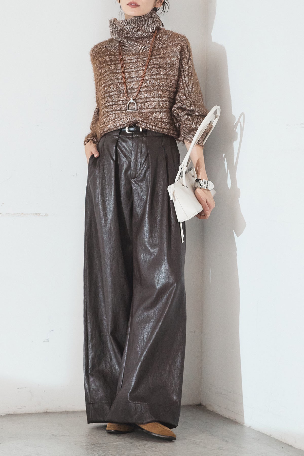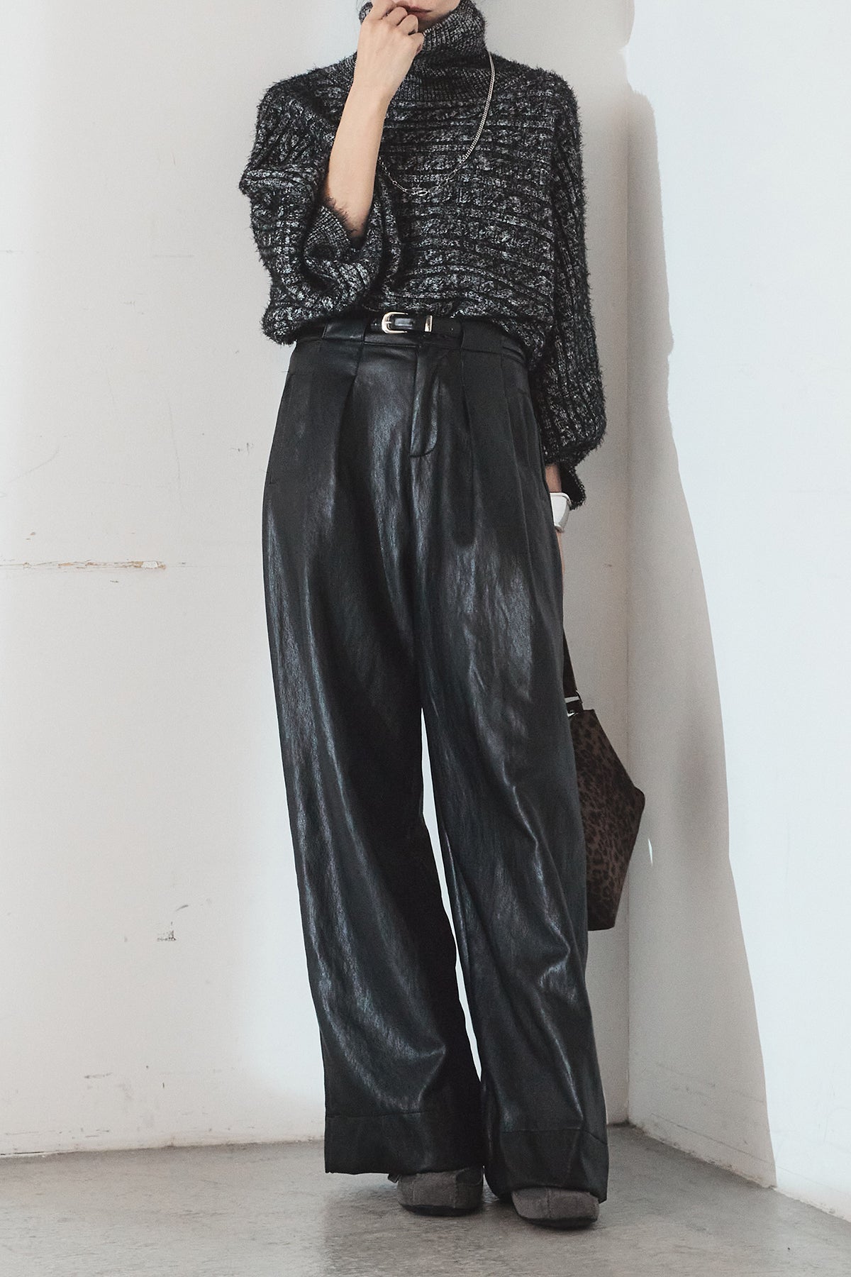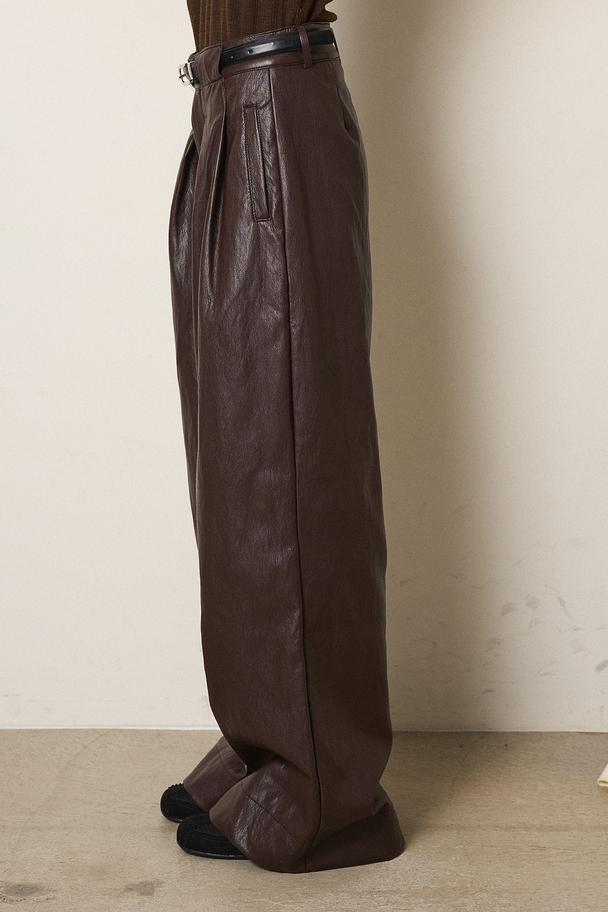 レザーライク素材で仕上げたタック入りパンツ。 ウエストまわりに程よいゆとりがあり、すっきりとしたバランスで着用できます。 付属ベルト付きで、トップスをインしたスタイルもまとまりやすい一本。 シンプルな合わせでもコーデに表情が出やすく、普段使いから外出まで幅広く活躍します。