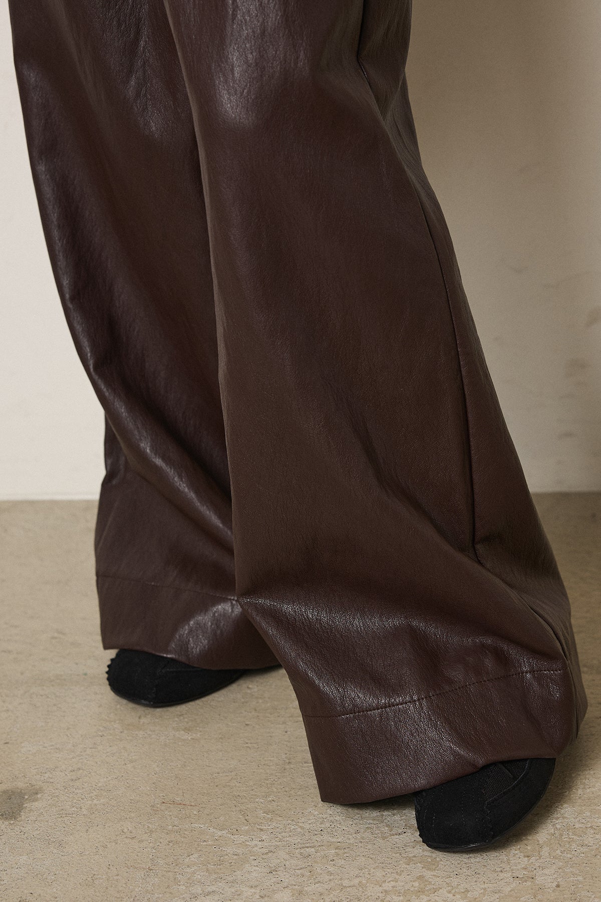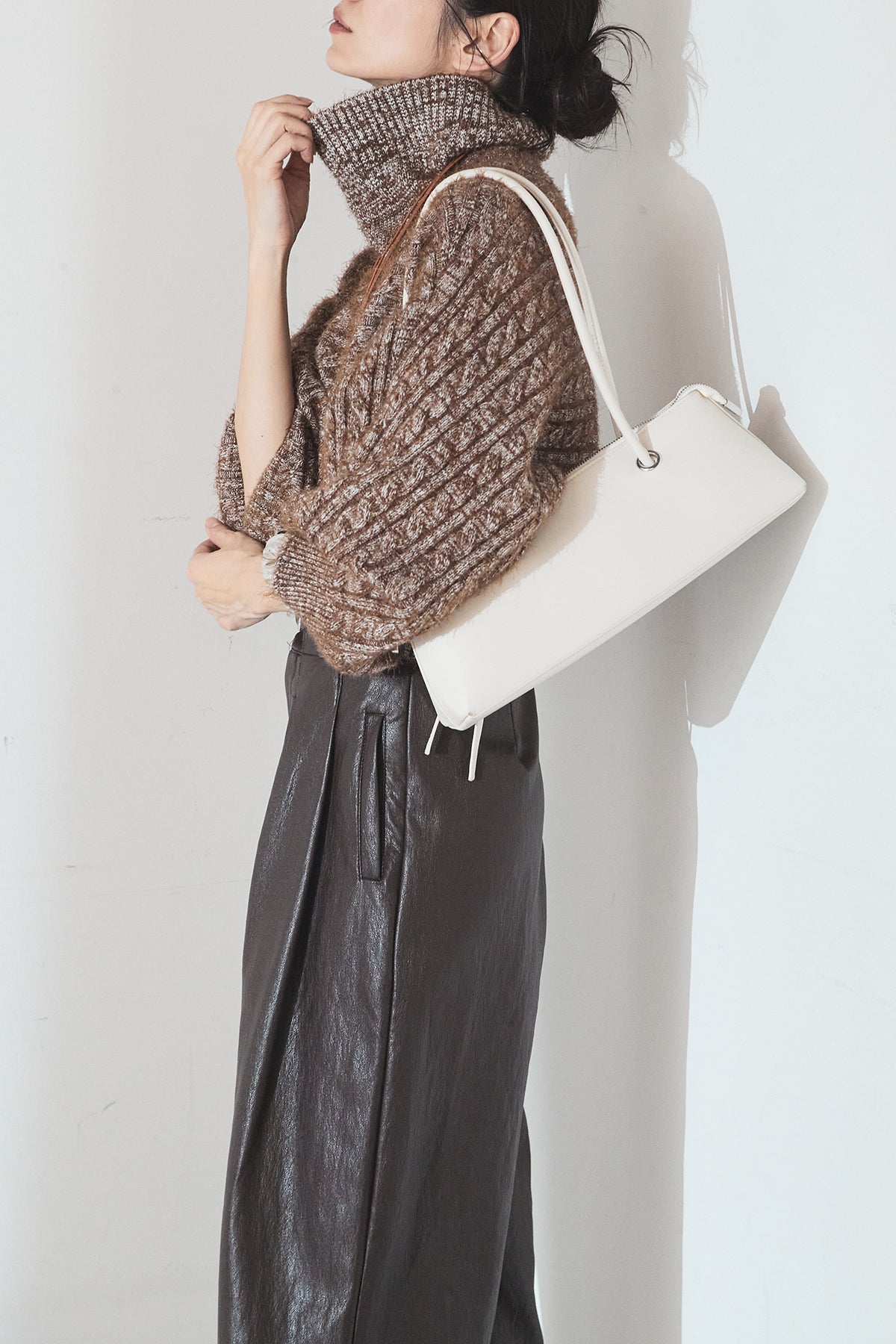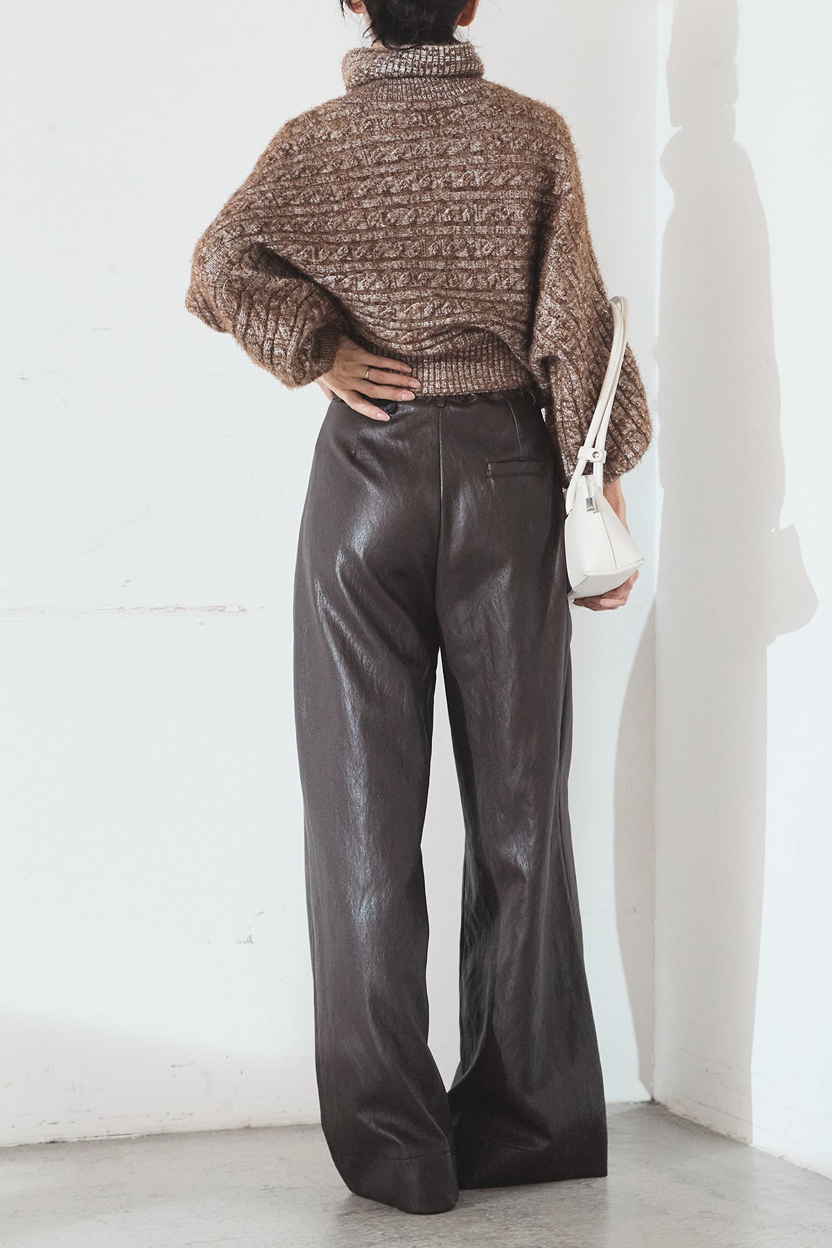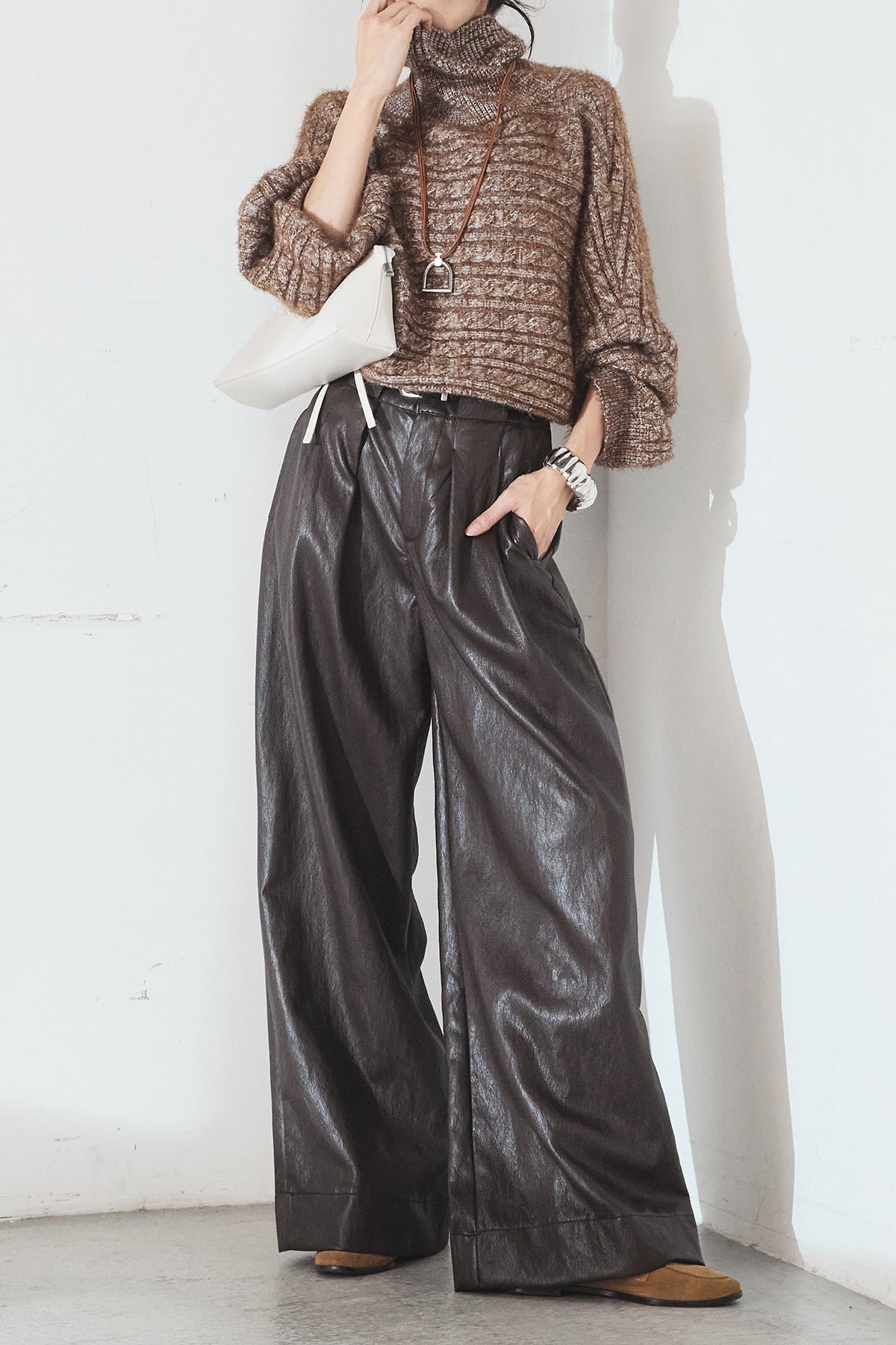 レザーライク素材で仕上げたタック入りパンツ。 ウエストまわりに程よいゆとりがあり、すっきりとしたバランスで着用できます。 付属ベルト付きで、トップスをインしたスタイルもまとまりやすい一本。 シンプルな合わせでもコーデに表情が出やすく、普段使いから外出まで幅広く活躍します。
