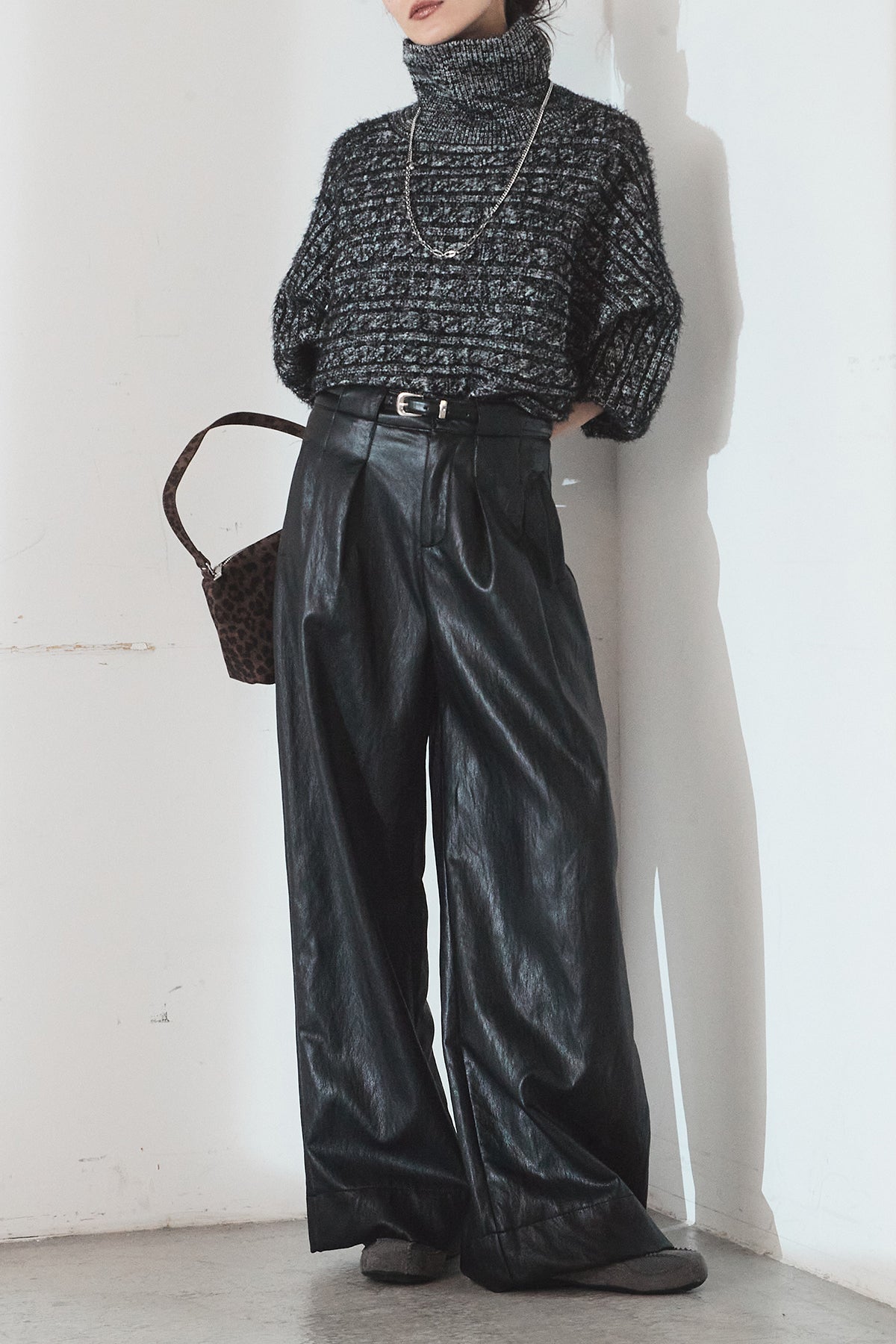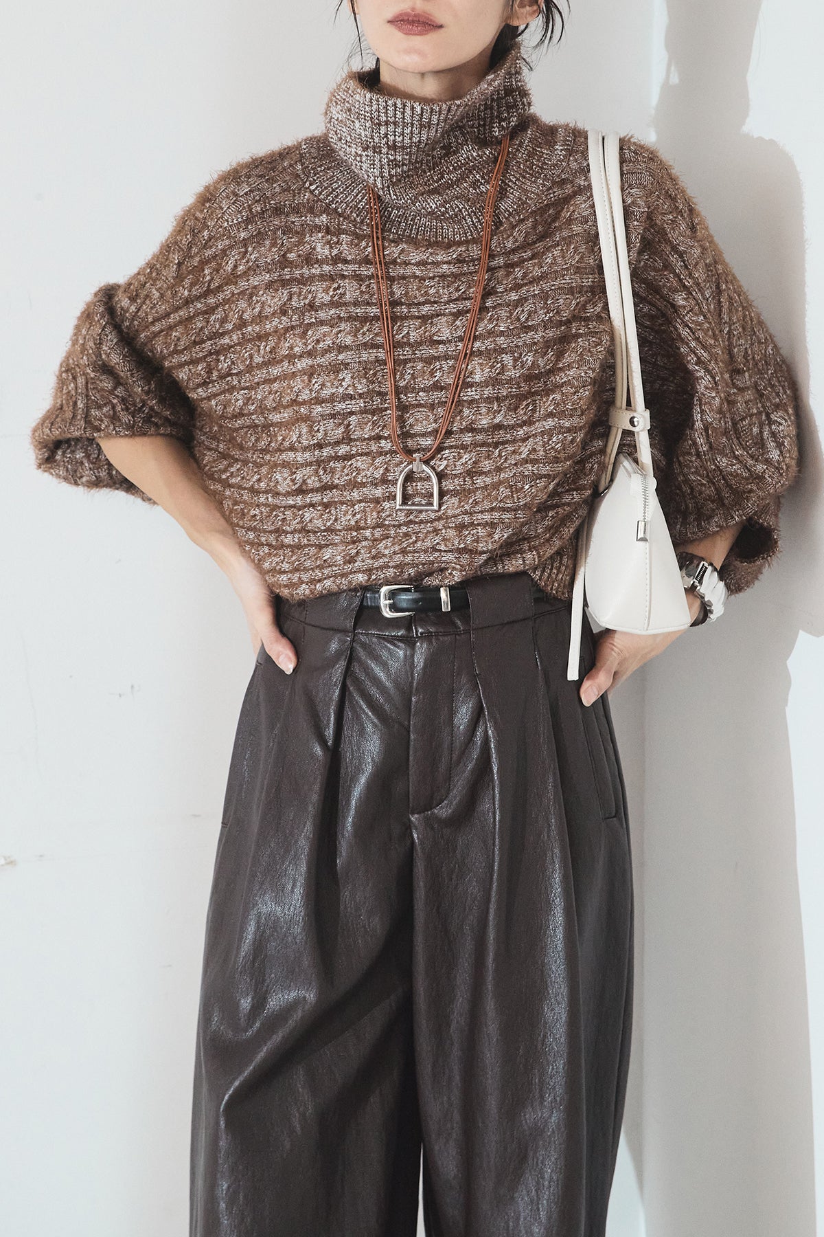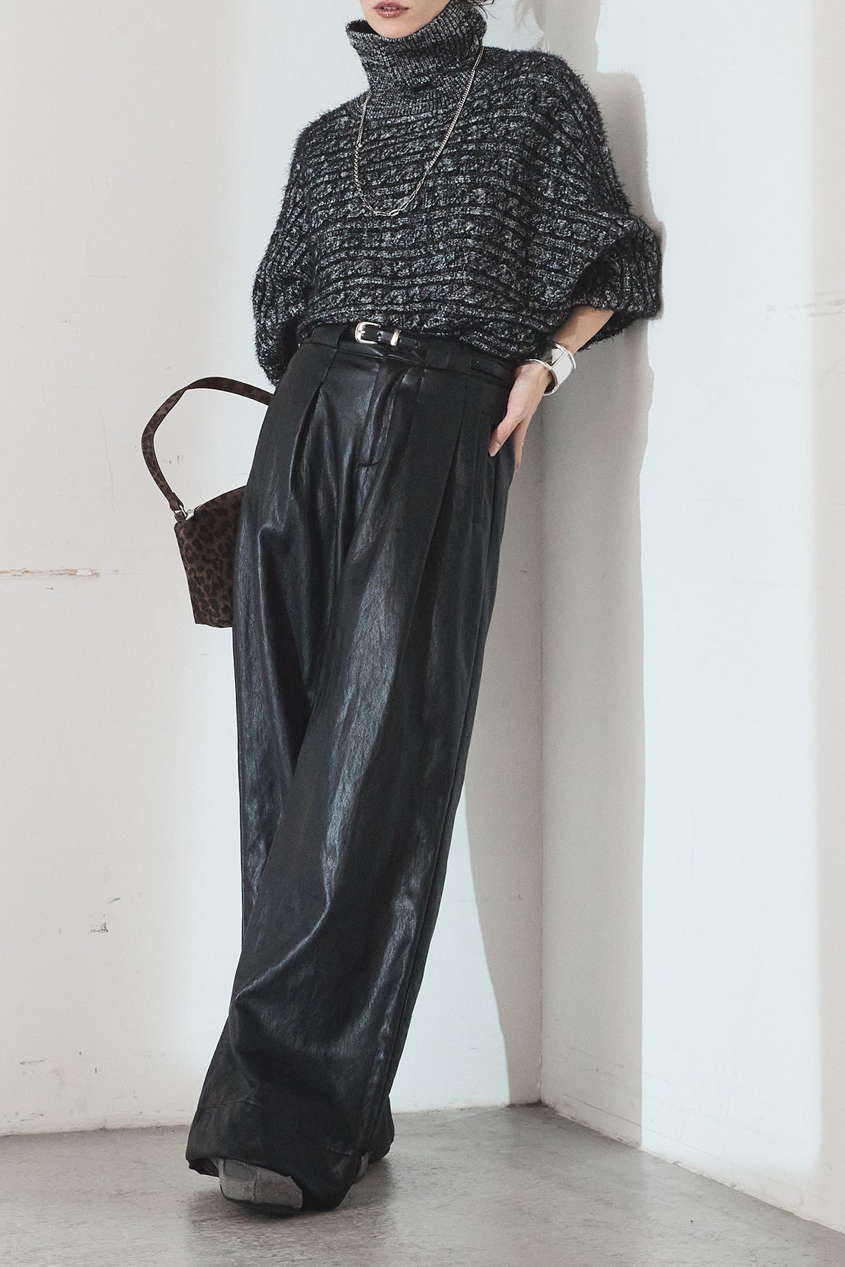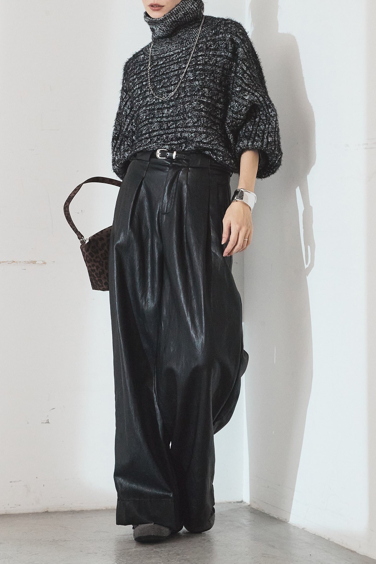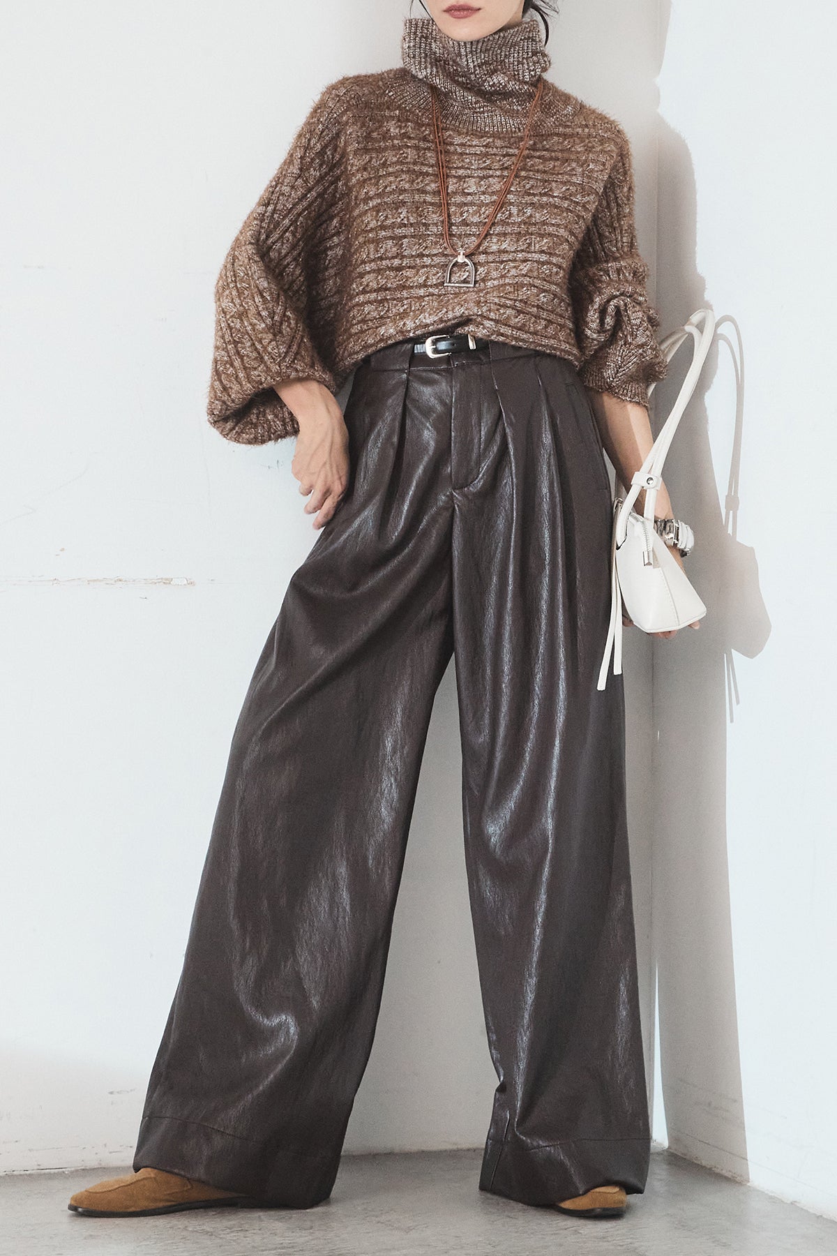 [SET]ミックス編みドルマンニットトップス+ベルト付きレザーライクタックパンツ(2set)
