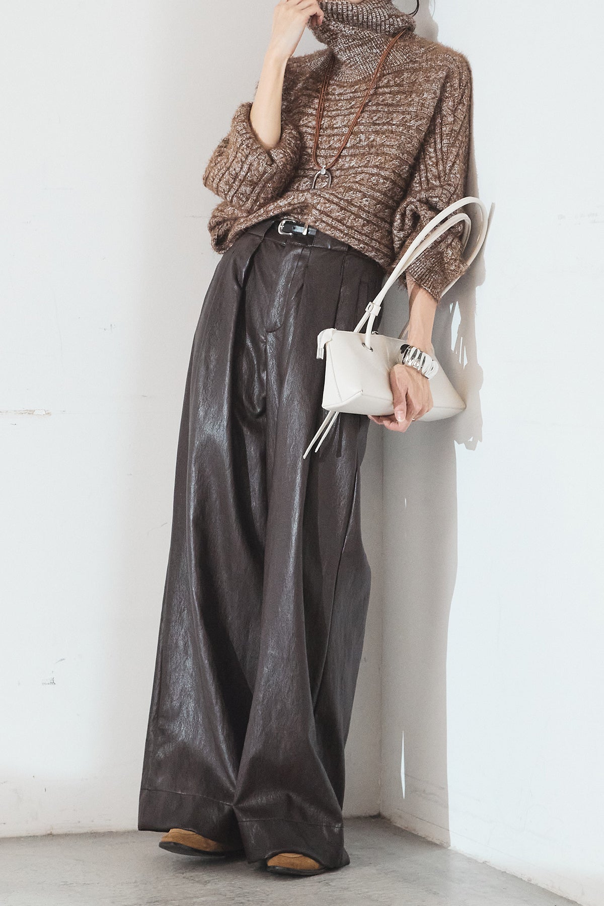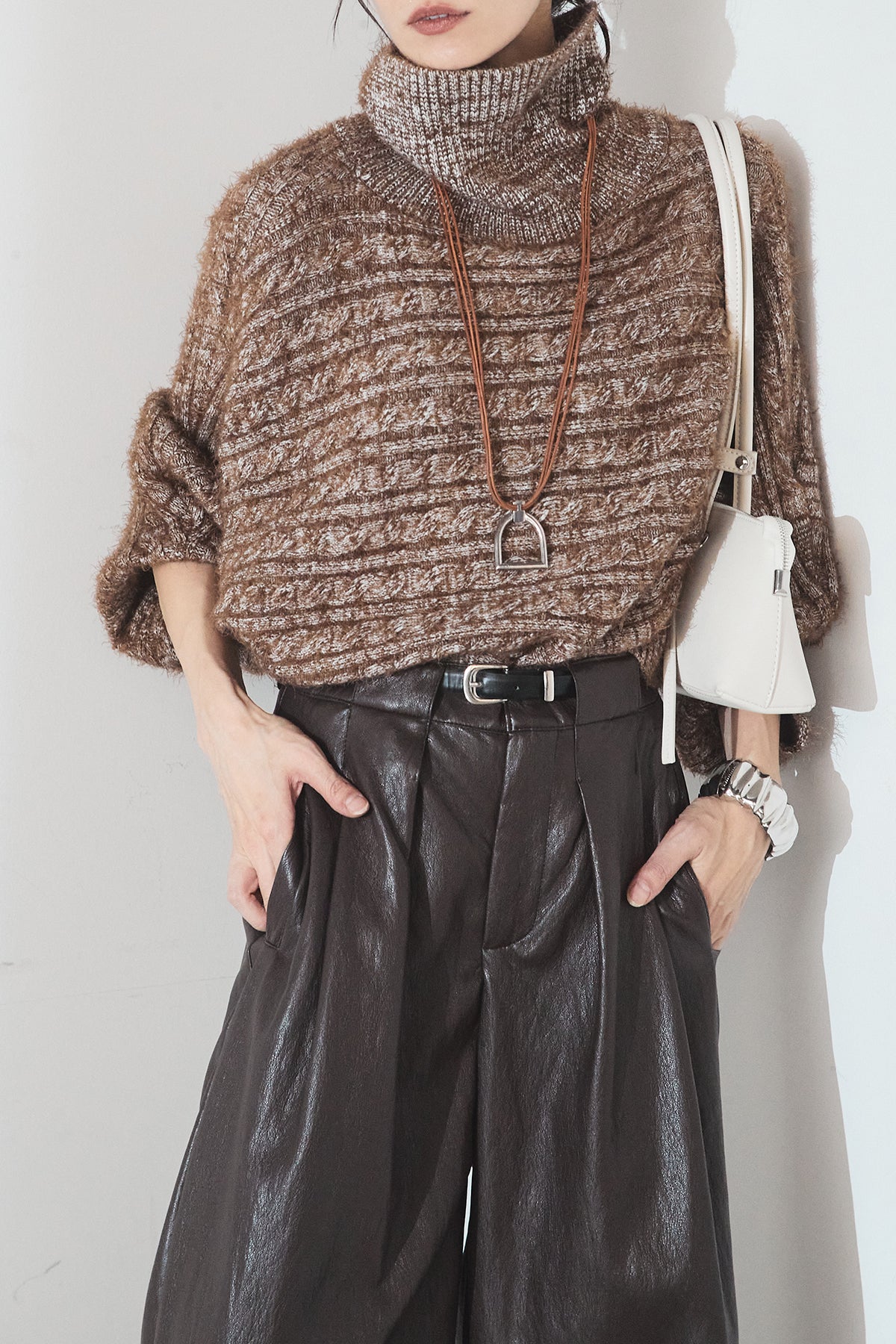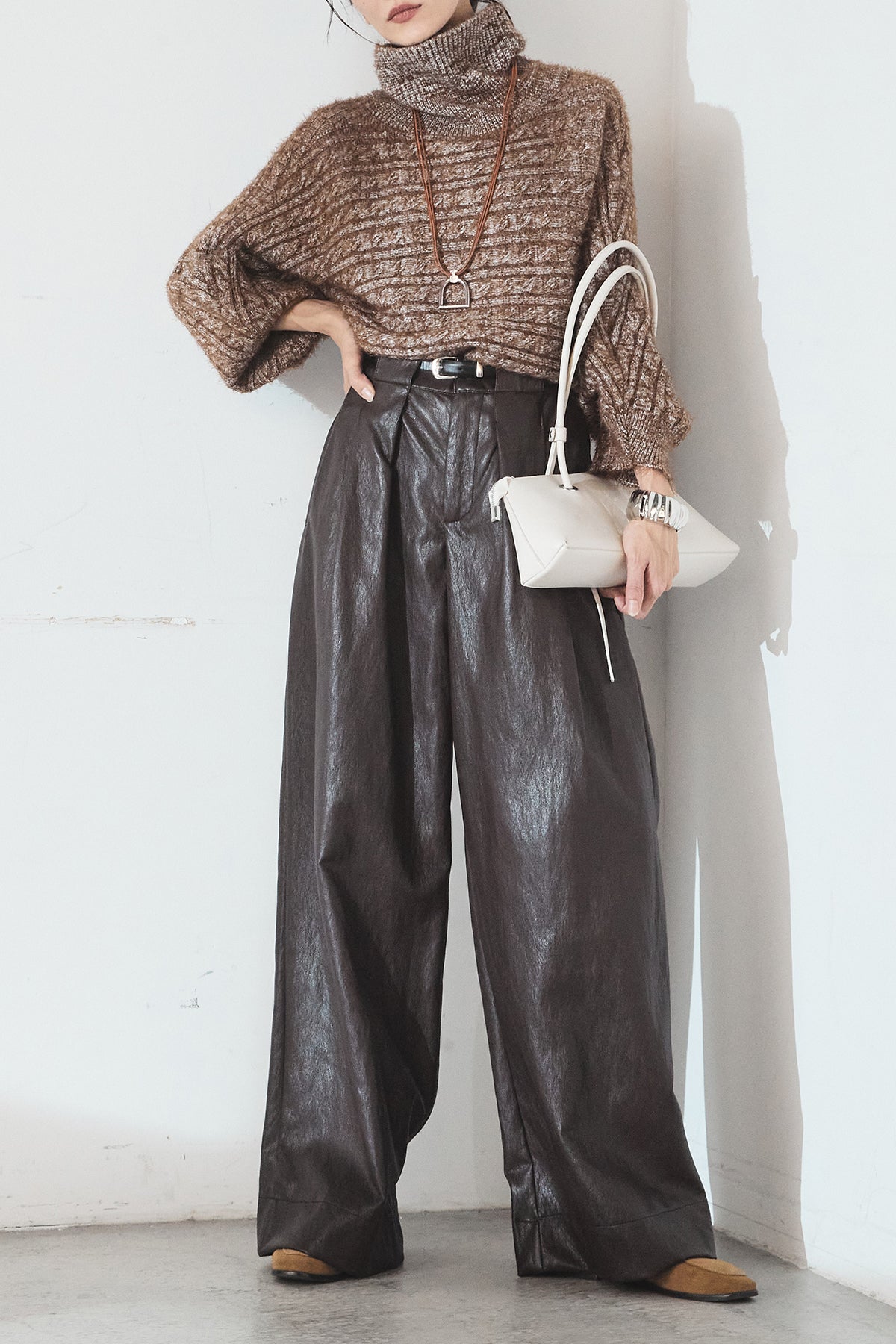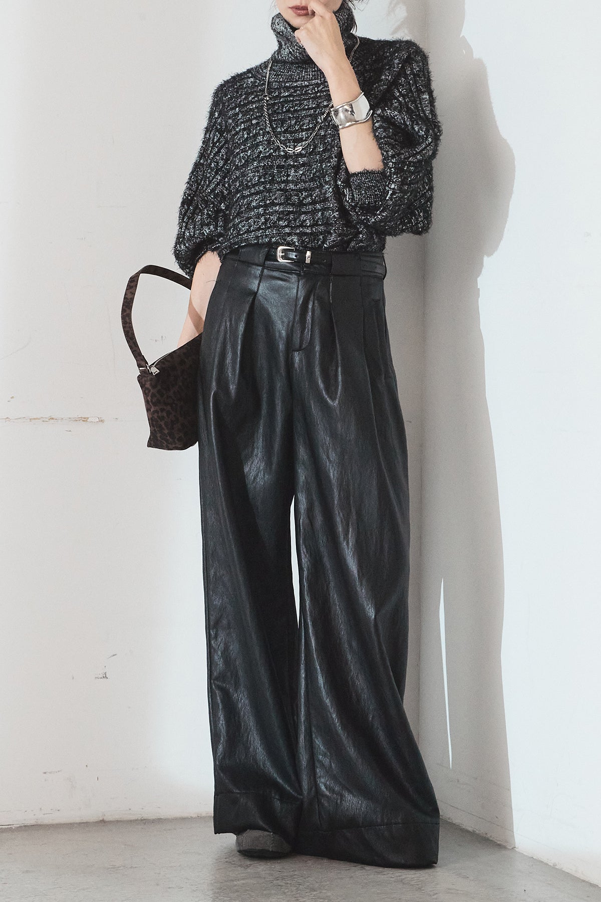 [SET]ミックス編みドルマンニットトップス+ベルト付きレザーライクタックパンツ(2set)