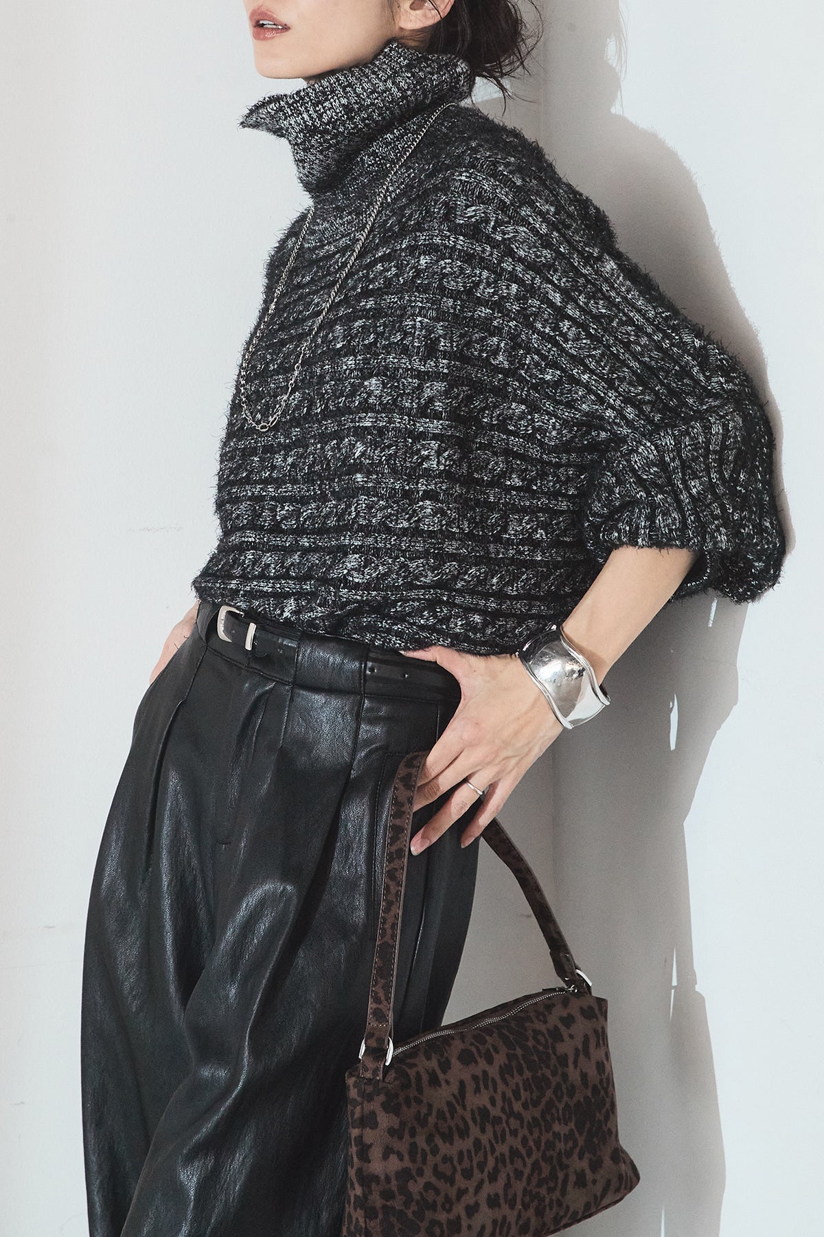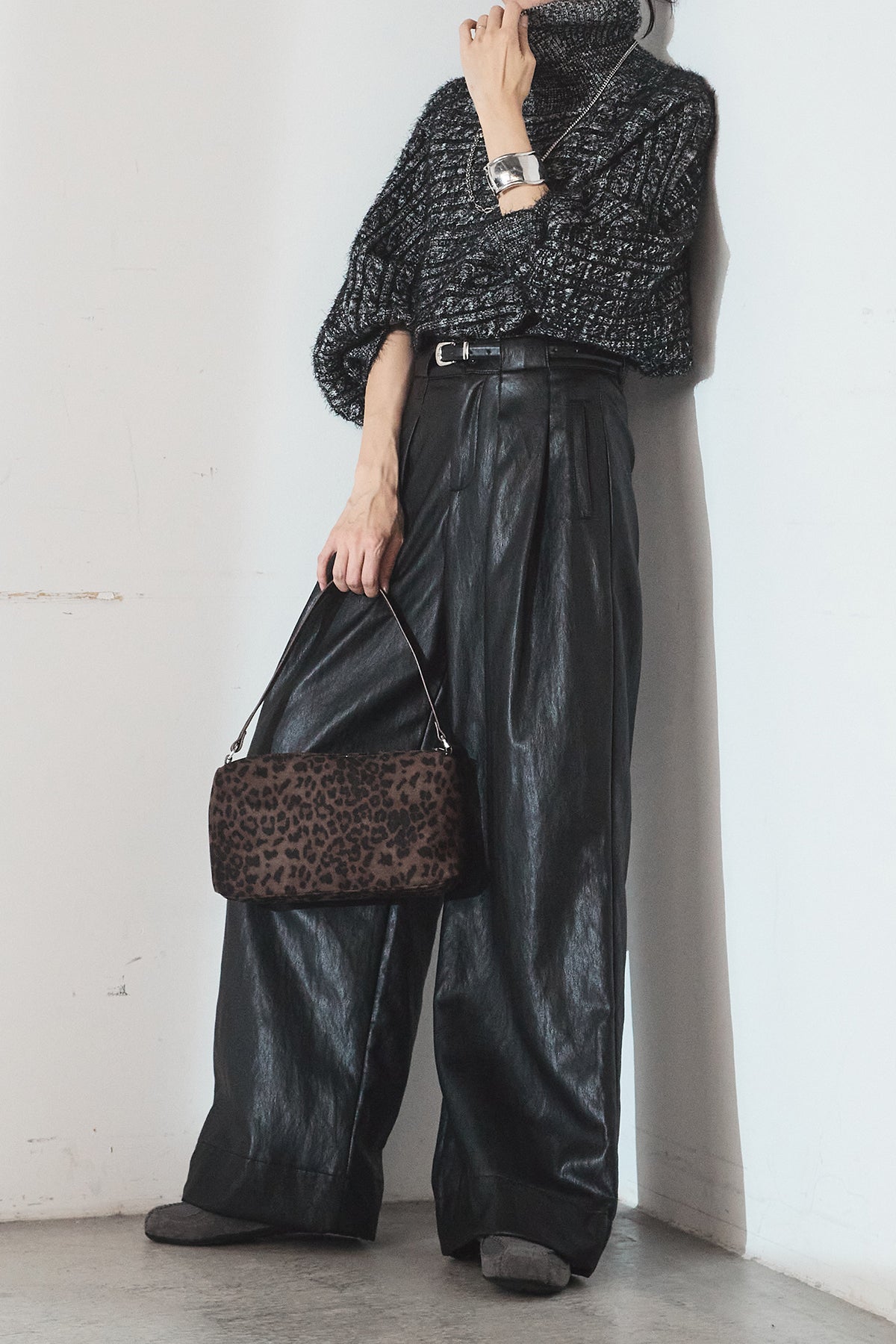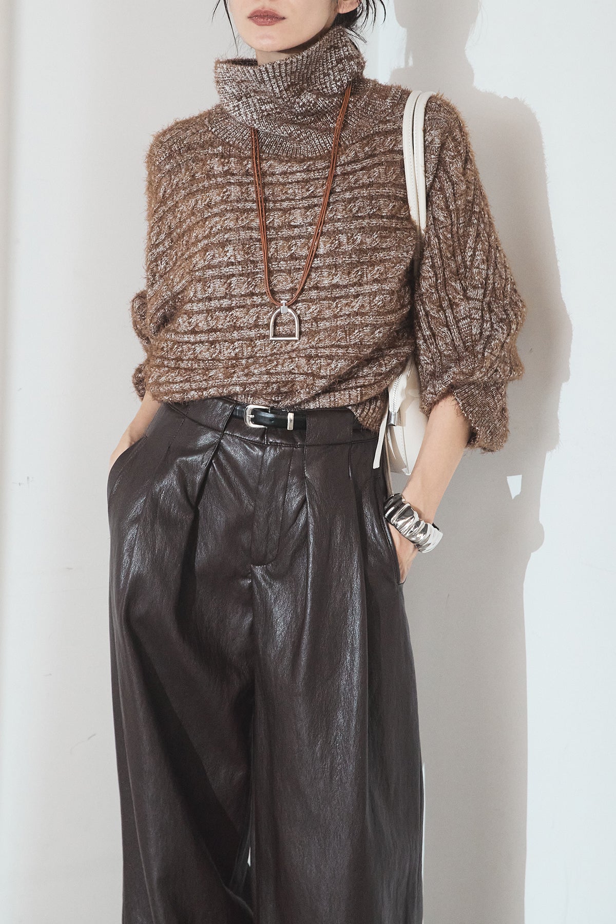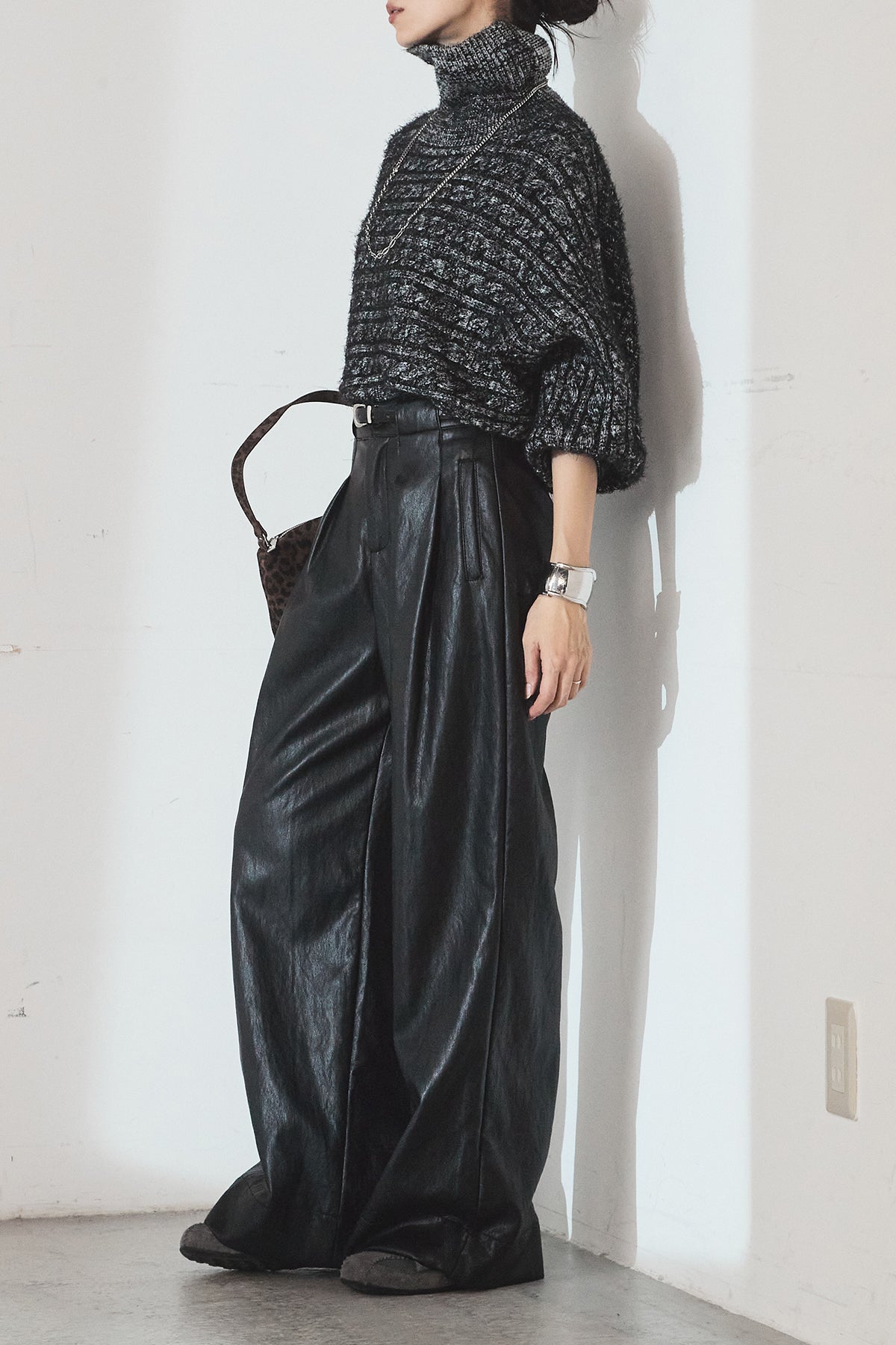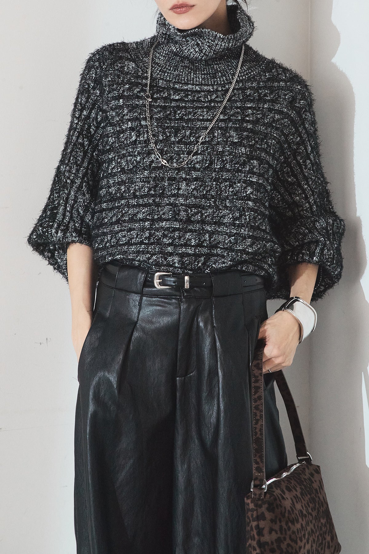 [SET]ミックス編みドルマンニットトップス+ベルト付きレザーライクタックパンツ(2set)