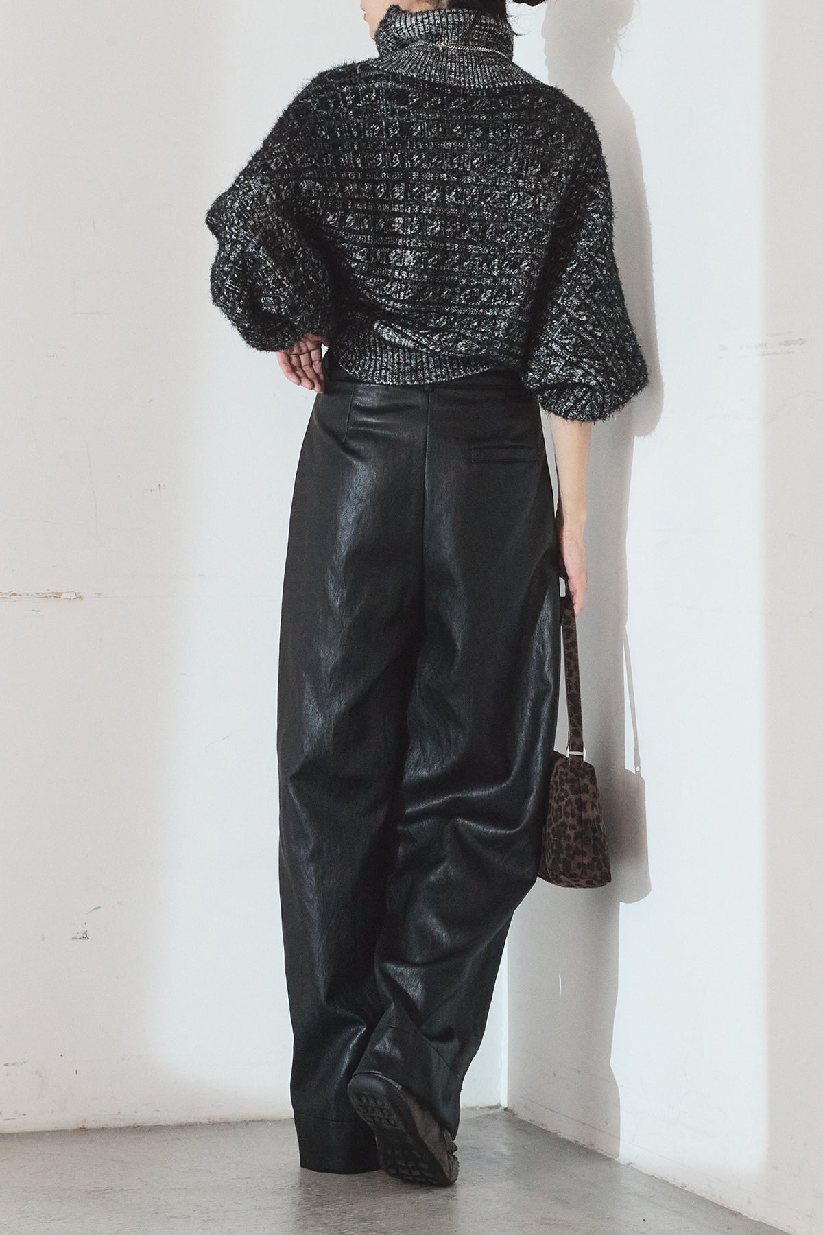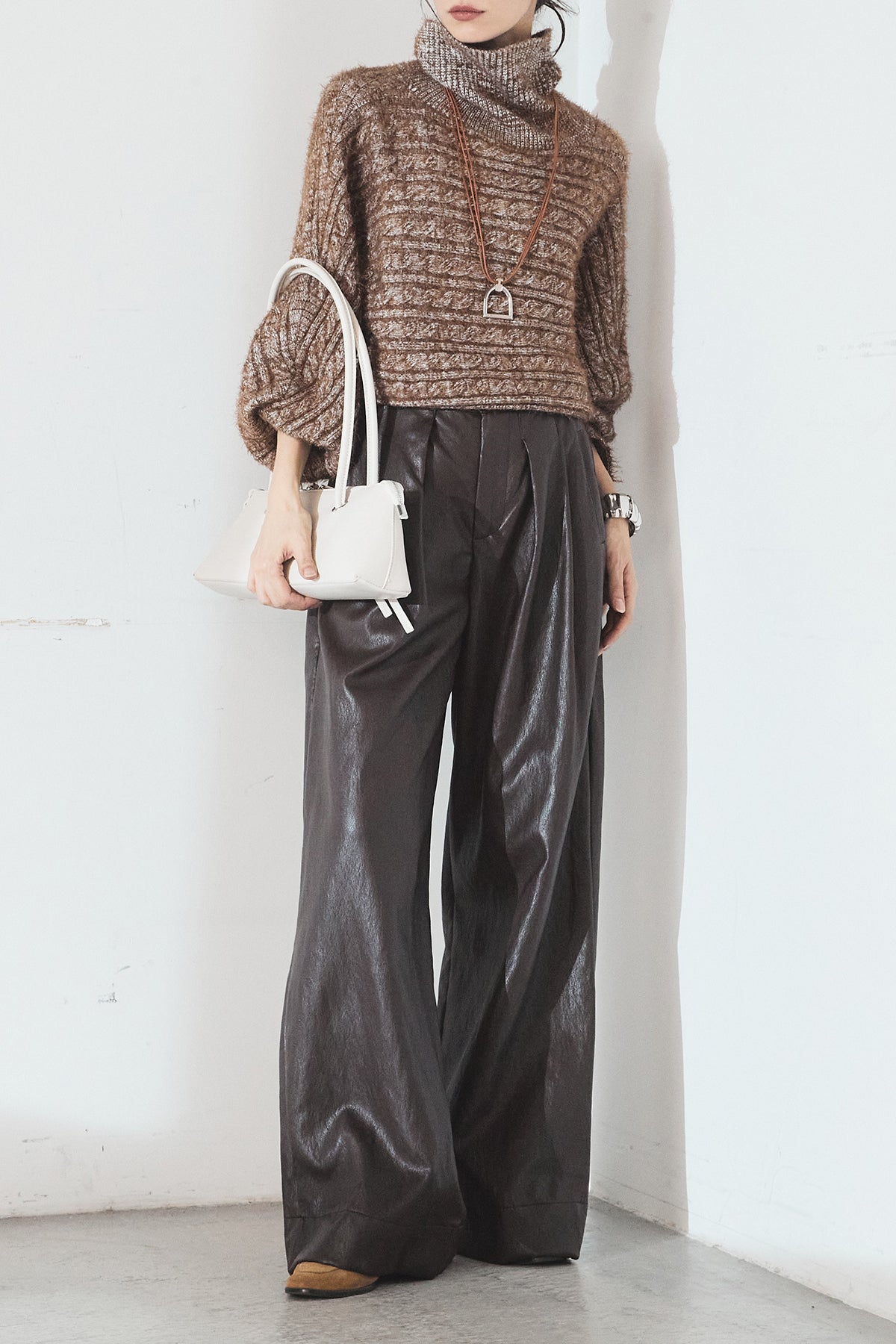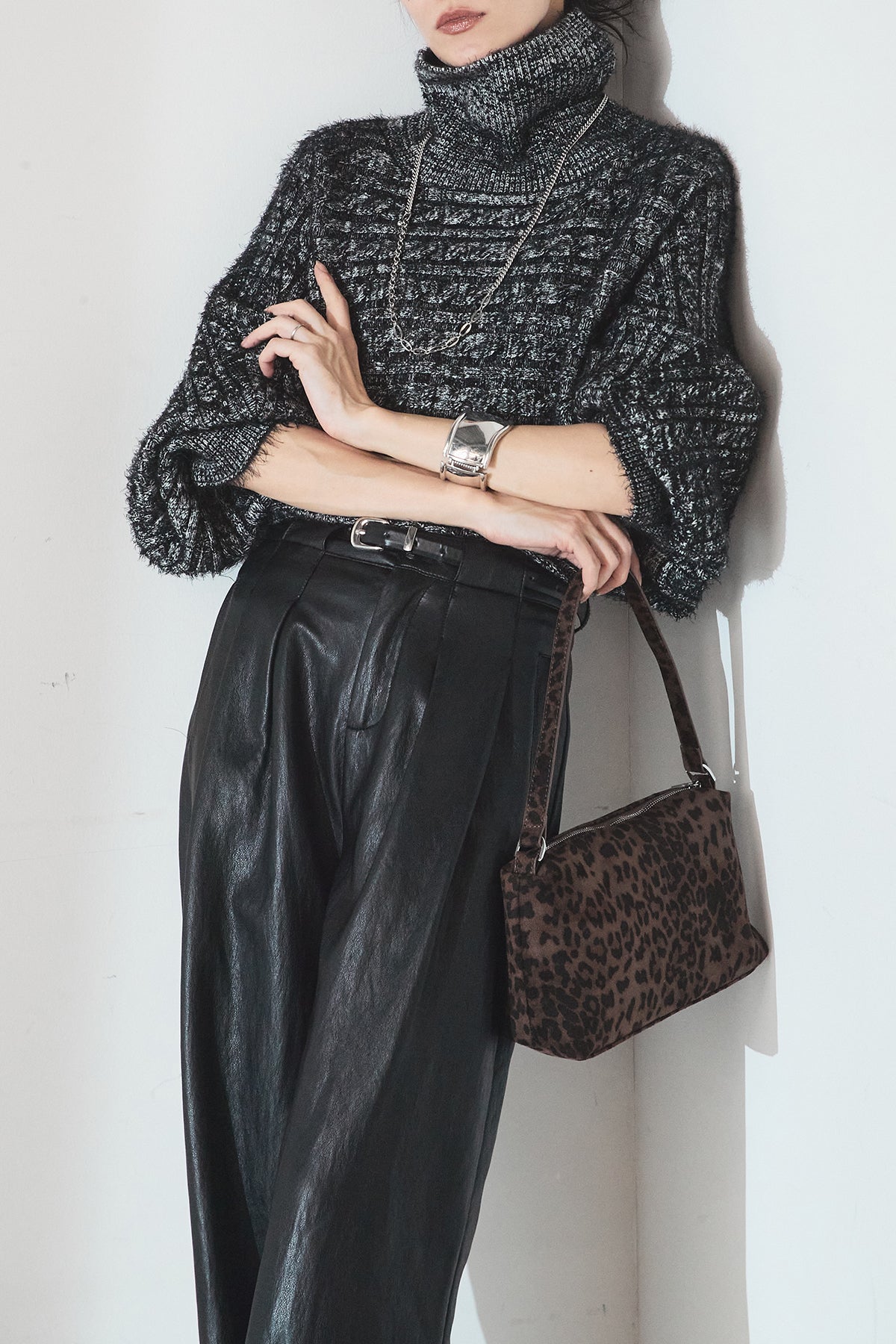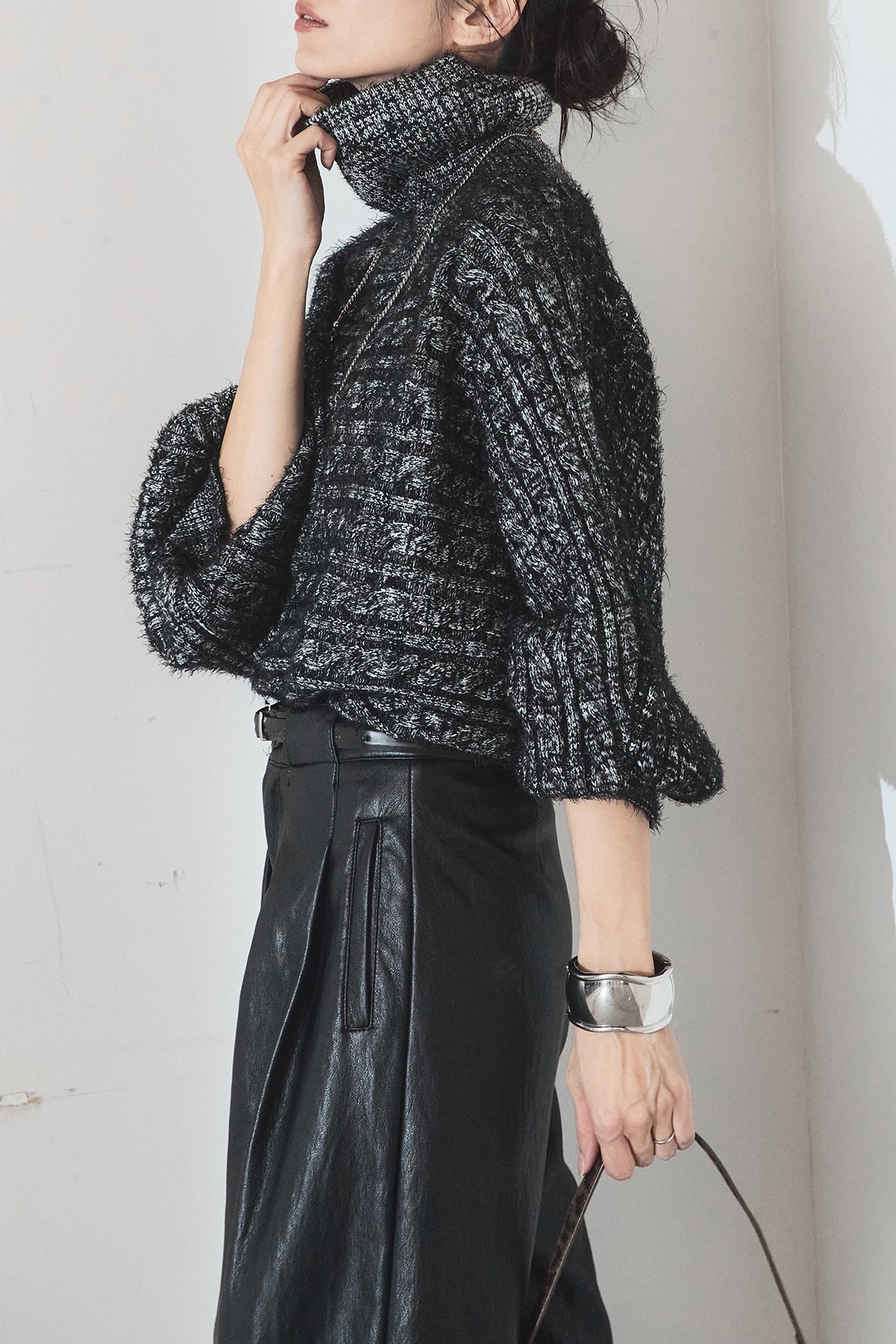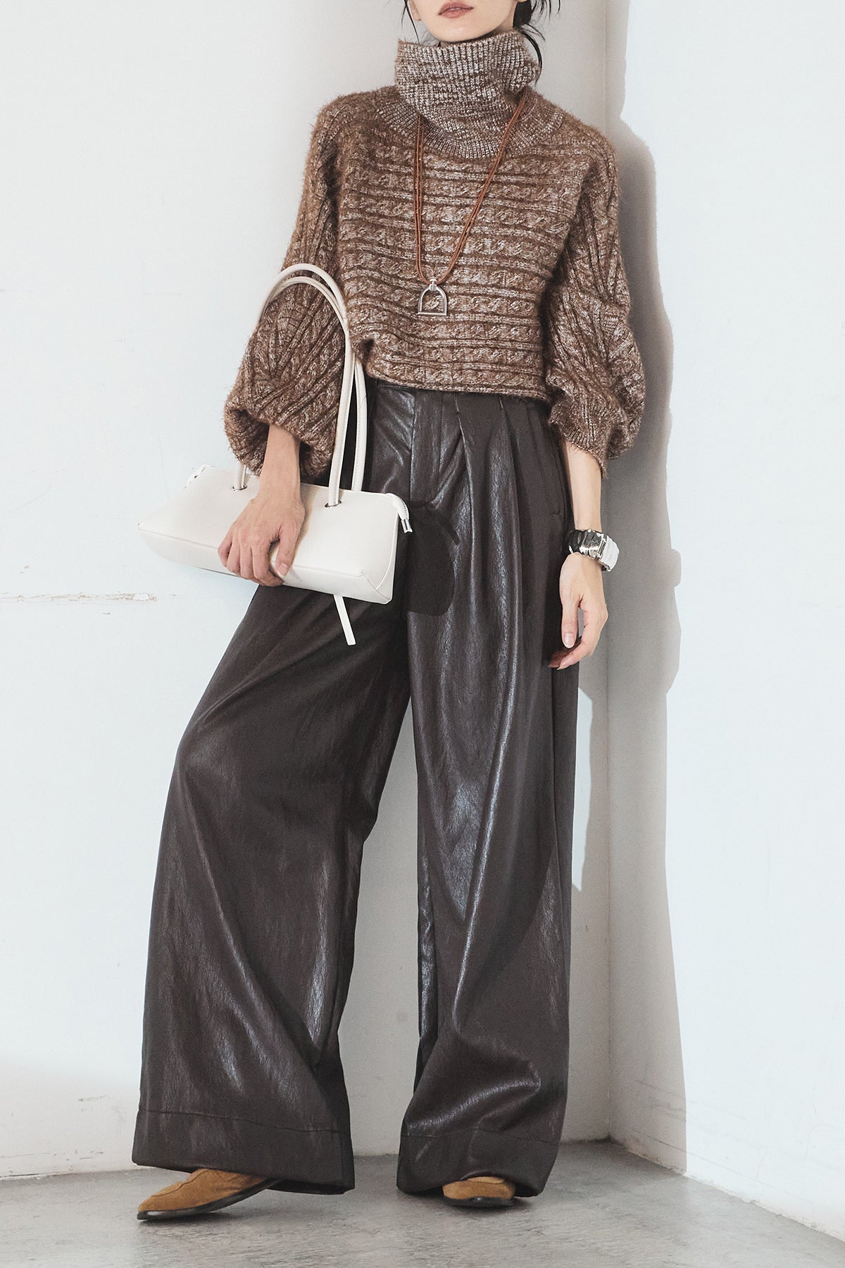 [SET]ミックス編みドルマンニットトップス+ベルト付きレザーライクタックパンツ(2set)
