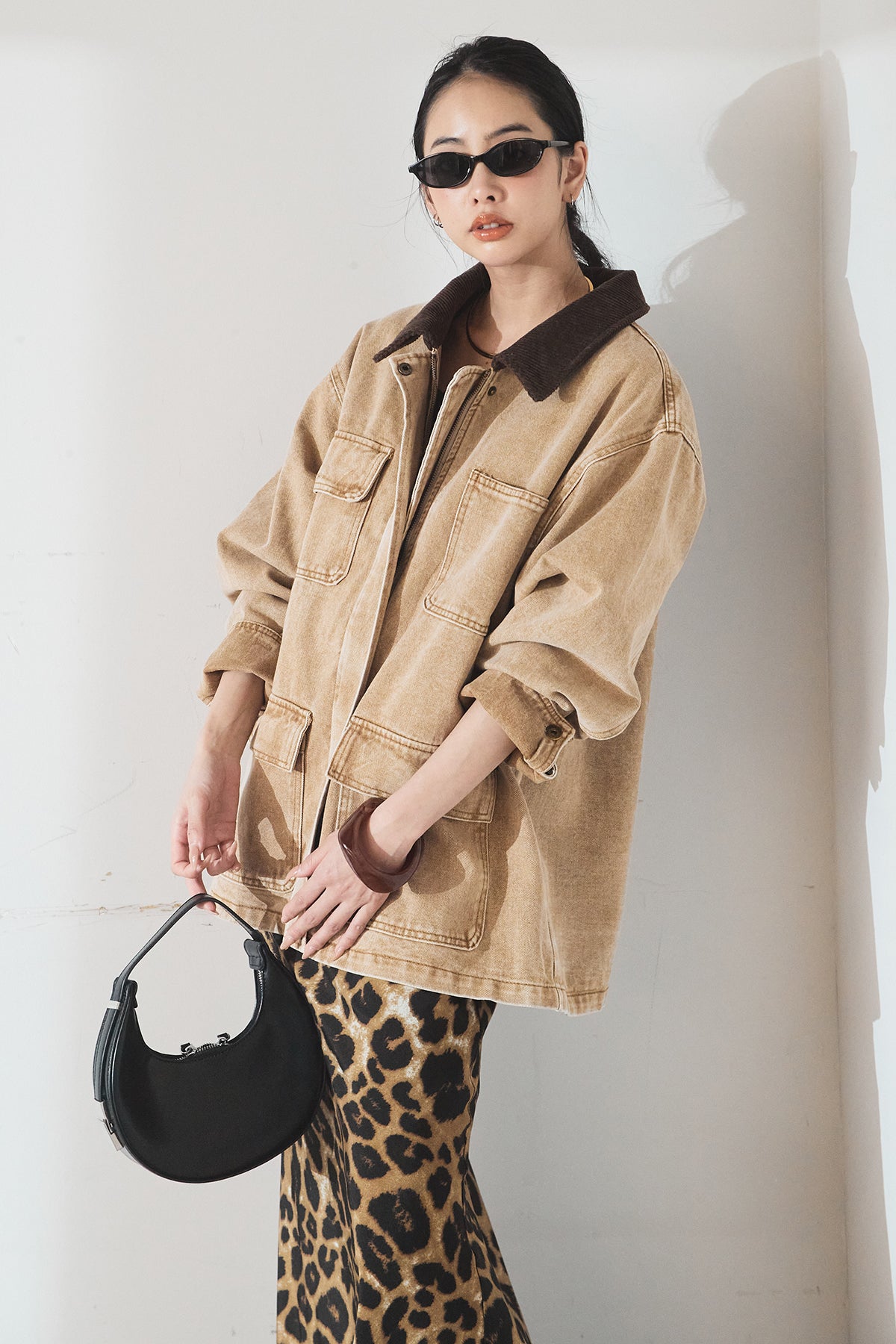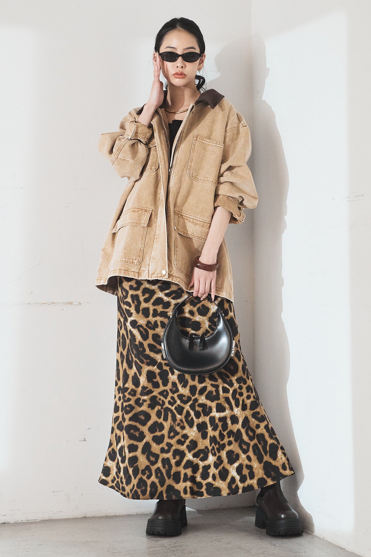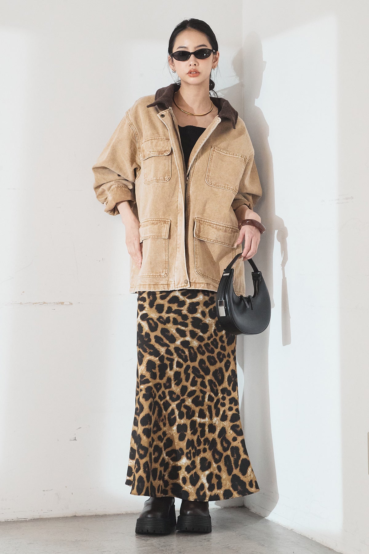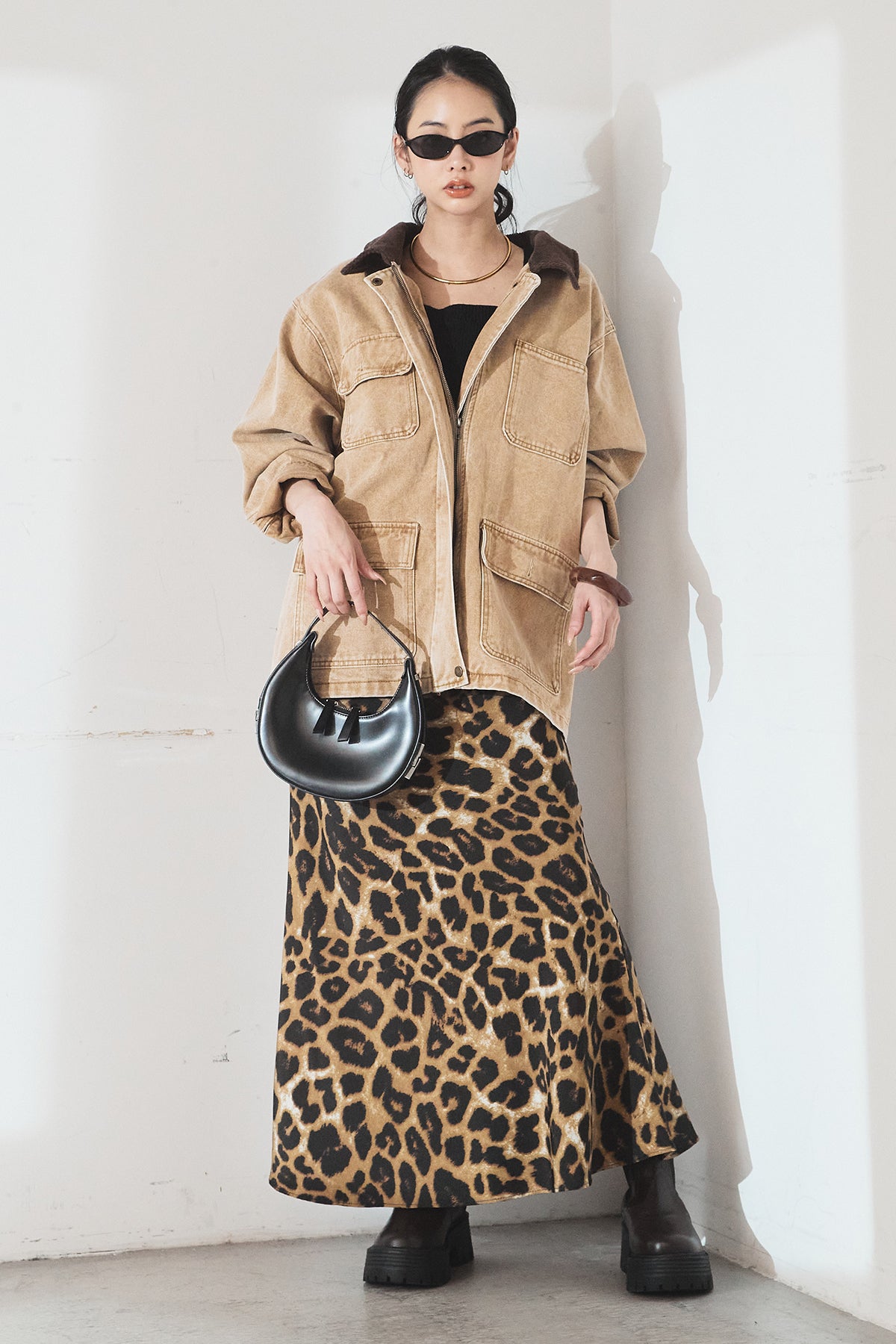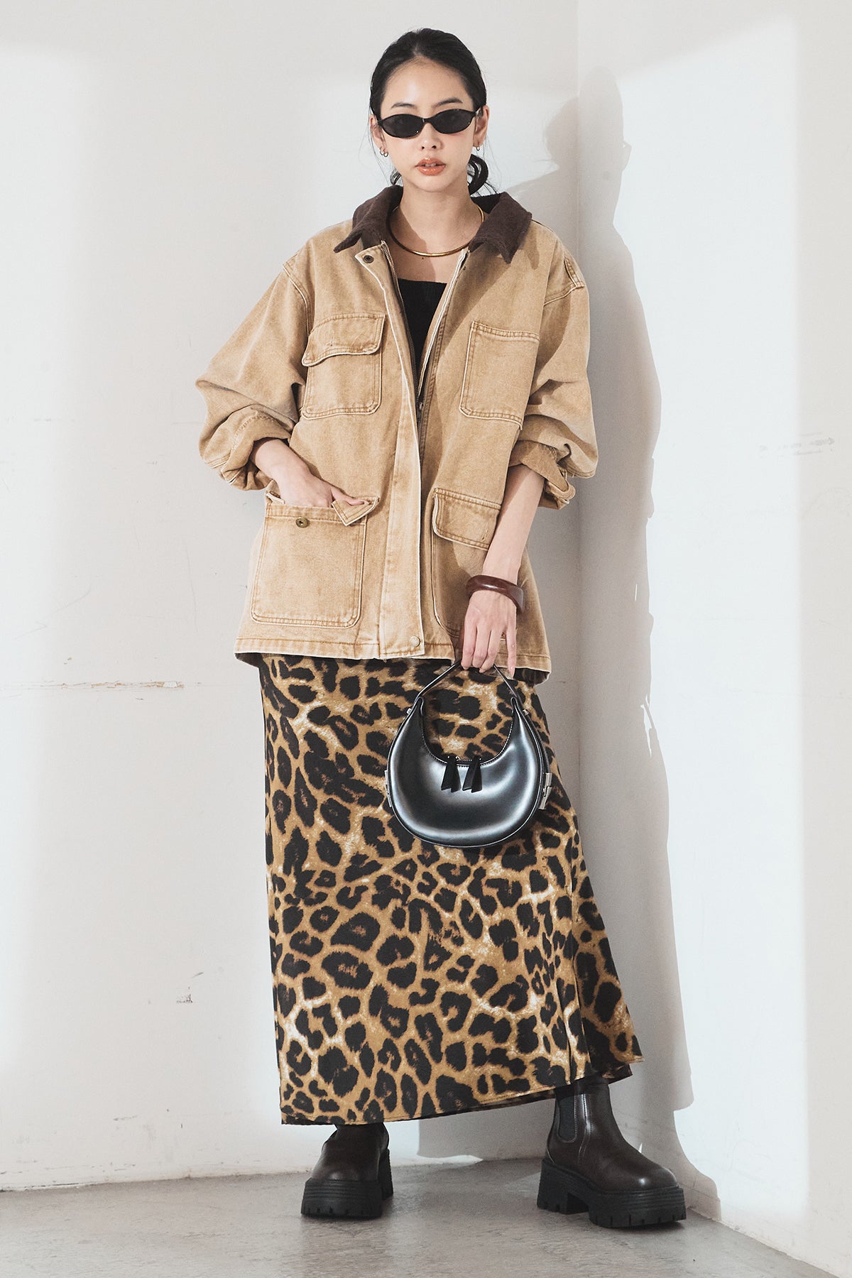 [SET]襟コーデュロイジップデニム調カバーオール+レオパードサテンナロースカート(2set)