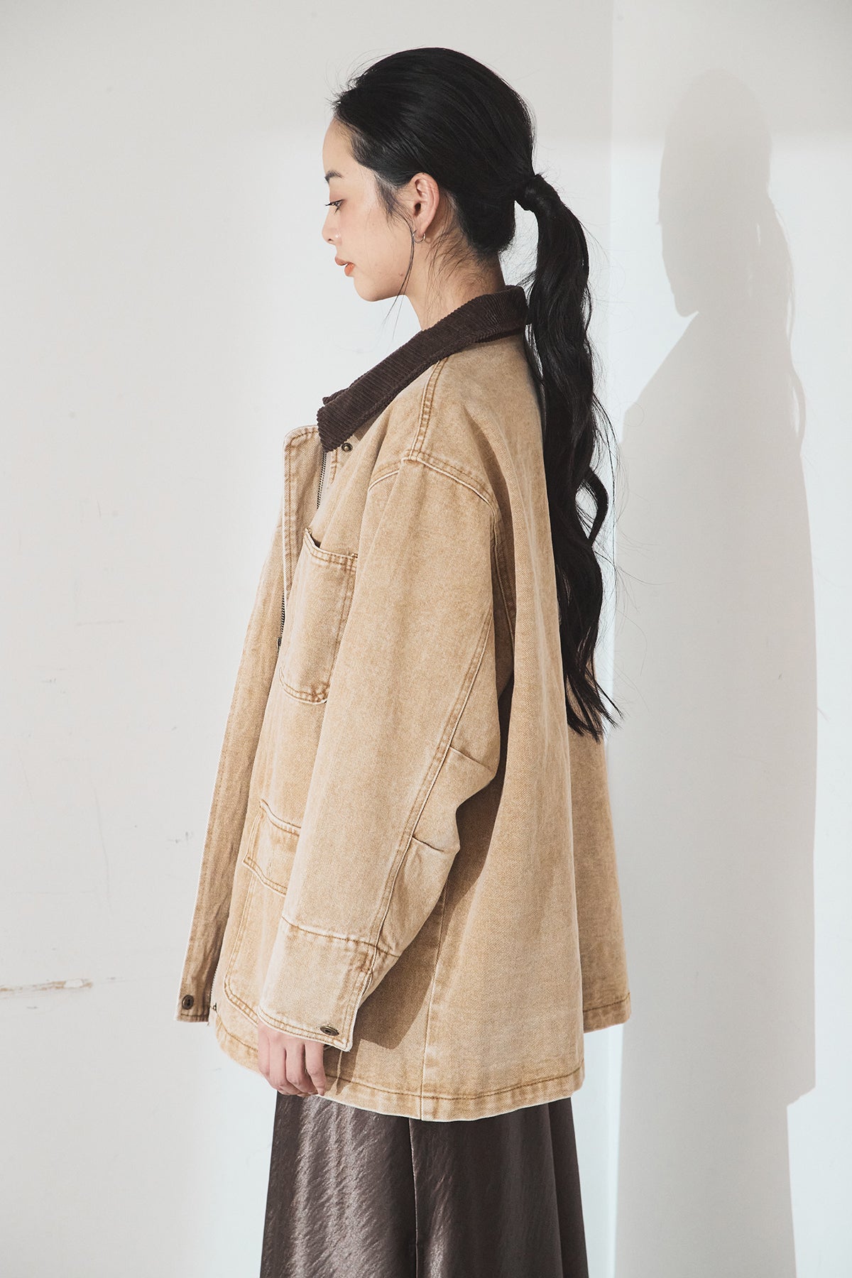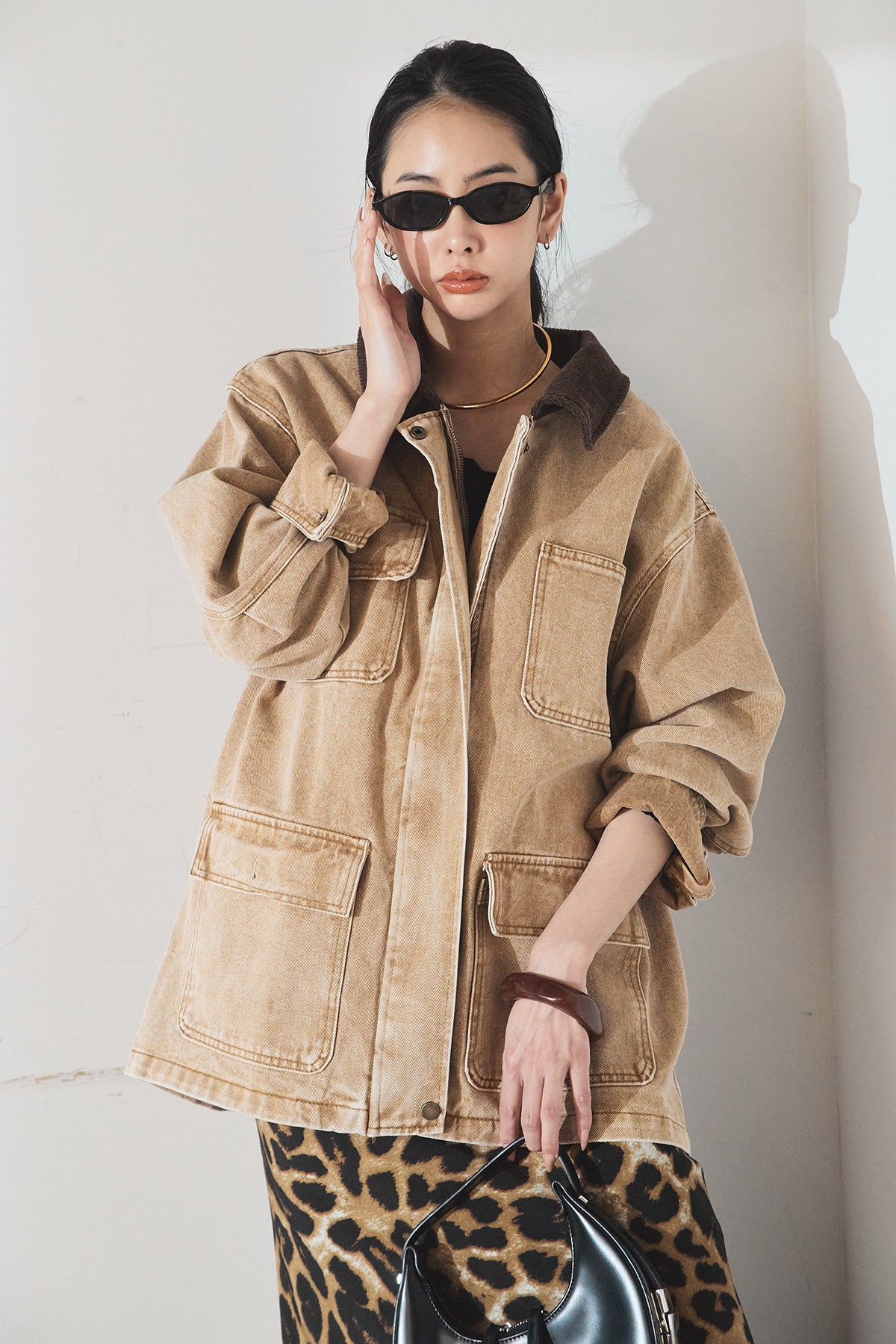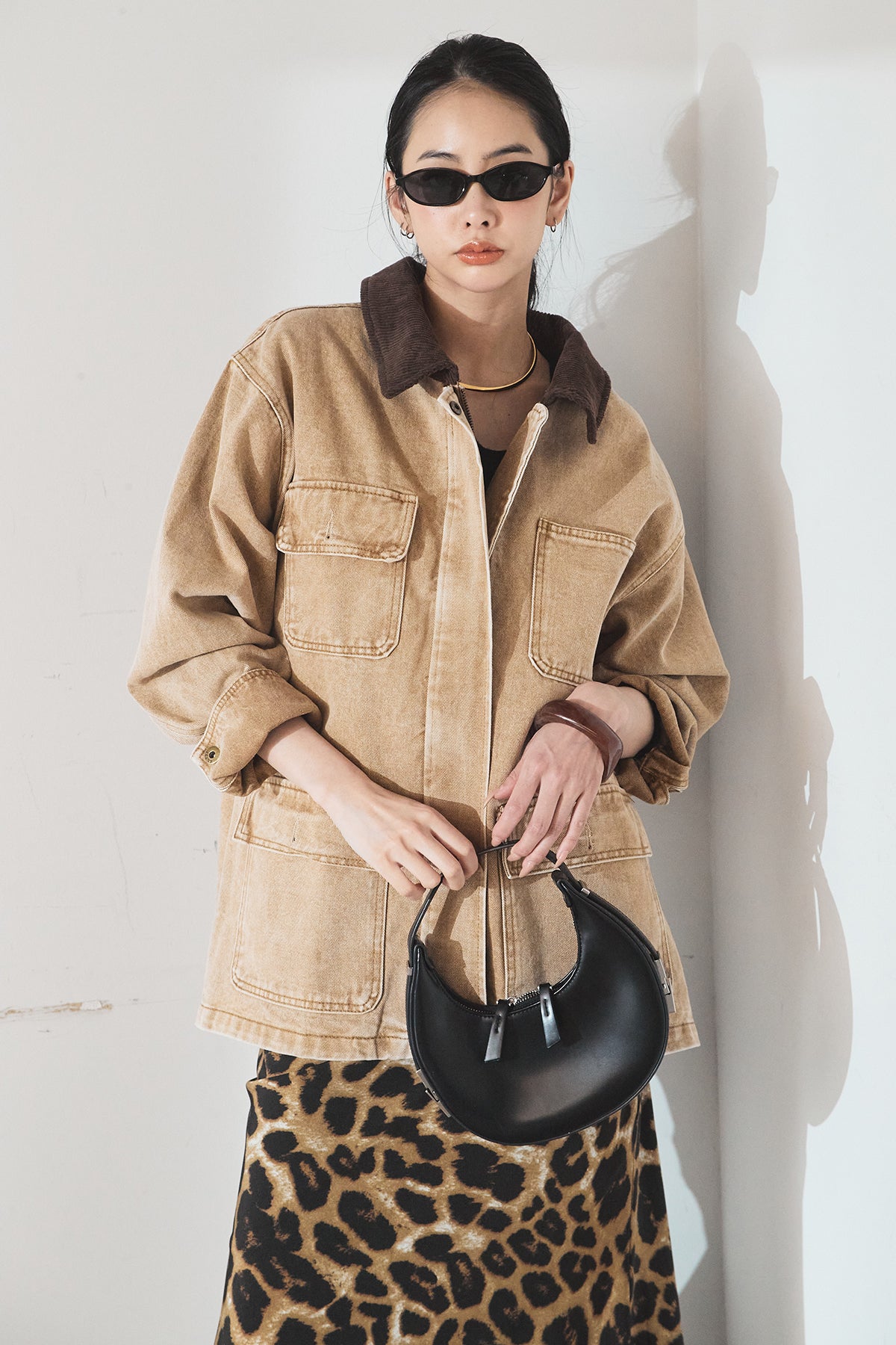 デニム調の素材に、衿元のコーデュロイがアクセントになったカバーオール。程よくラフな風合いがありながら、異素材の切り替えで季節感と表情をプラスします。ゆとりのあるシルエットで重ね着もしやすく、ジップ仕様で着脱もスムーズ。パンツにもスカートにも合わせやすく、デイリーに活躍する一枚です。