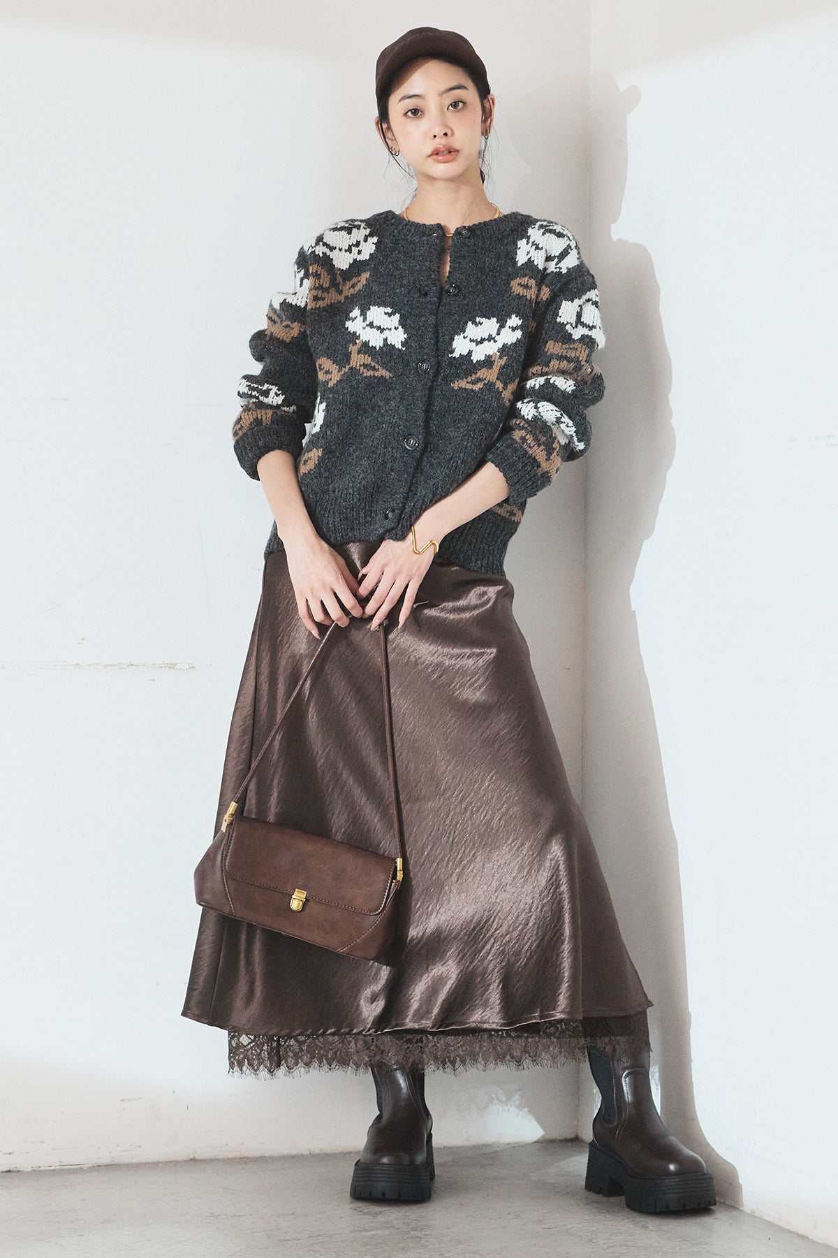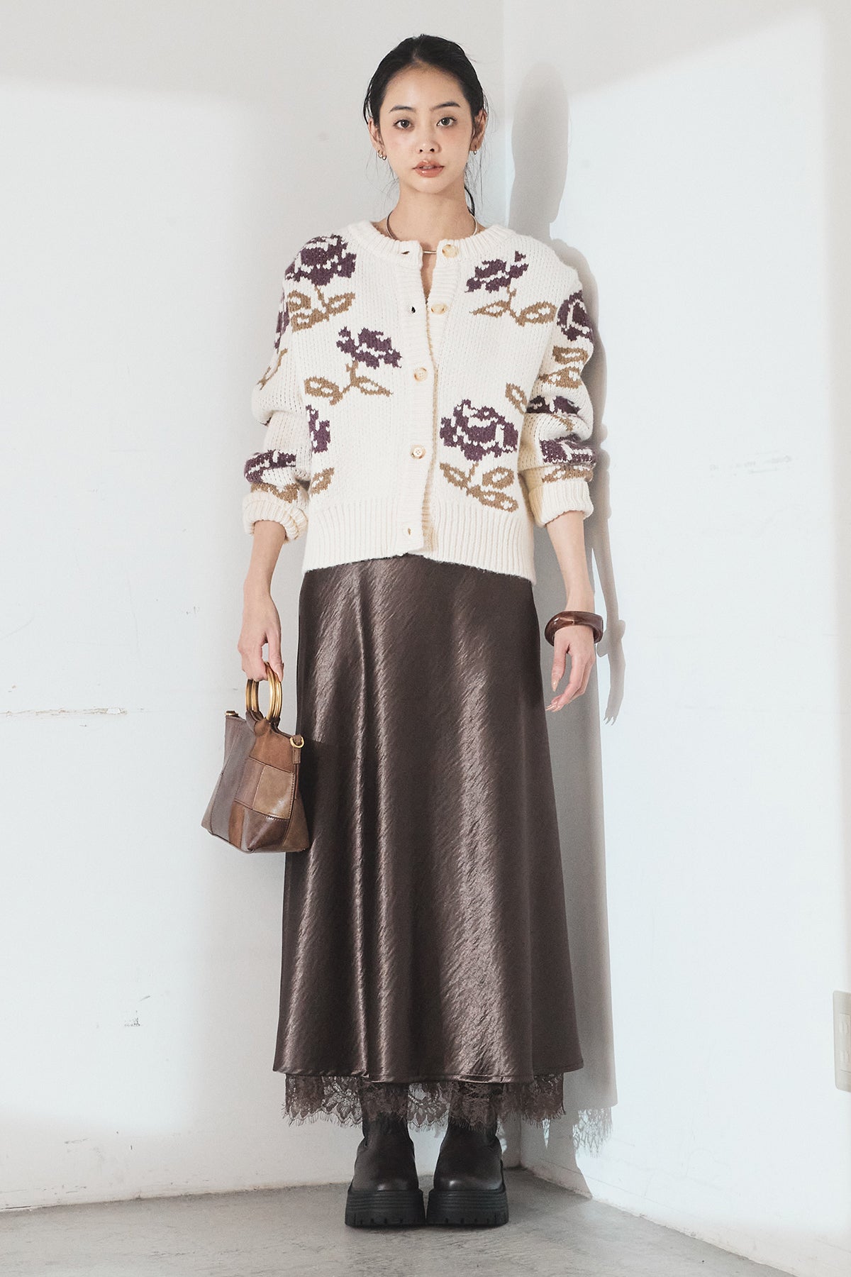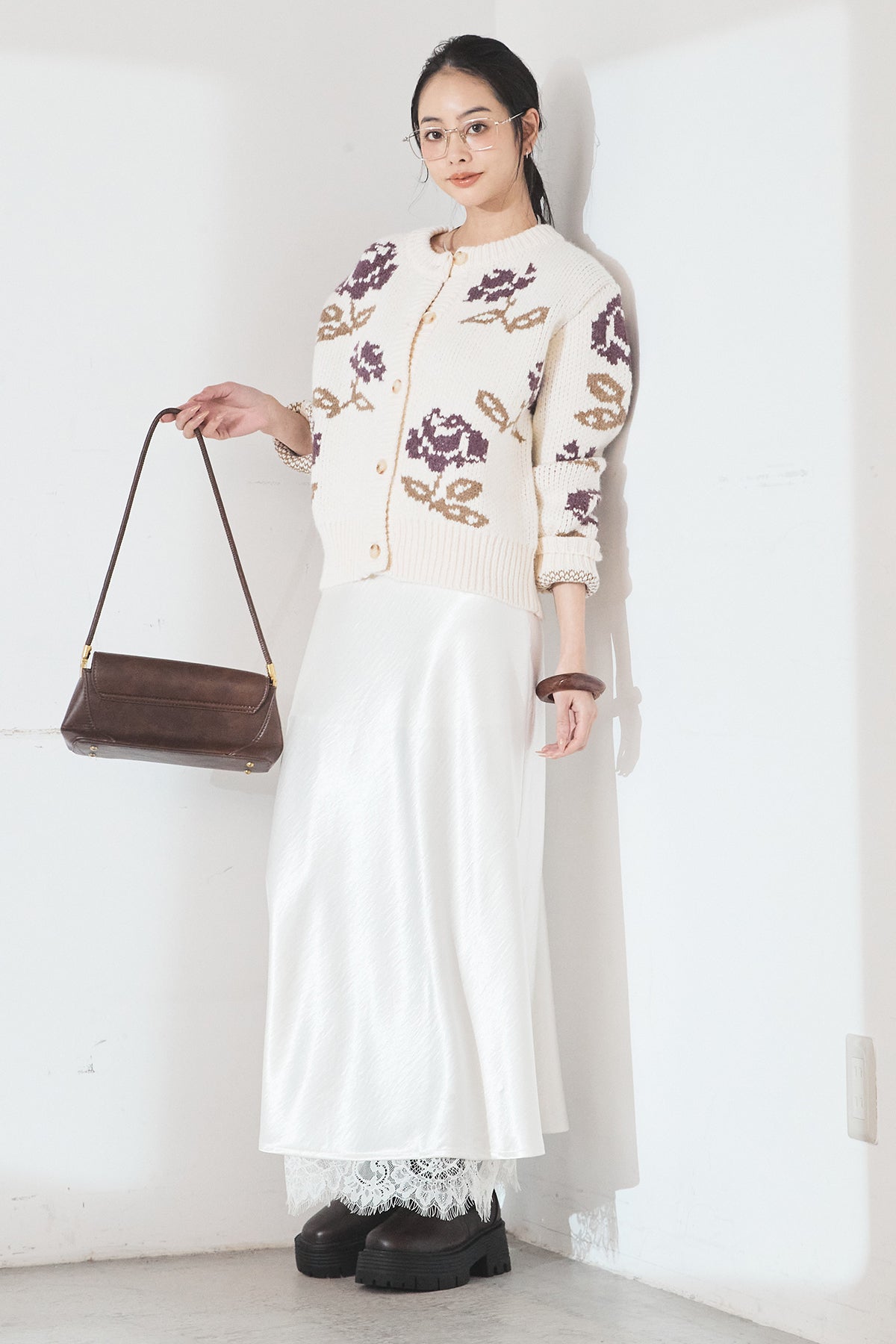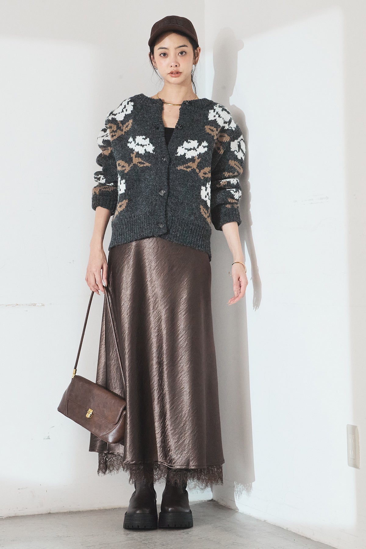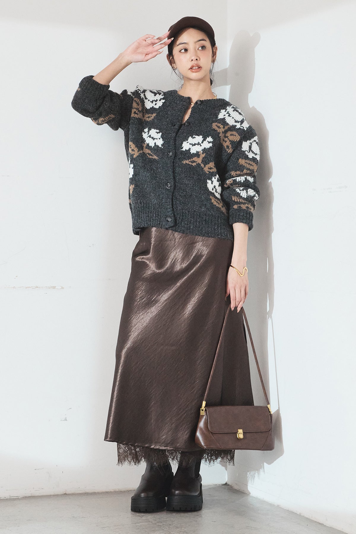[SET]花柄ジャガードニットカーディガン+裾レースデザインサテンスカート(2set)