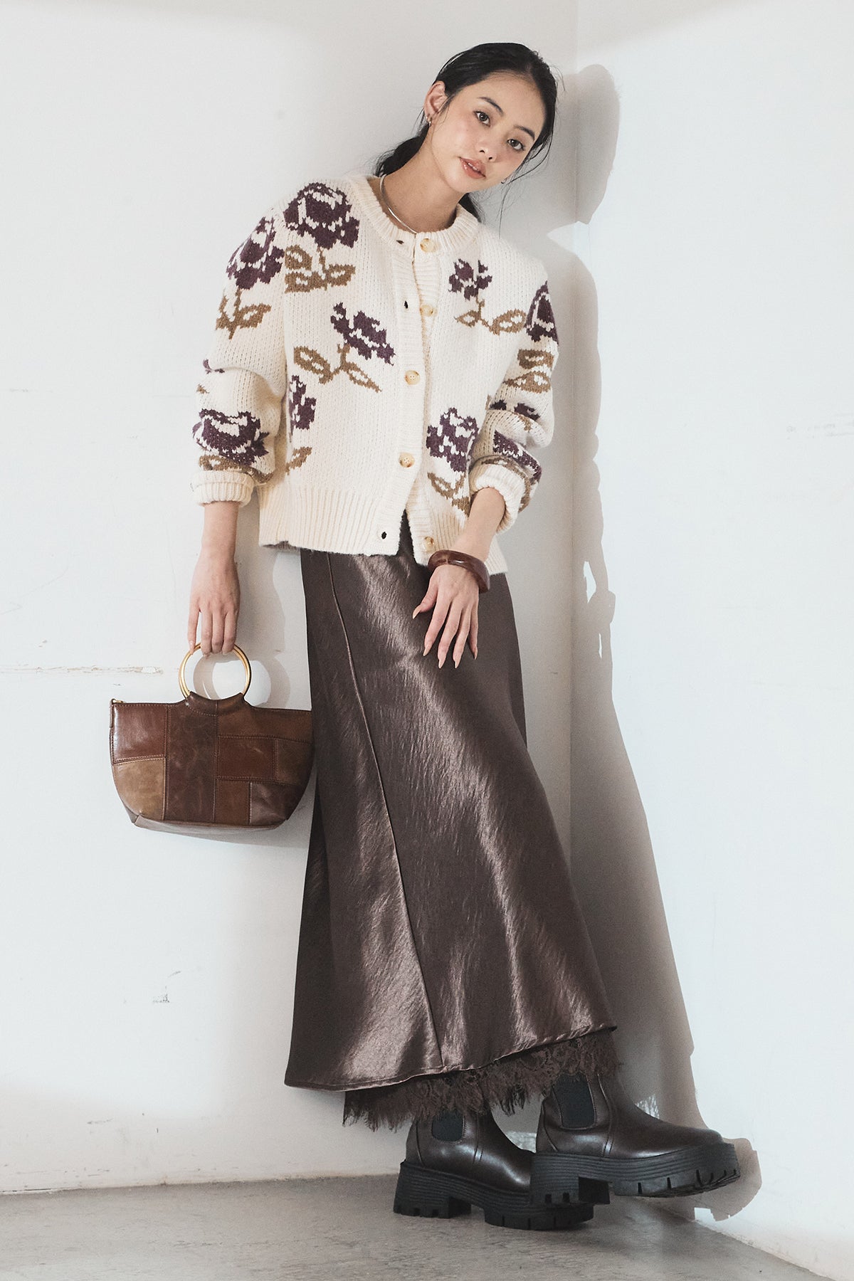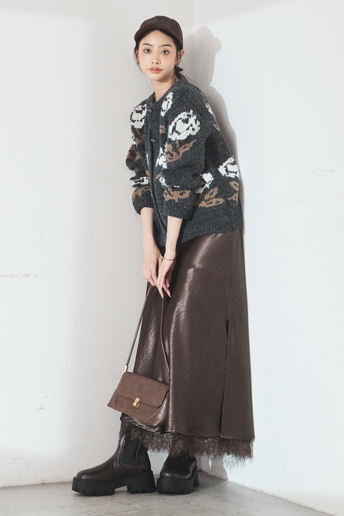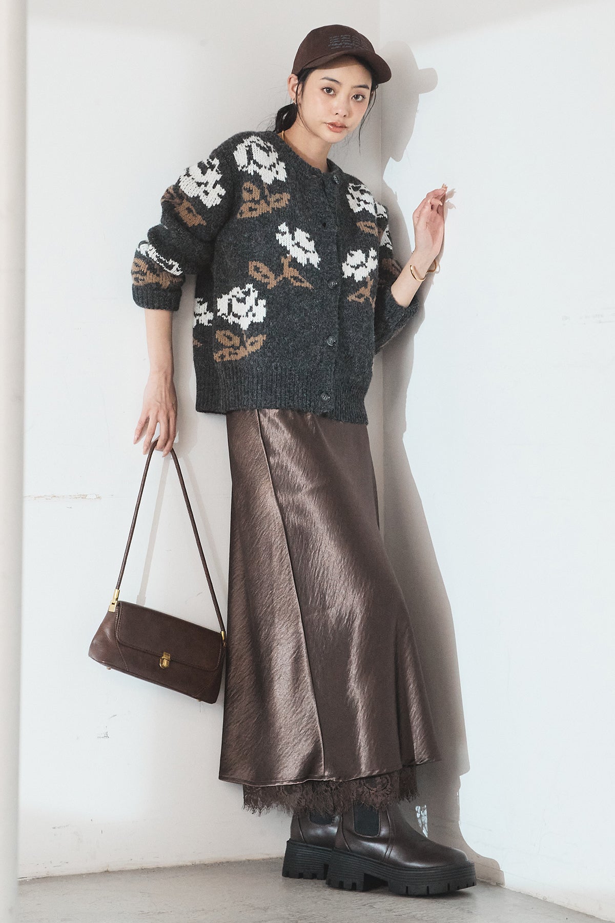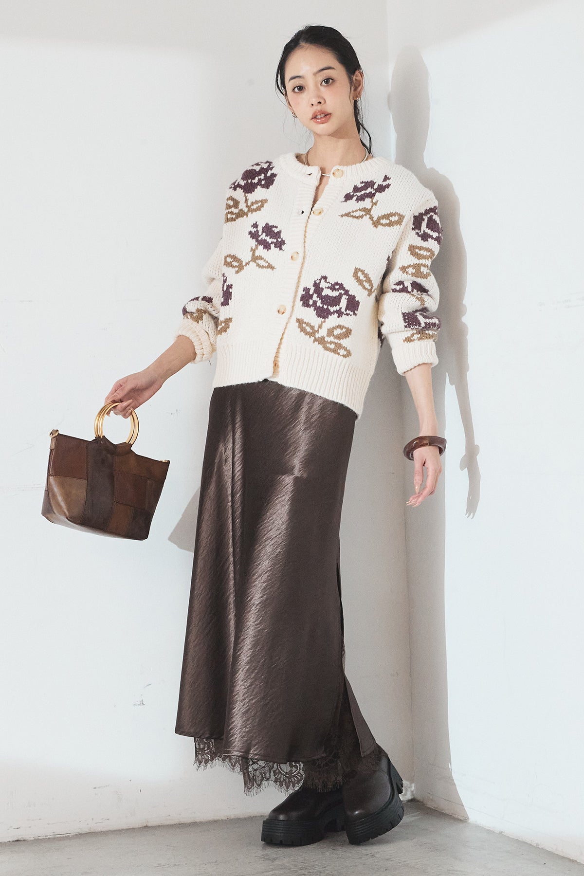 [SET]花柄ジャガードニットカーディガン+裾レースデザインサテンスカート(2set)