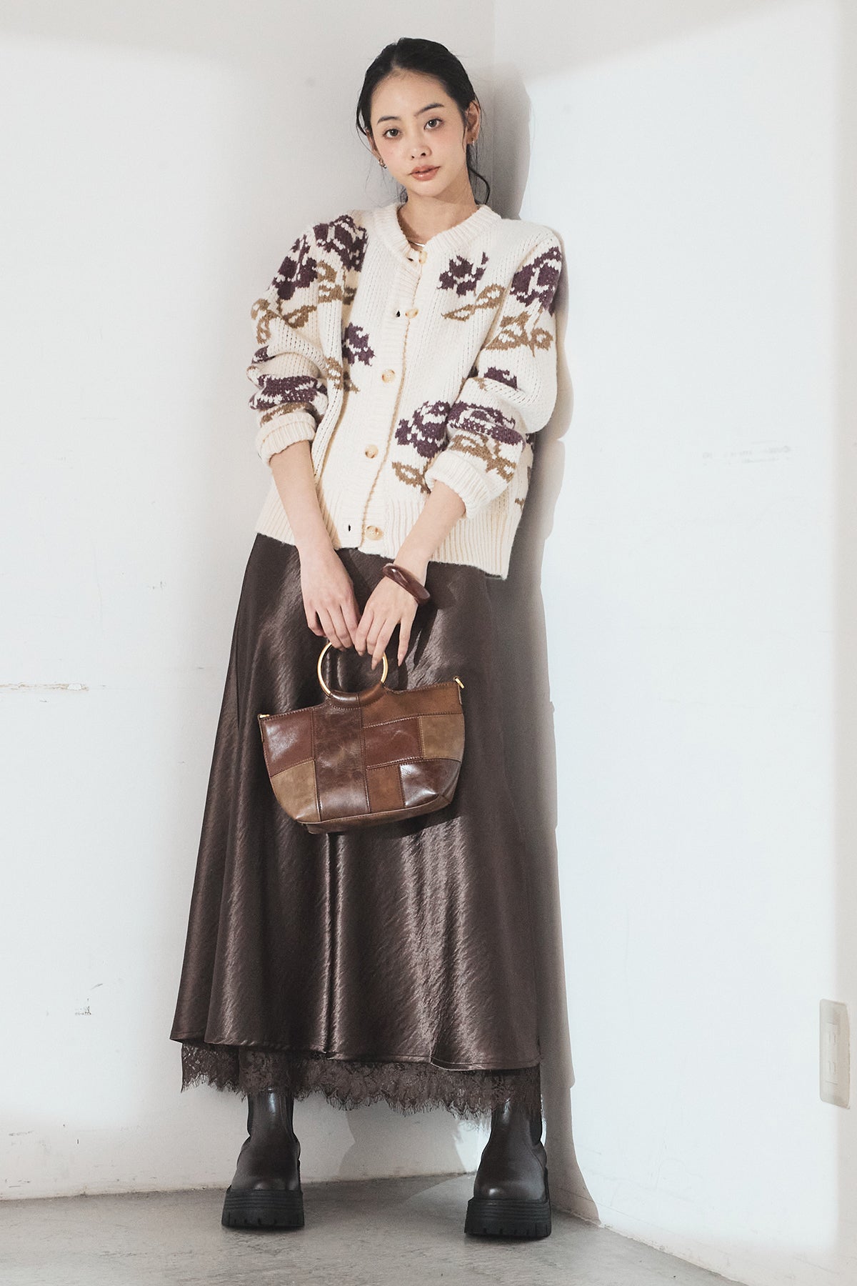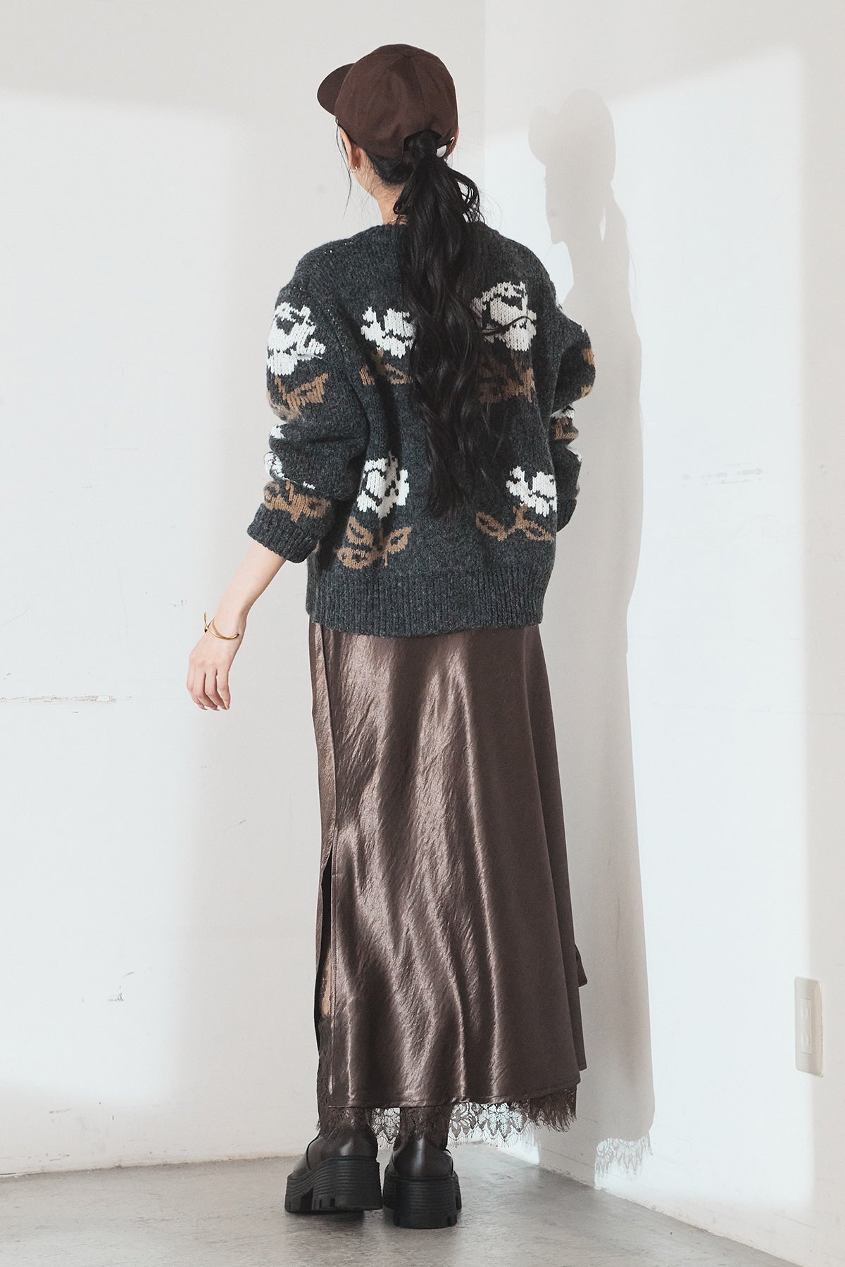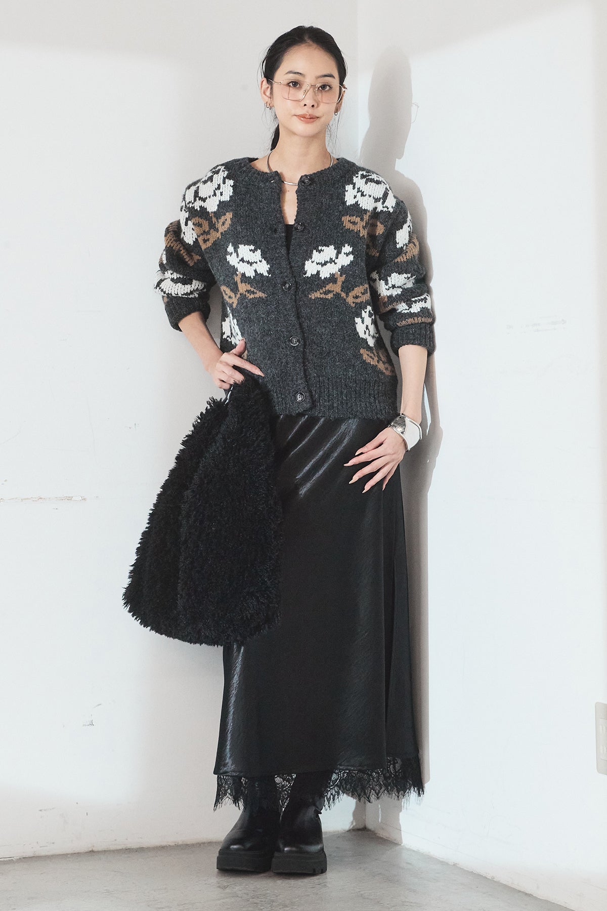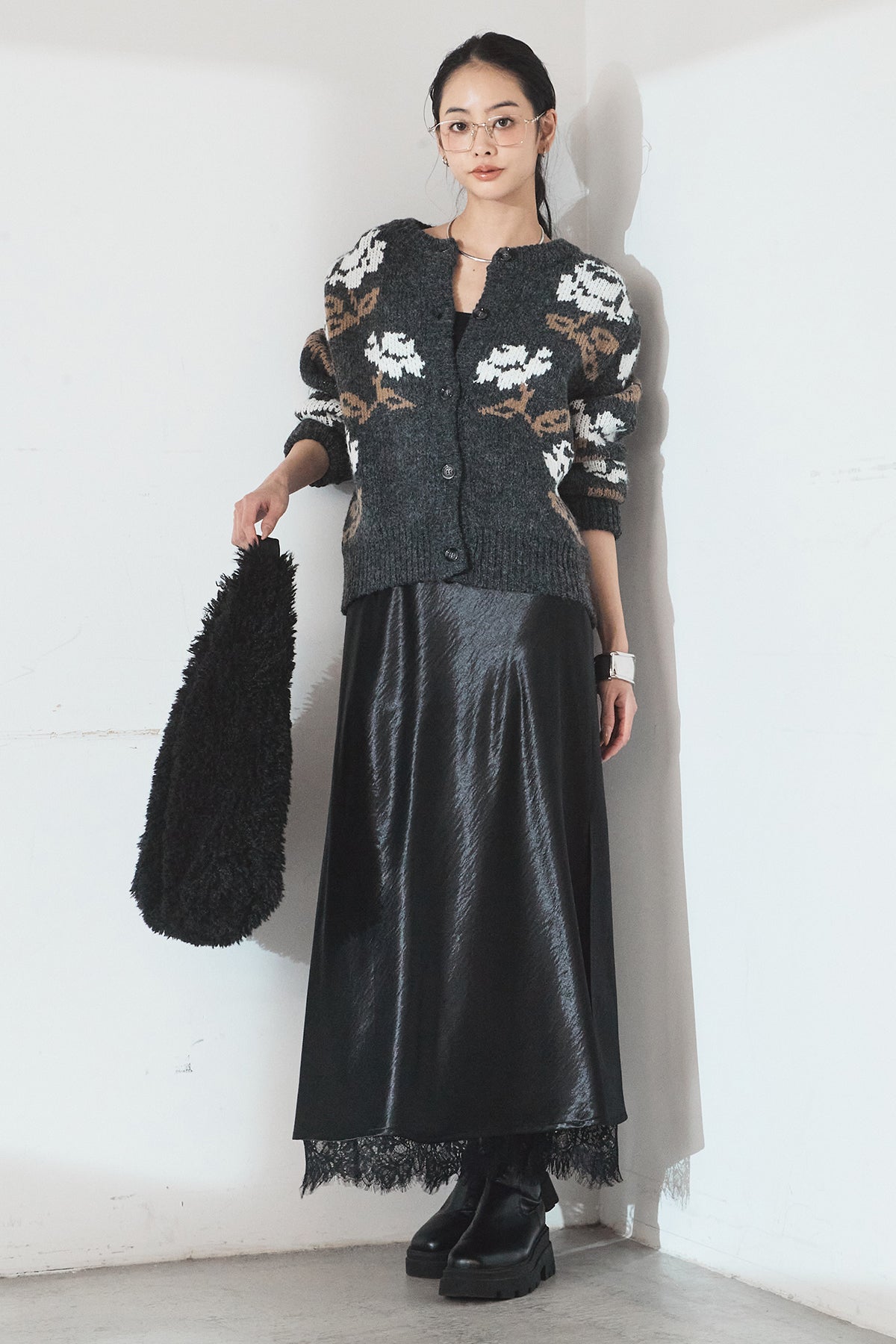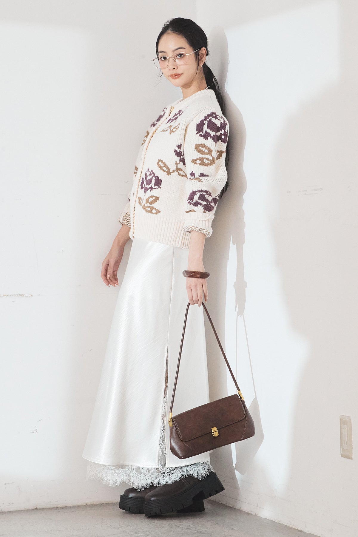 [SET]花柄ジャガードニットカーディガン+裾レースデザインサテンスカート(2set)