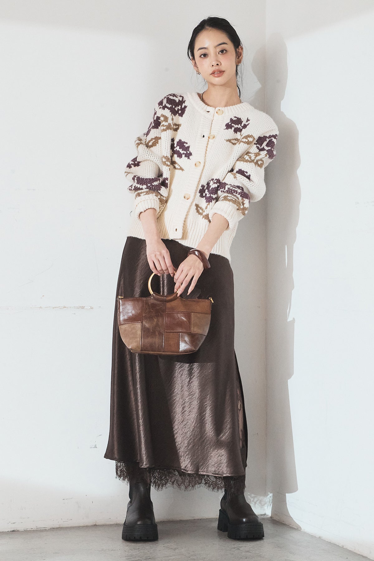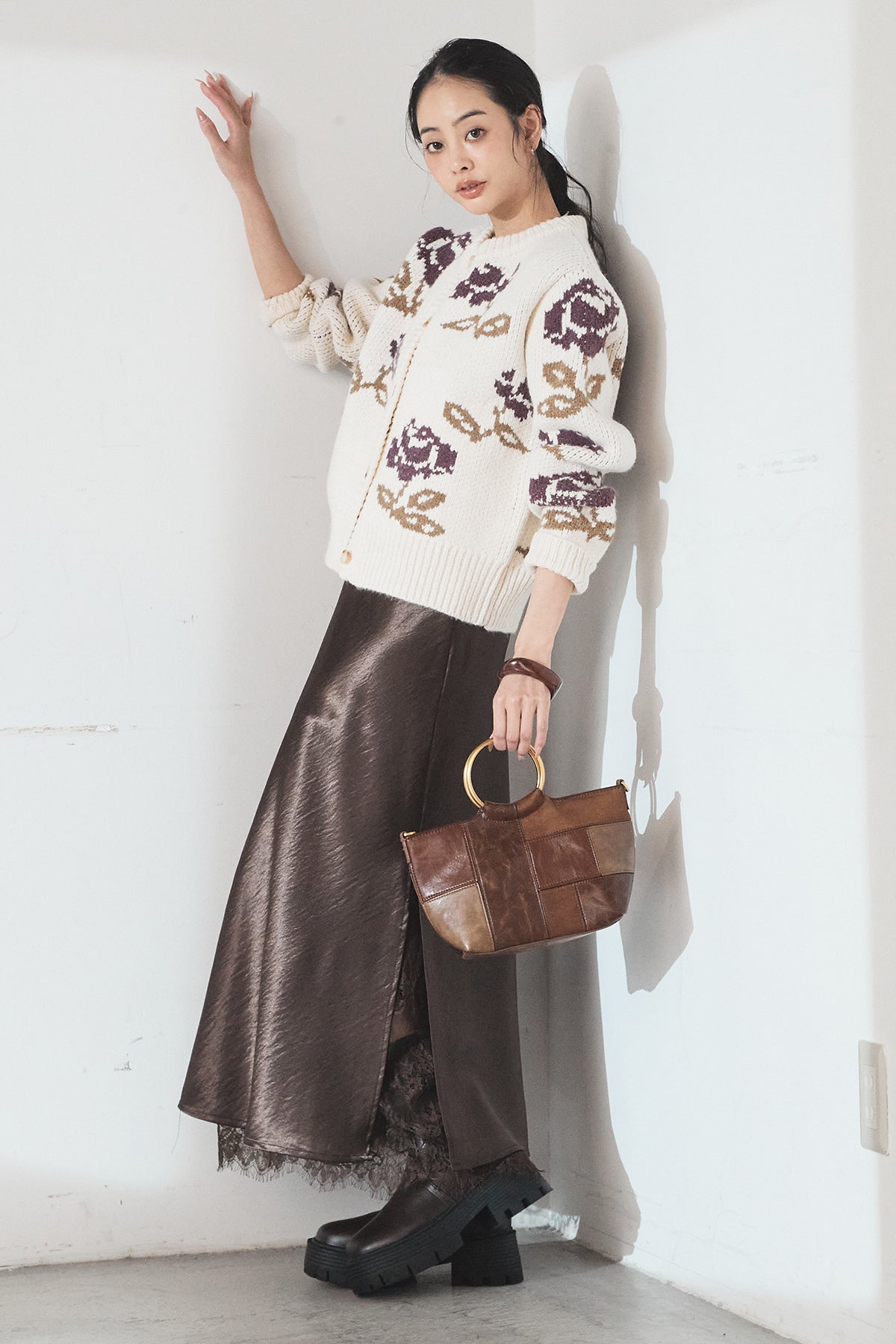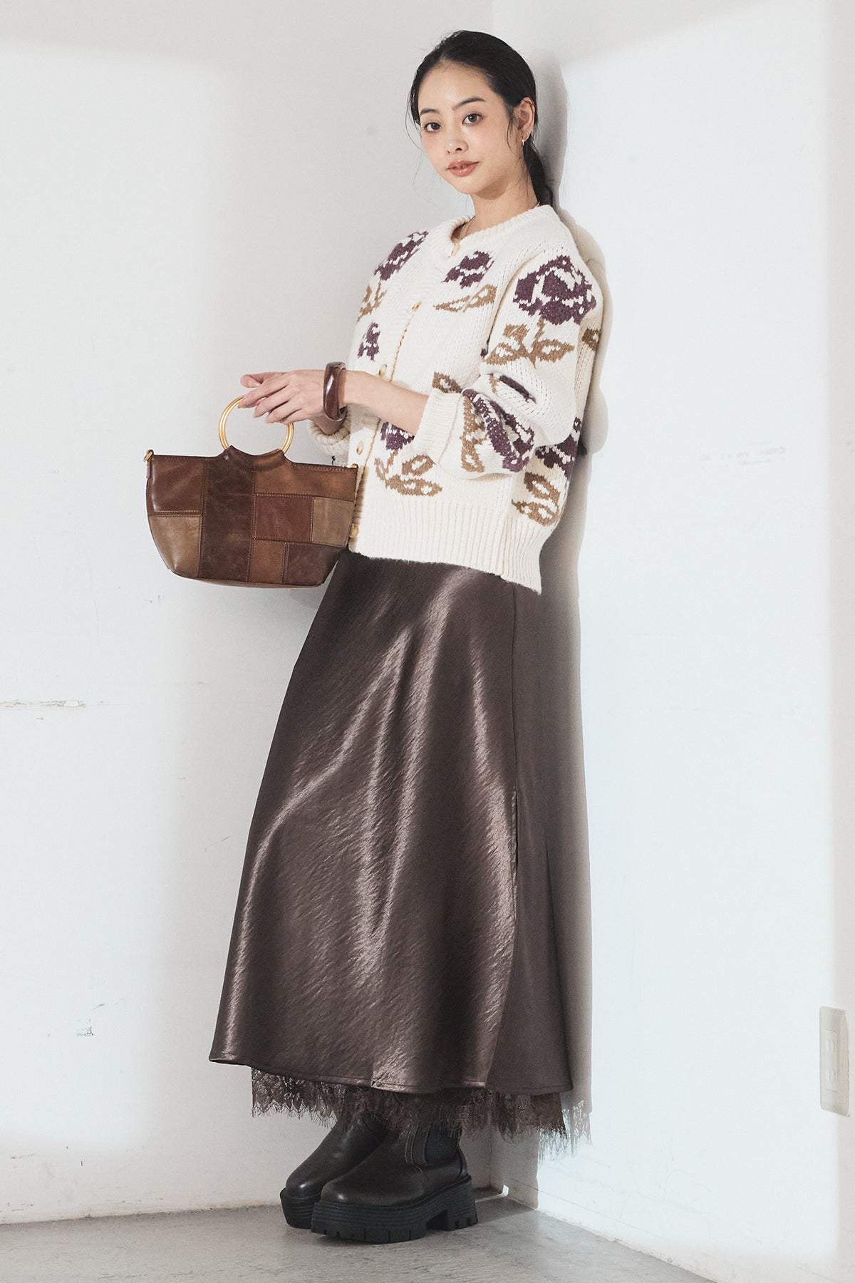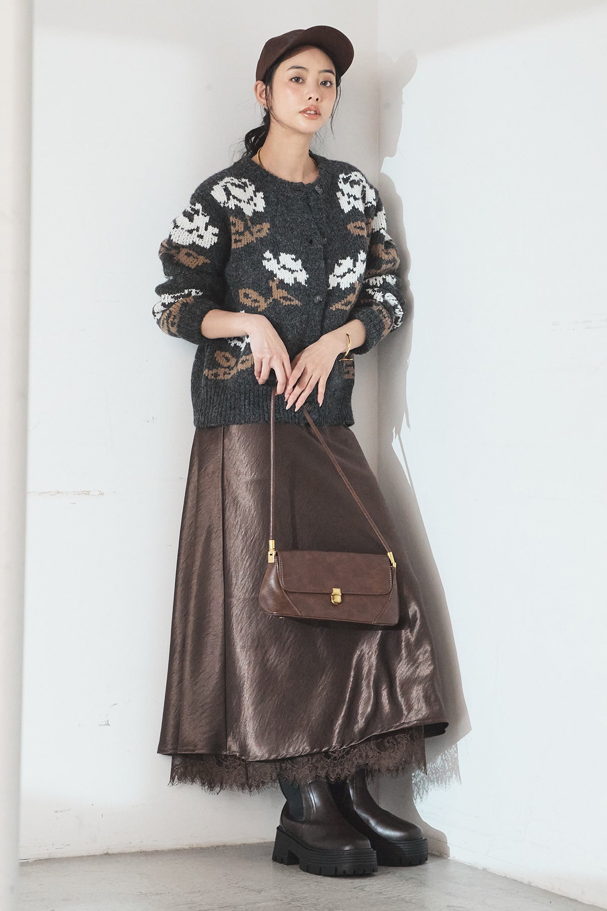 [SET]花柄ジャガードニットカーディガン+裾レースデザインサテンスカート(2set)