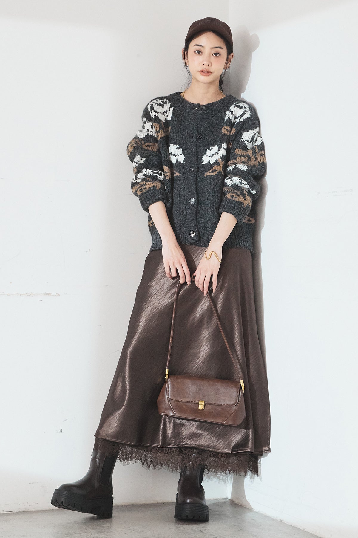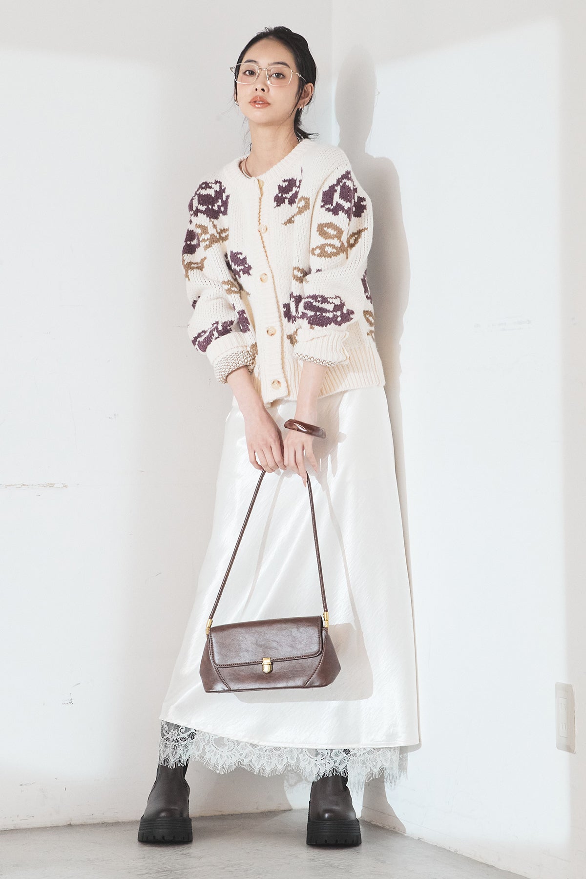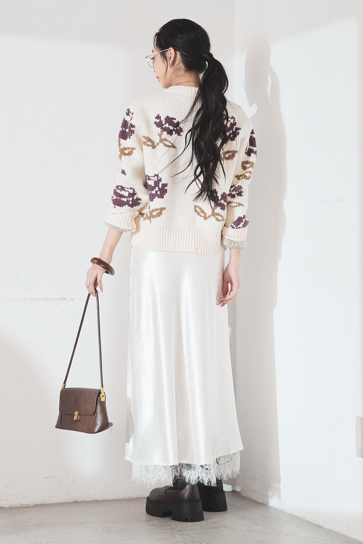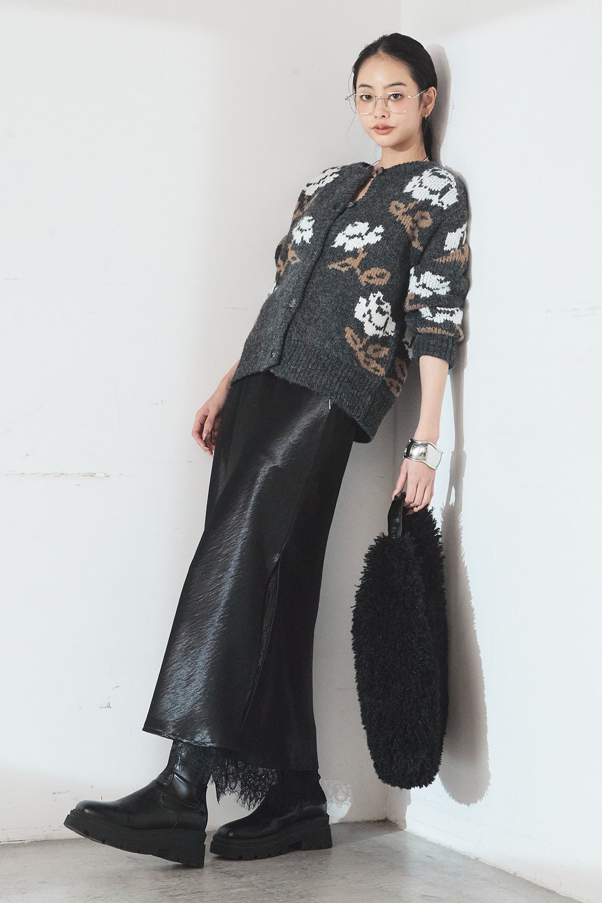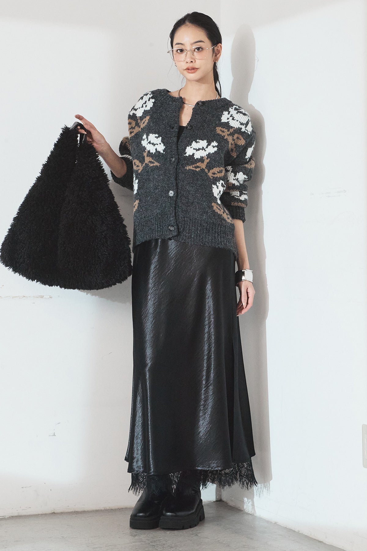 [SET]花柄ジャガードニットカーディガン+裾レースデザインサテンスカート(2set)