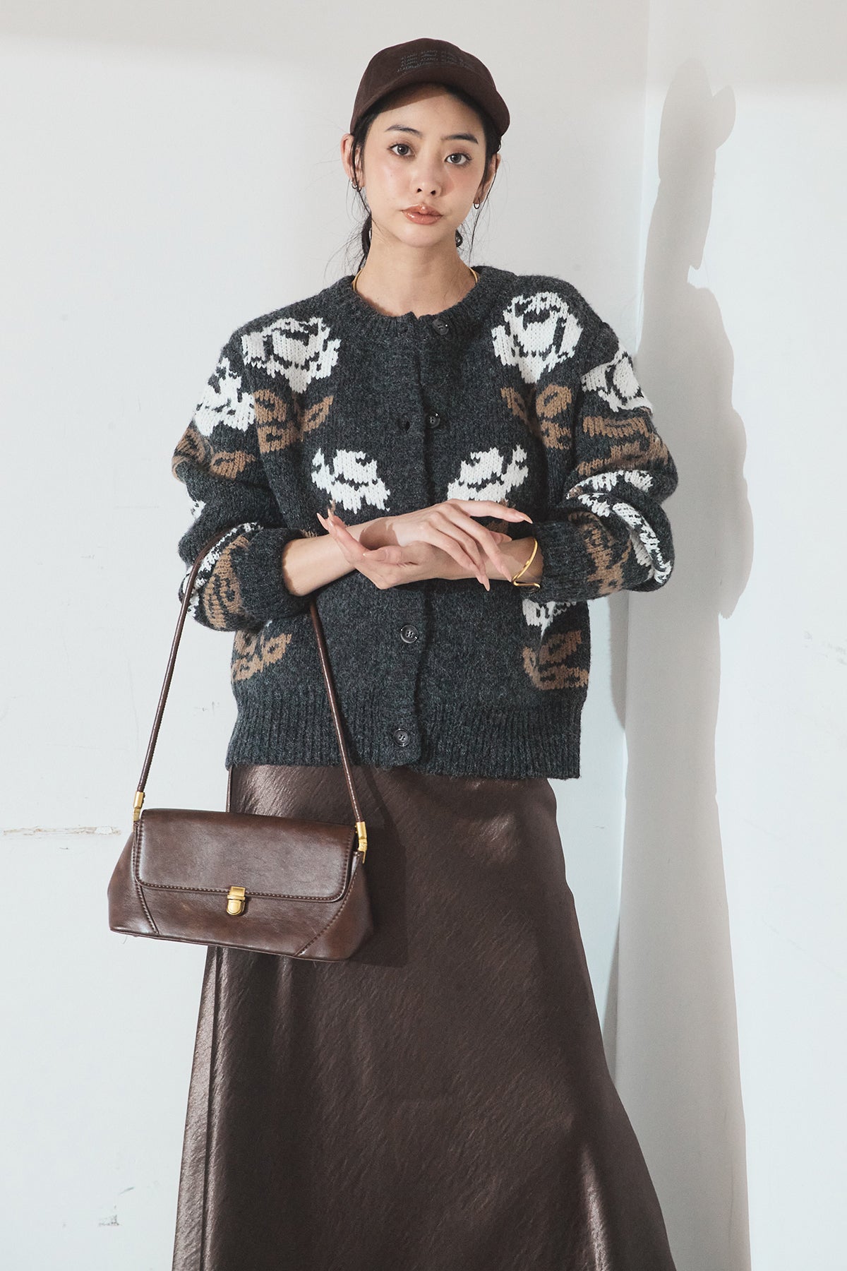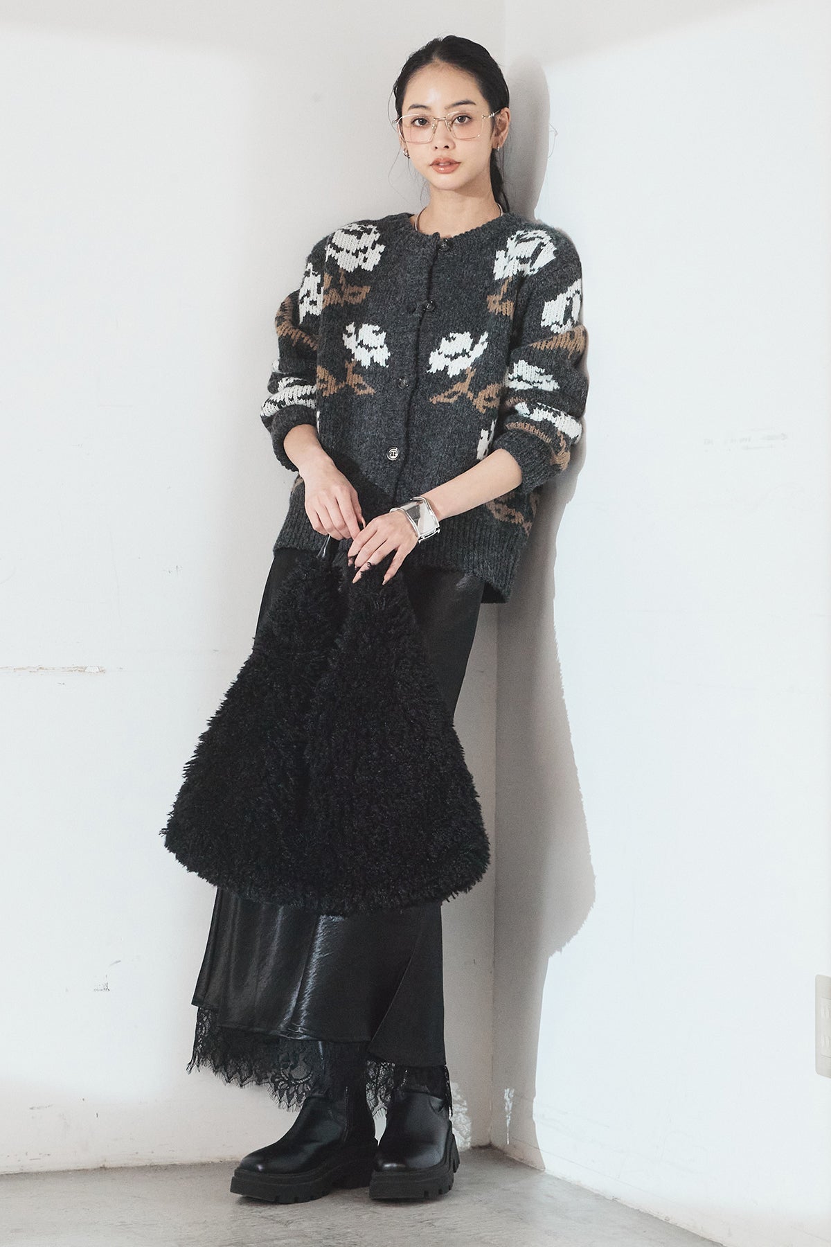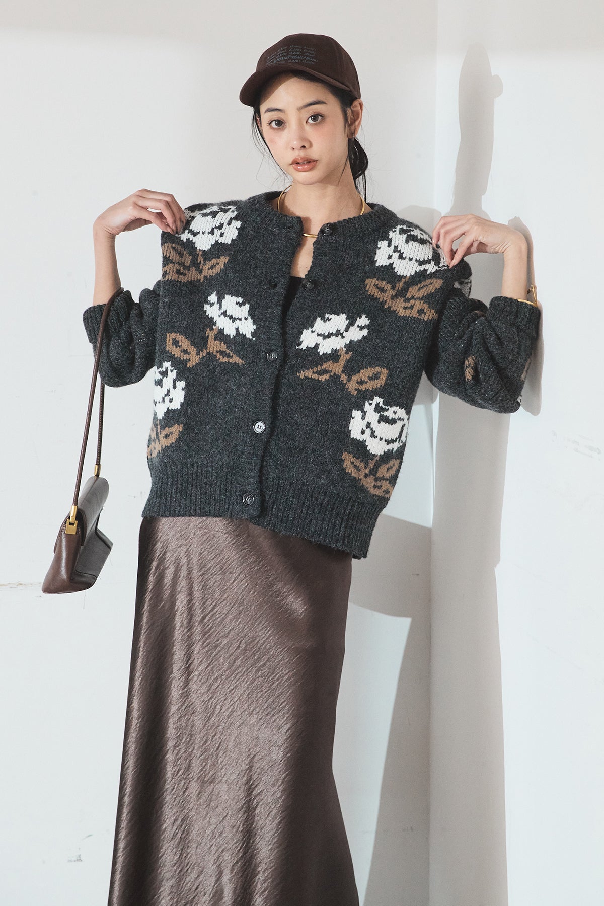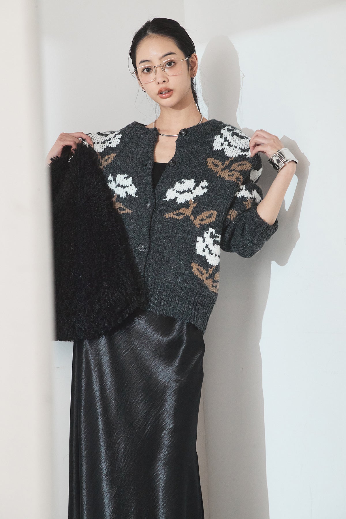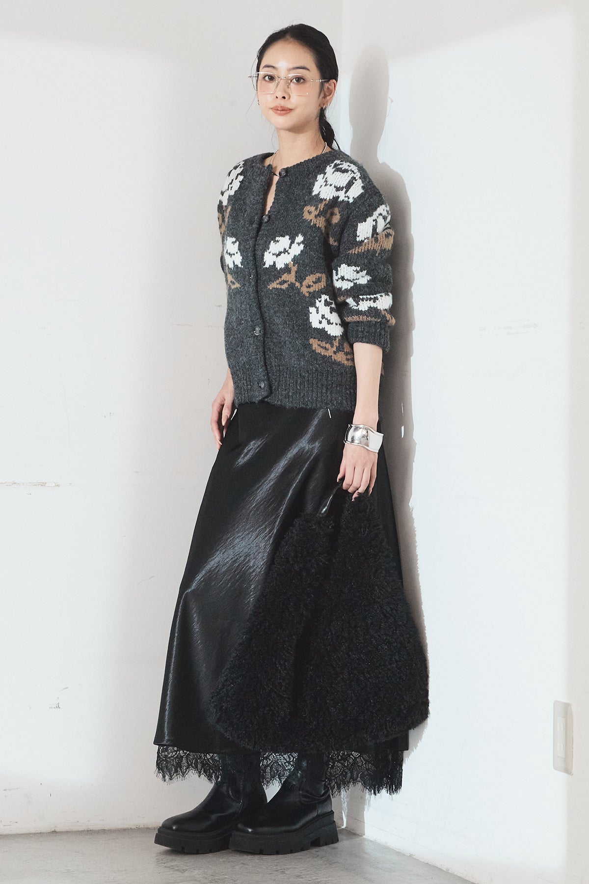 [SET]花柄ジャガードニットカーディガン+裾レースデザインサテンスカート(2set)
