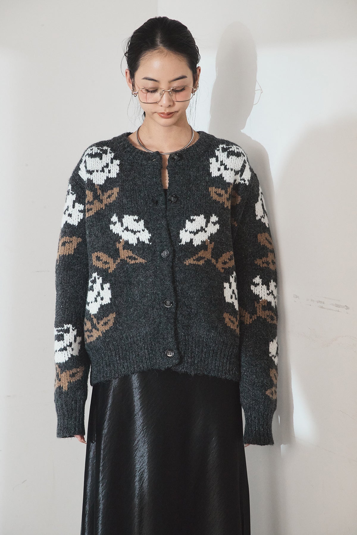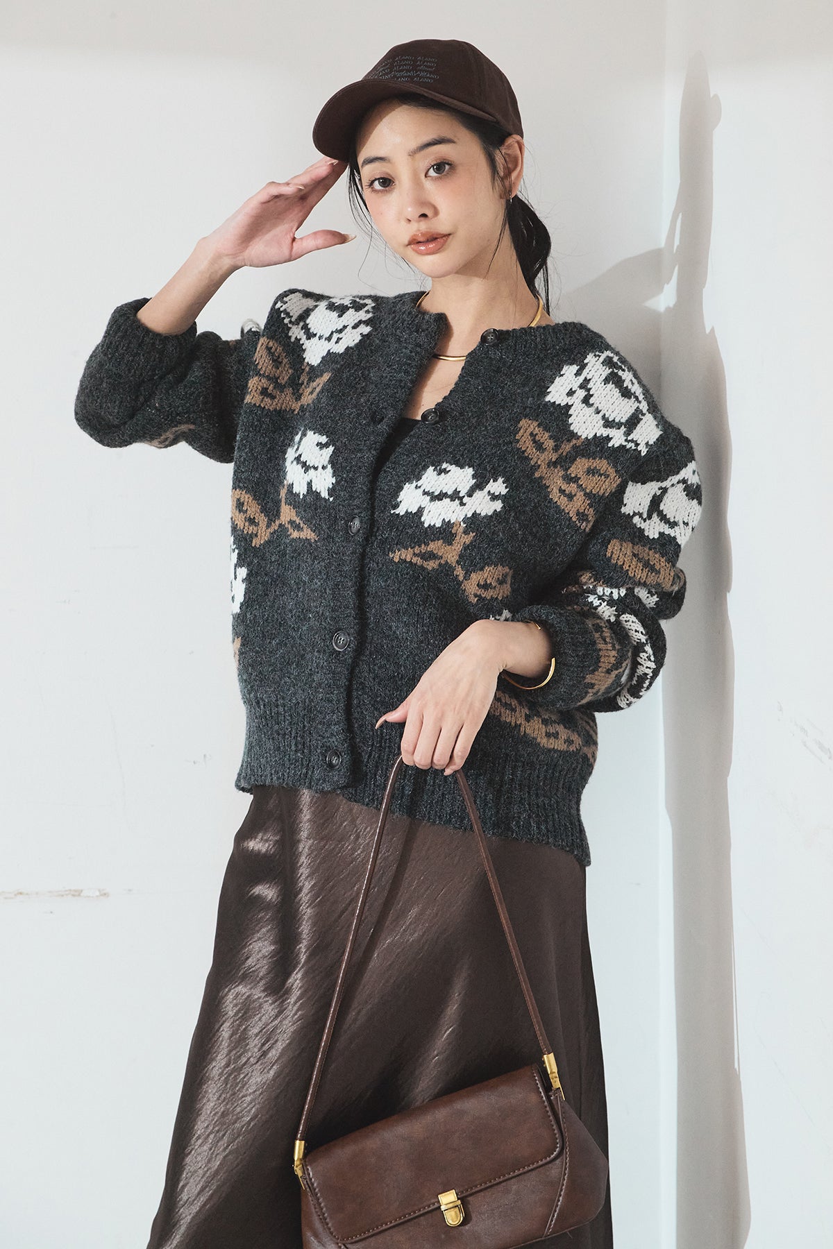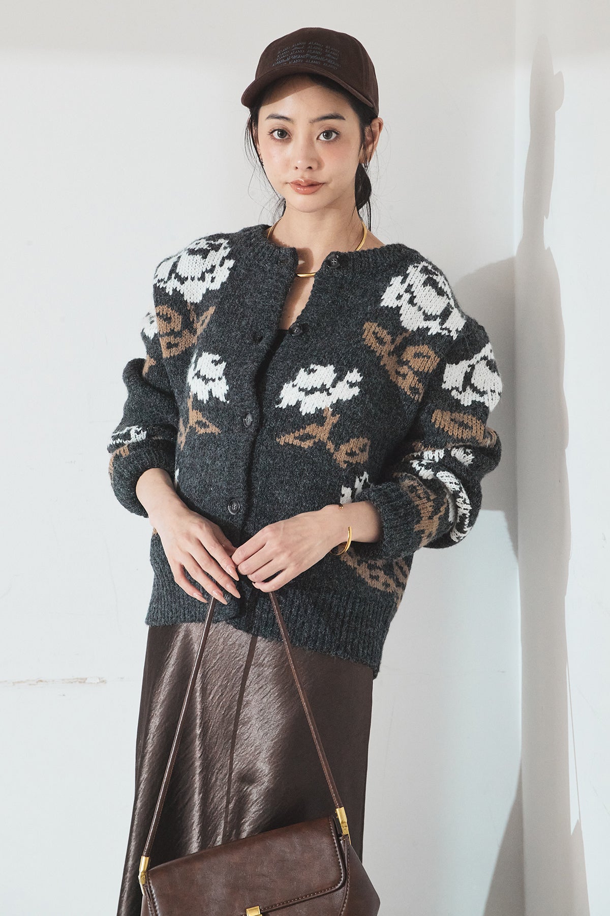 ジャガード織りで表現した花柄が、スタイリングにやさしい華やかさを添えるニットカーディガン。程よく存在感のある柄ながら、落ち着いた配色で大人っぽく仕上げています。コンパクトすぎないシルエットでバランスが取りやすく、ボタンを留めても羽織りとしても活躍。シンプルなボトムを合わせるだけで、季節感のある着こなしが完成する一枚です。
