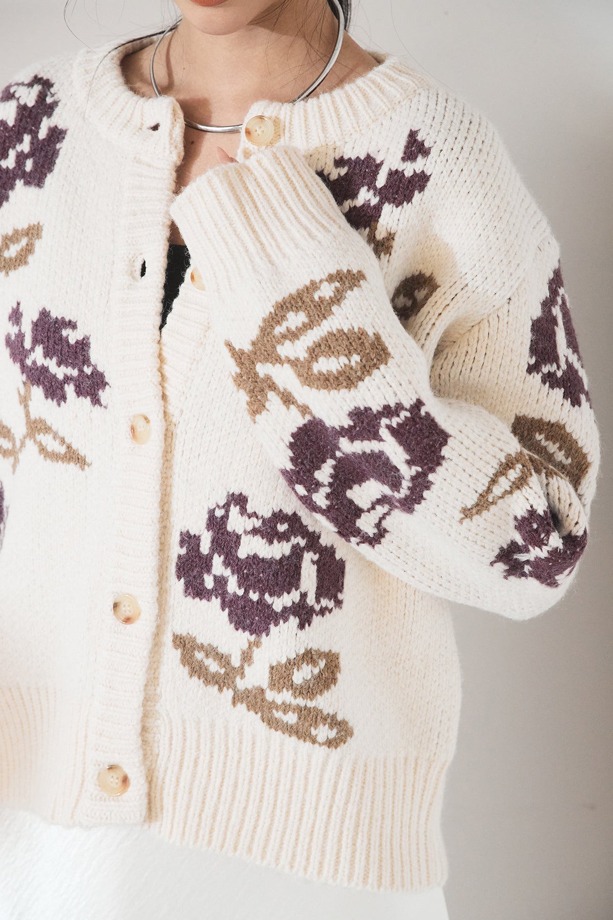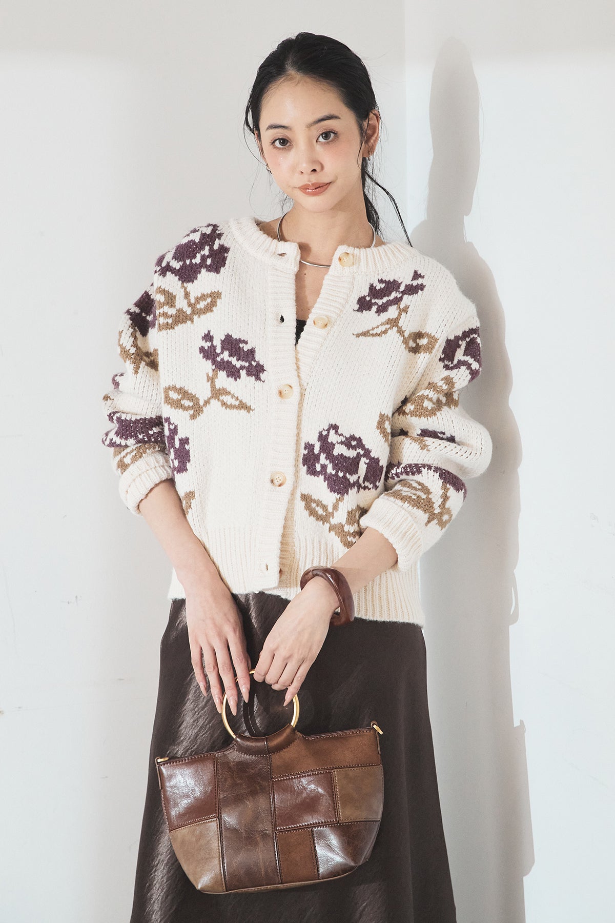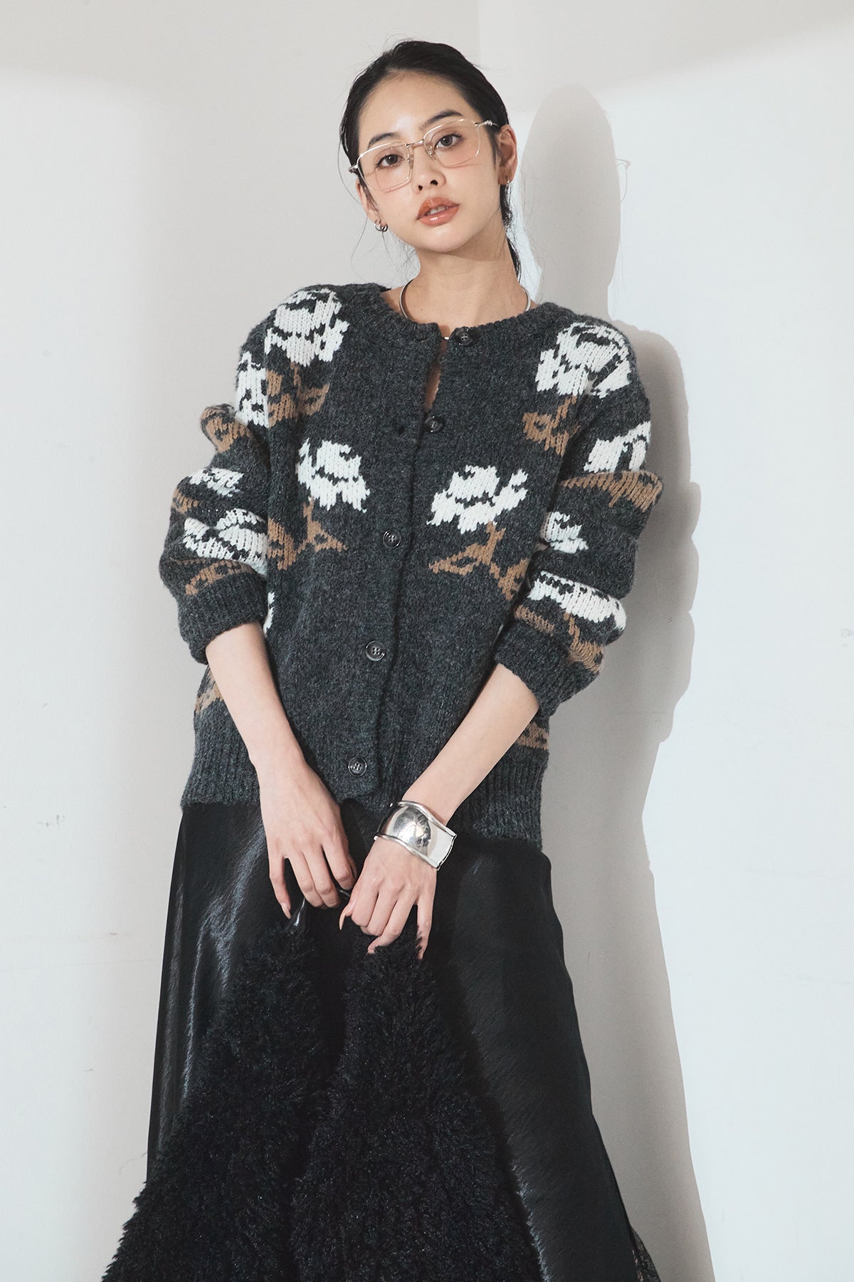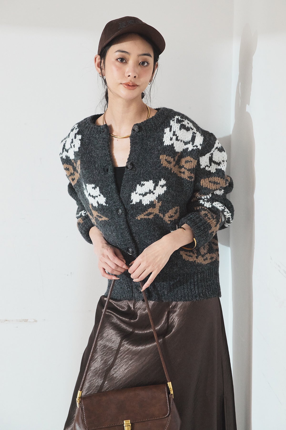 ジャガード織りで表現した花柄が、スタイリングにやさしい華やかさを添えるニットカーディガン。程よく存在感のある柄ながら、落ち着いた配色で大人っぽく仕上げています。コンパクトすぎないシルエットでバランスが取りやすく、ボタンを留めても羽織りとしても活躍。シンプルなボトムを合わせるだけで、季節感のある着こなしが完成する一枚です。