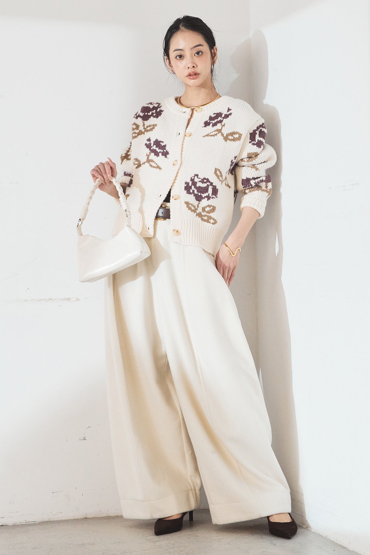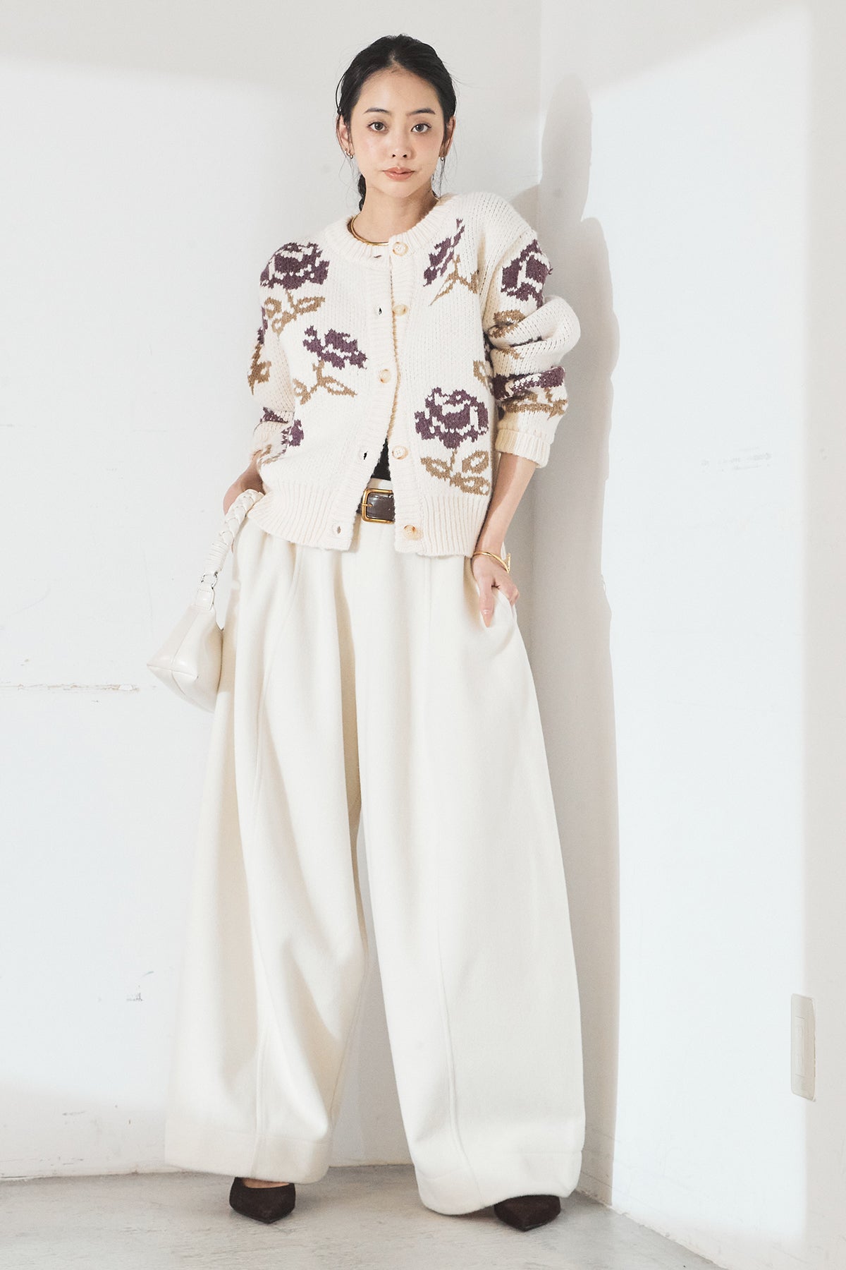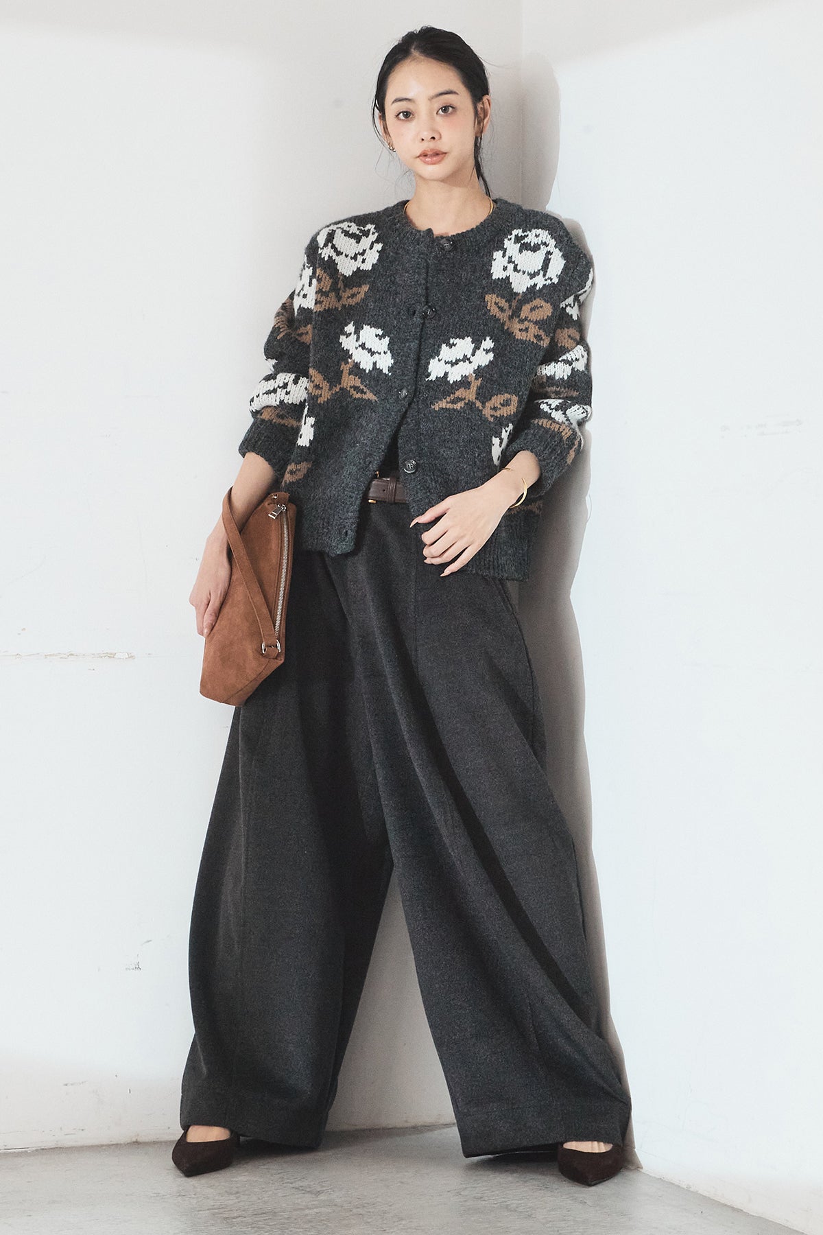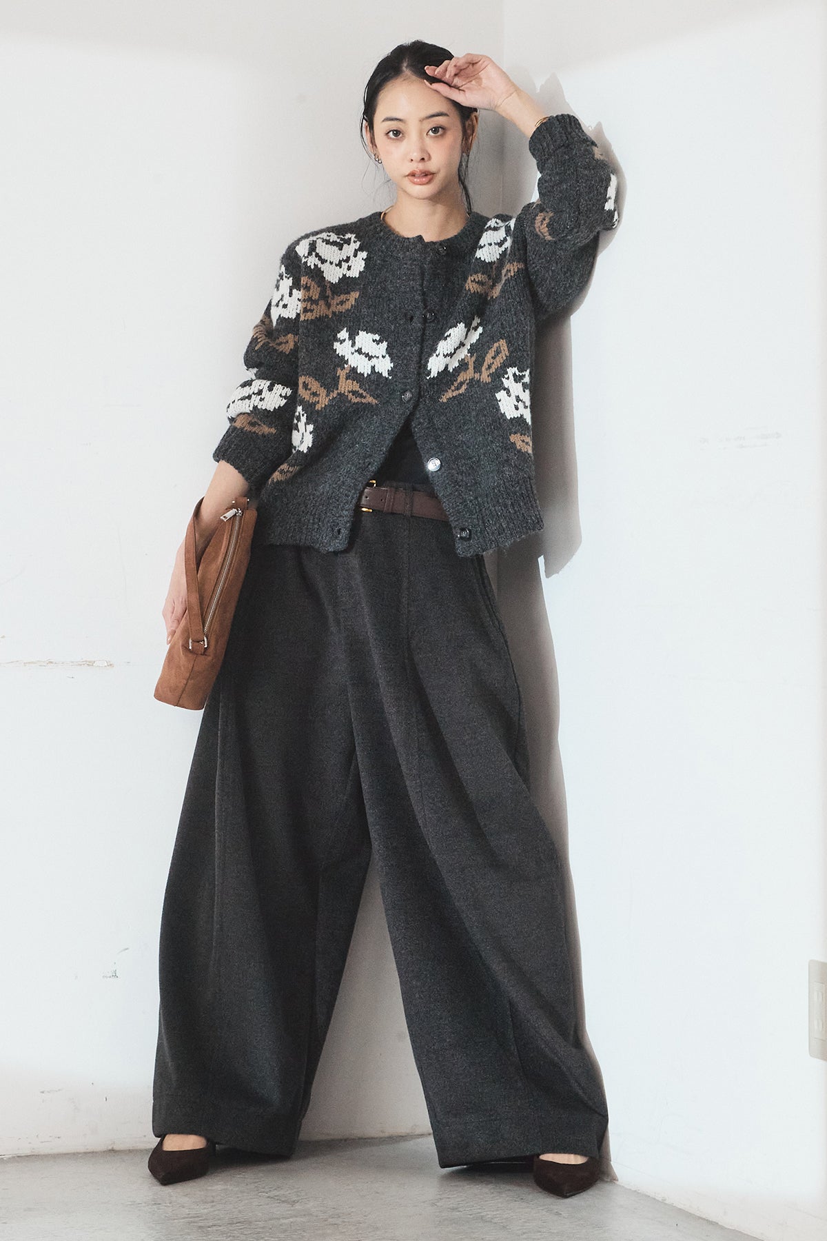 [SET]花柄ジャガードニットカーディガン+ウールタッチカーブワイドパンツ(2set)