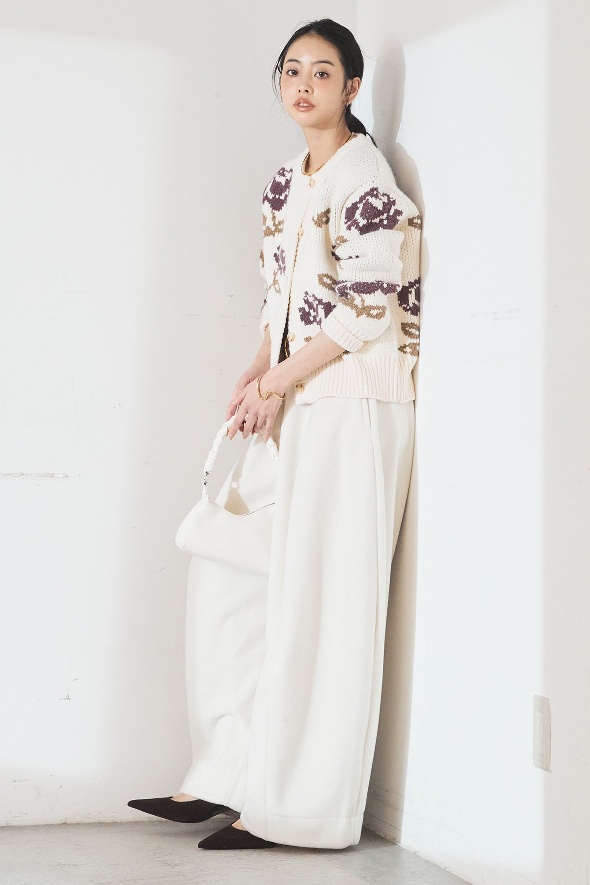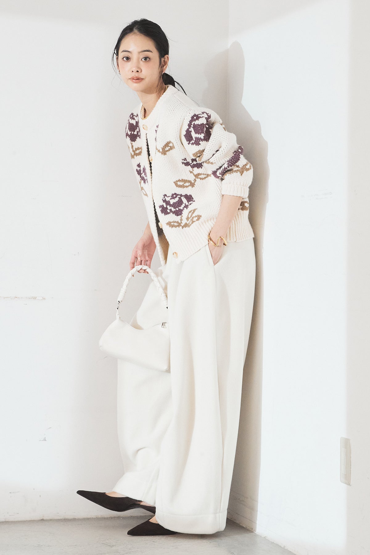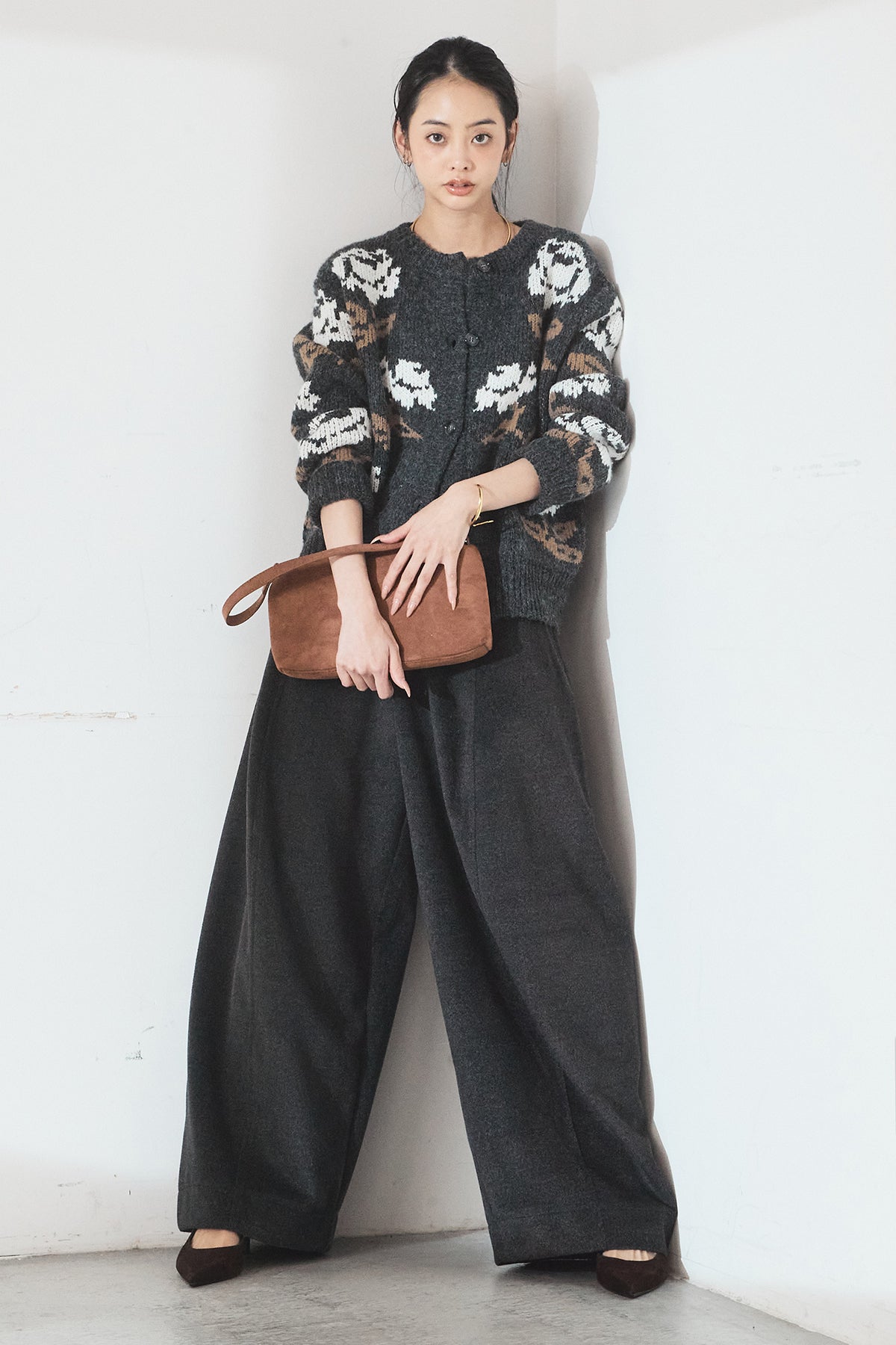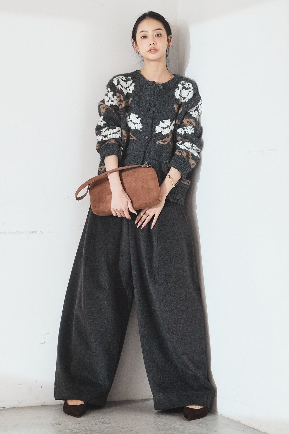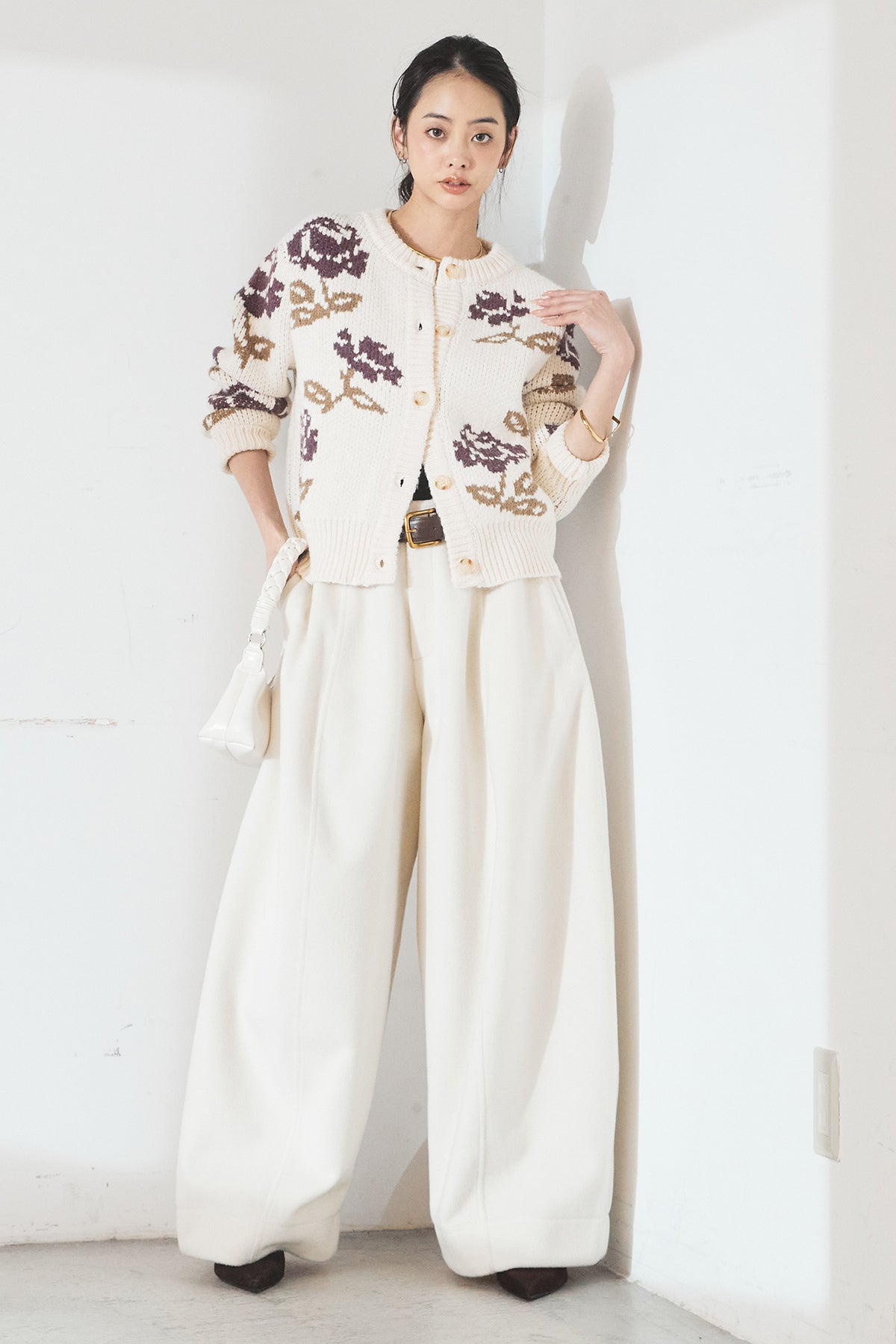 [SET]花柄ジャガードニットカーディガン+ウールタッチカーブワイドパンツ(2set)