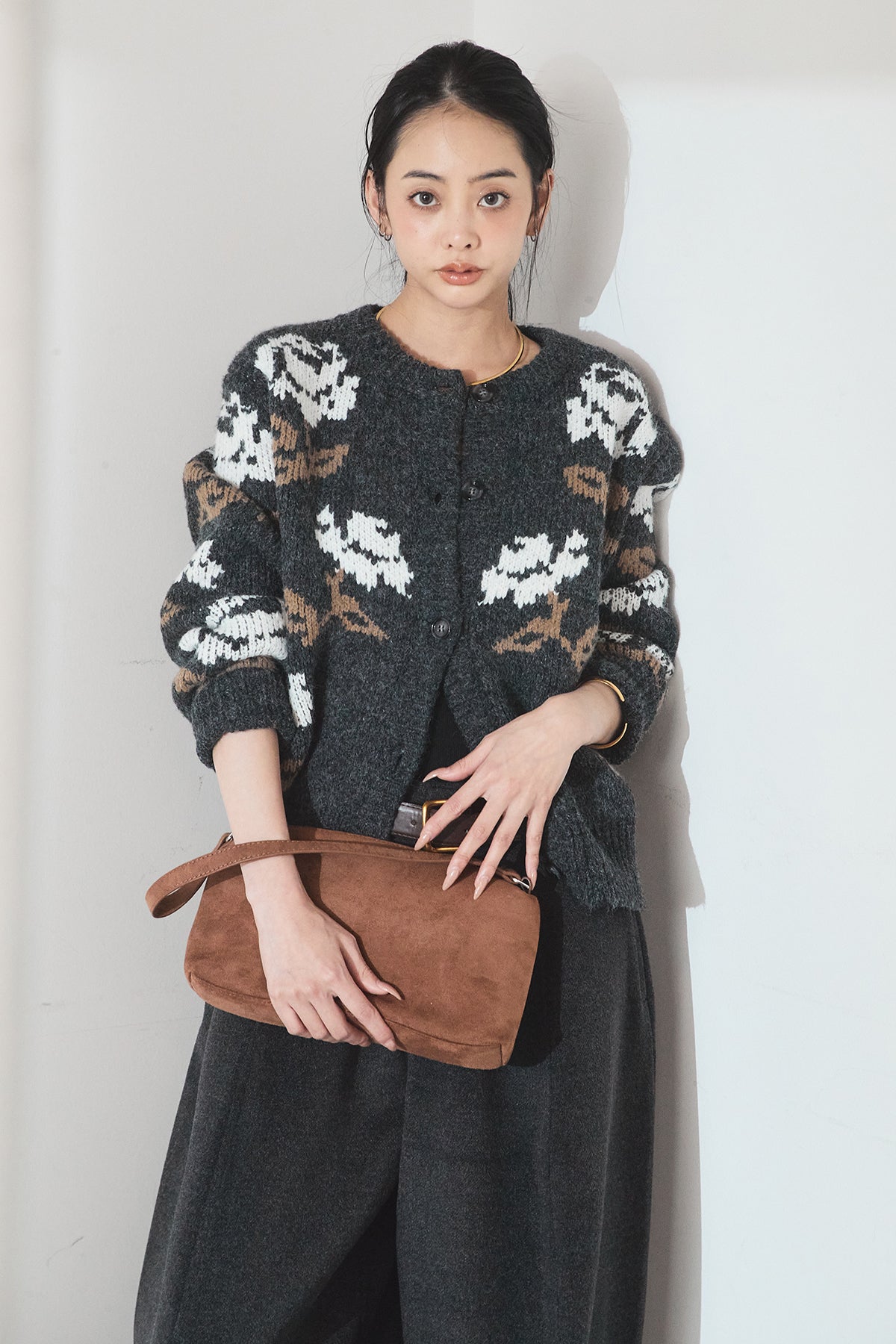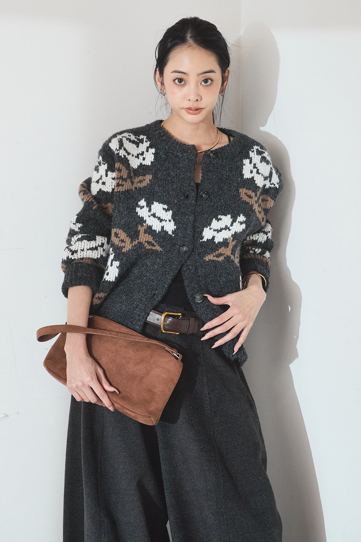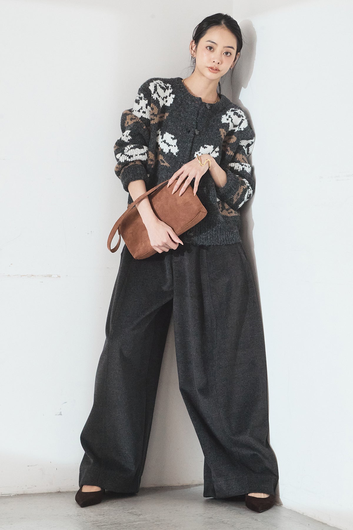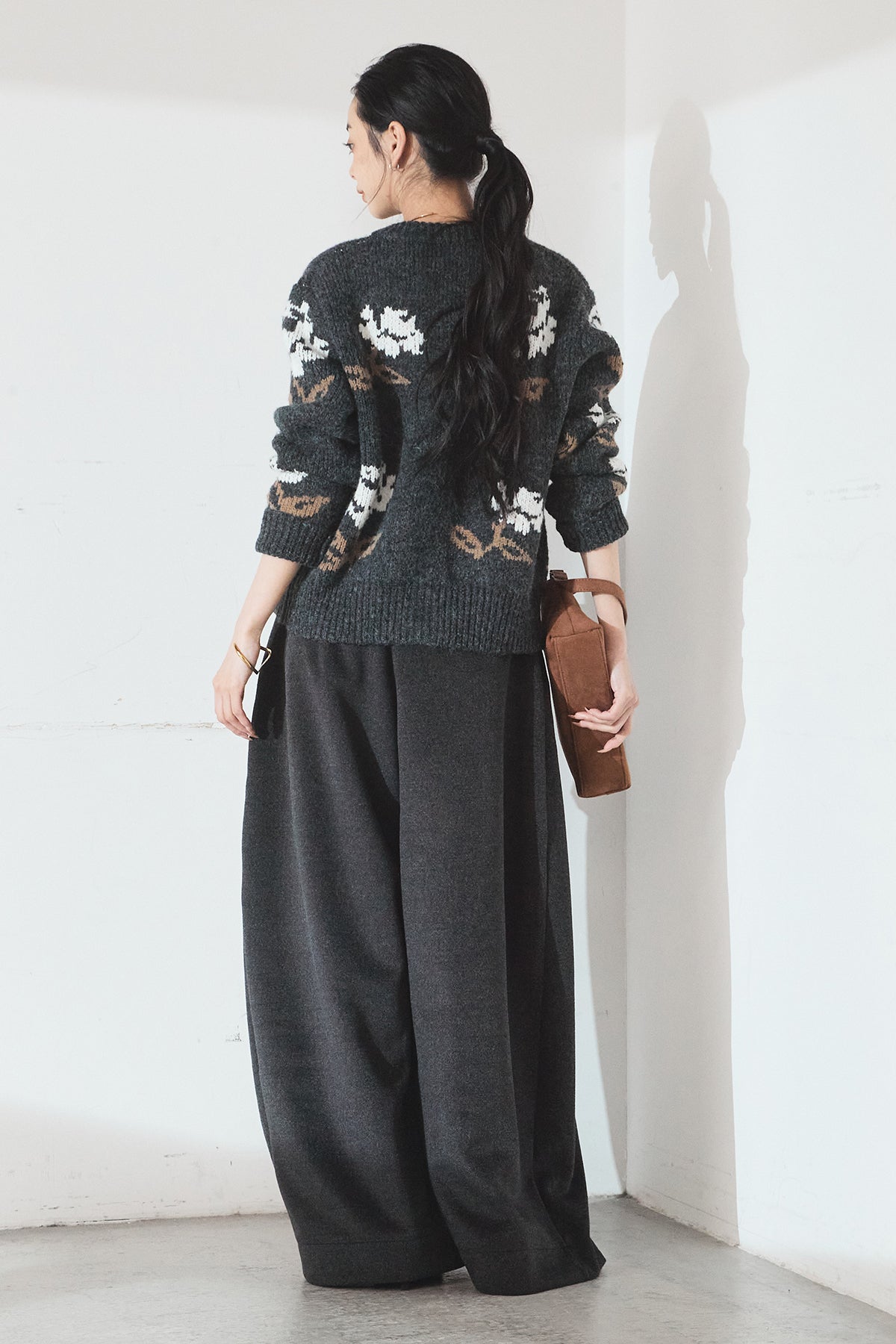 [SET]花柄ジャガードニットカーディガン+ウールタッチカーブワイドパンツ(2set)