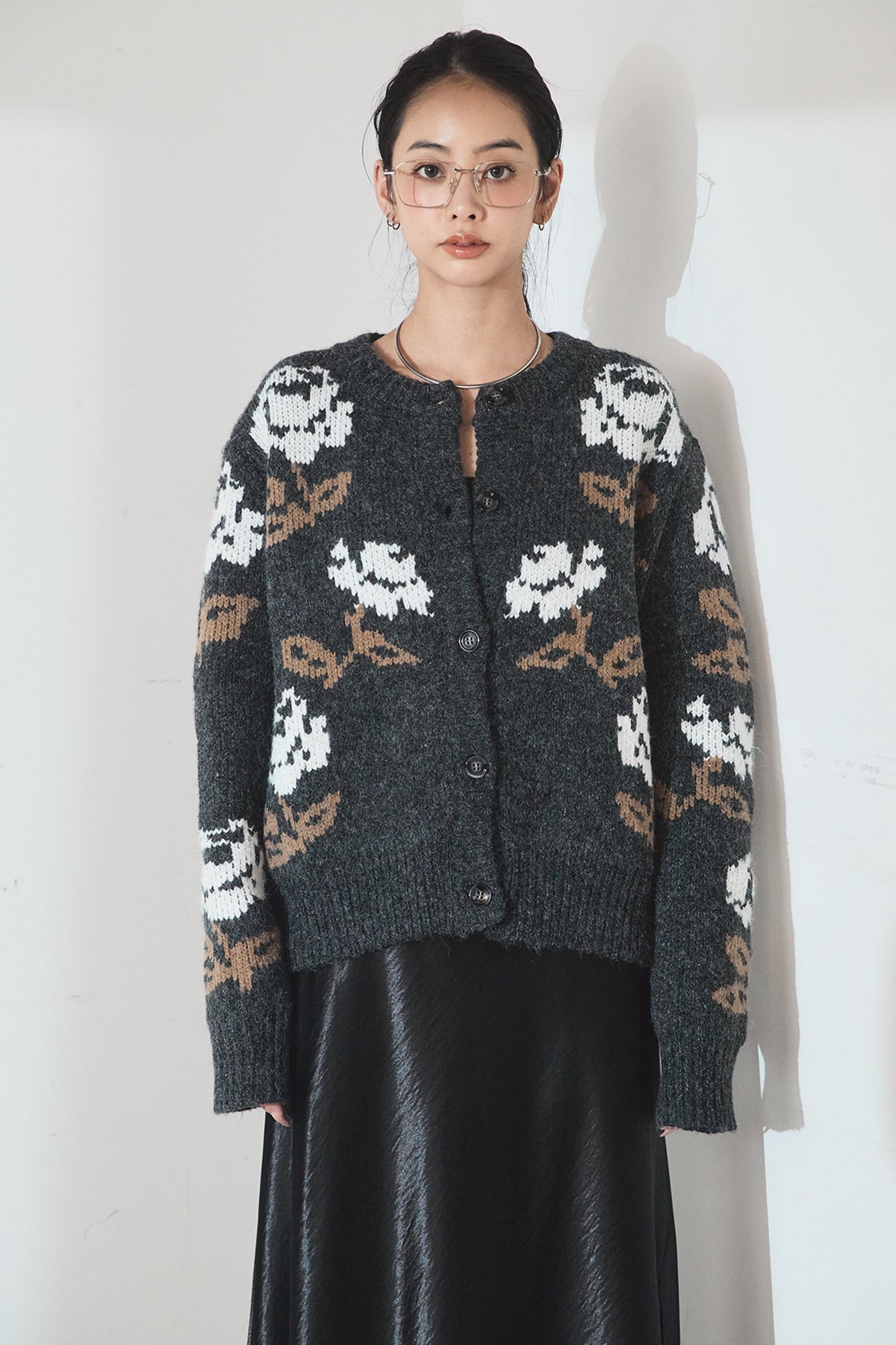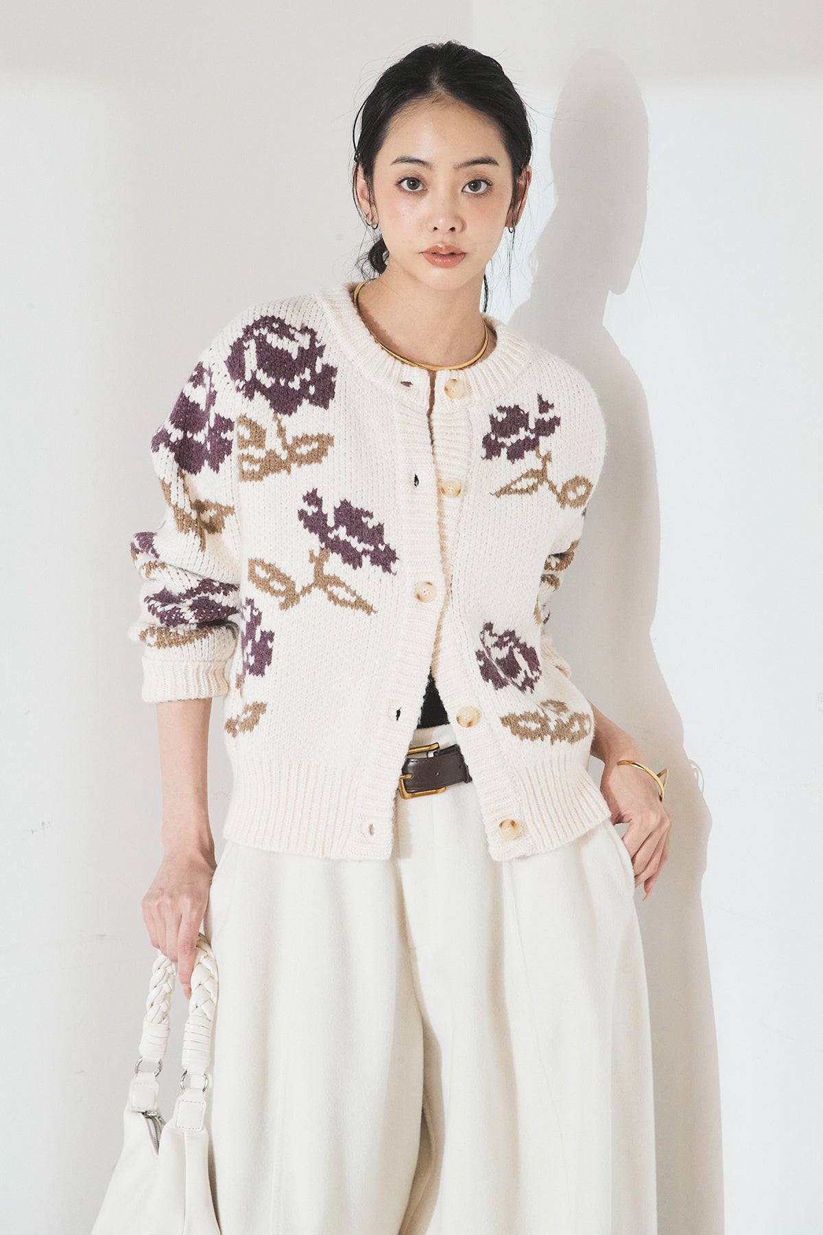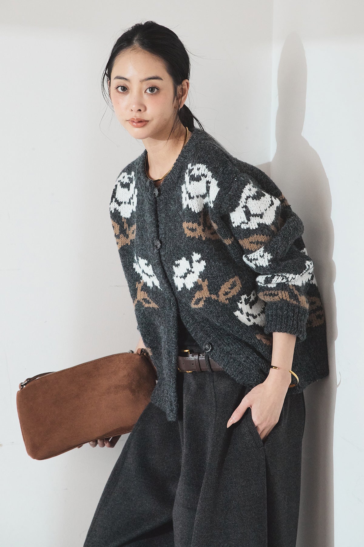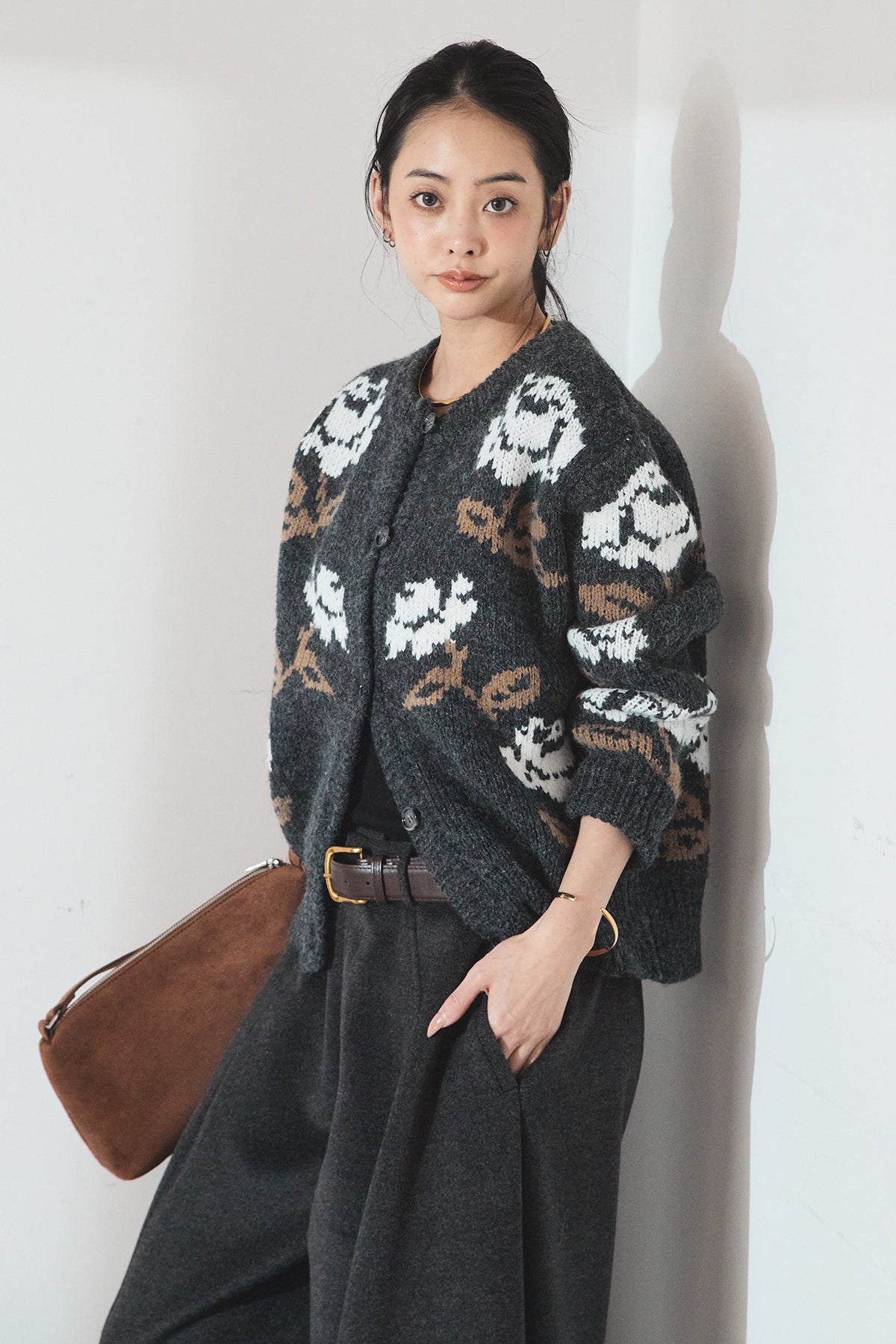 ジャガード織りで表現した花柄が、スタイリングにやさしい華やかさを添えるニットカーディガン。程よく存在感のある柄ながら、落ち着いた配色で大人っぽく仕上げています。コンパクトすぎないシルエットでバランスが取りやすく、ボタンを留めても羽織りとしても活躍。シンプルなボトムを合わせるだけで、季節感のある着こなしが完成する一枚です。
