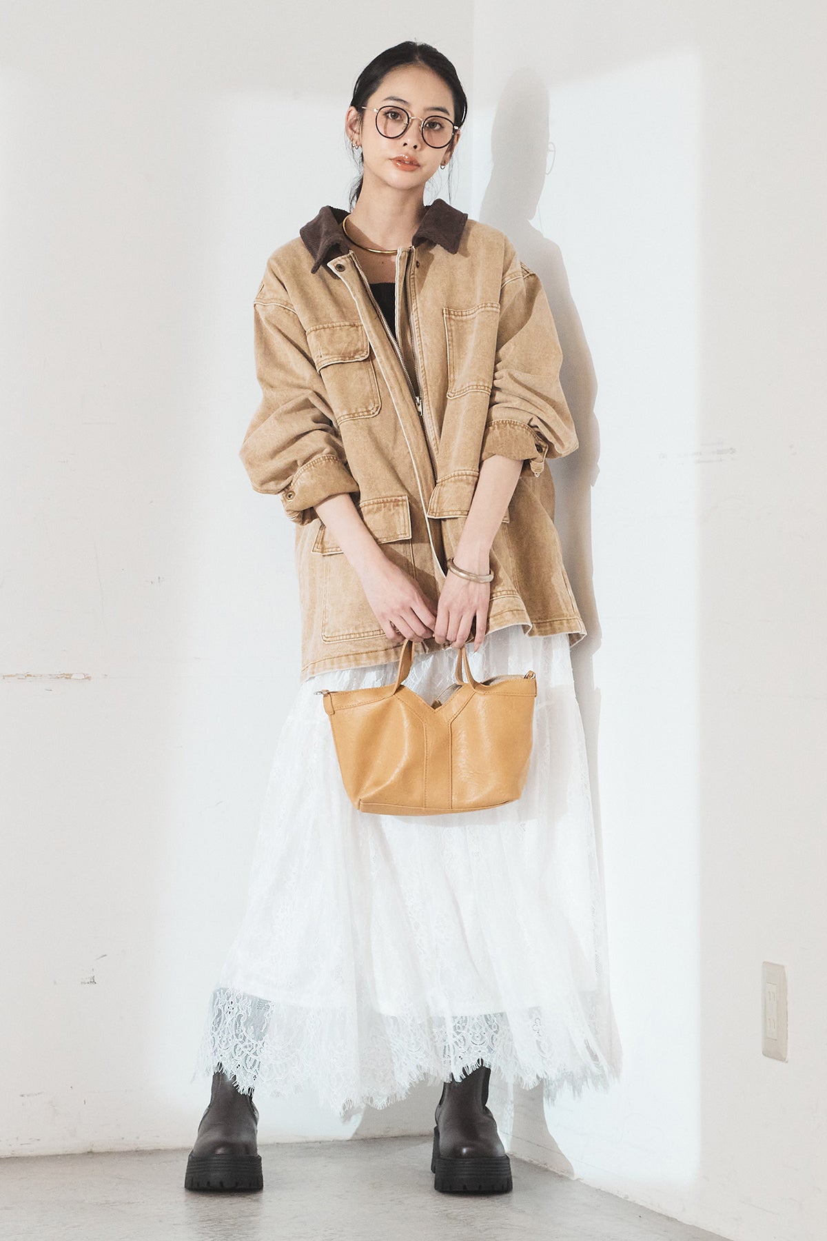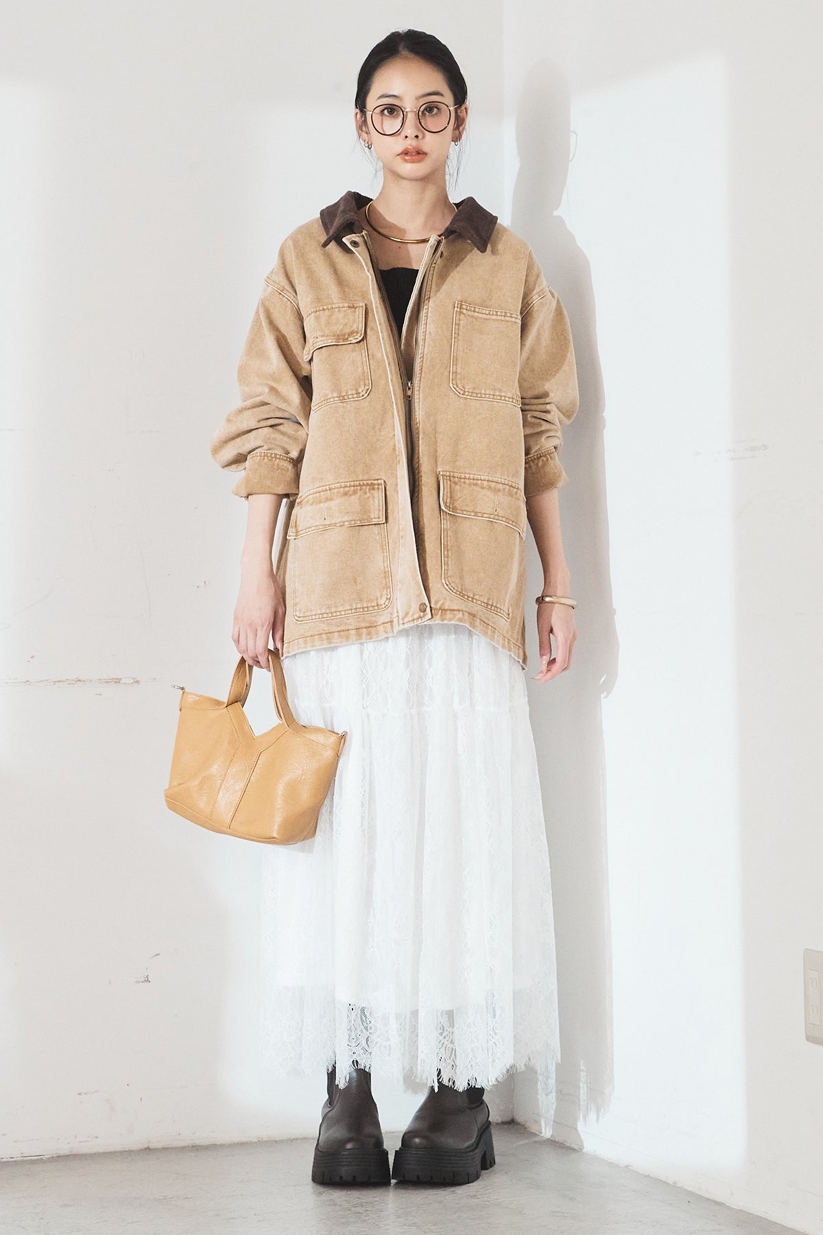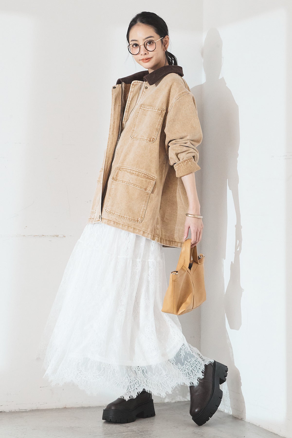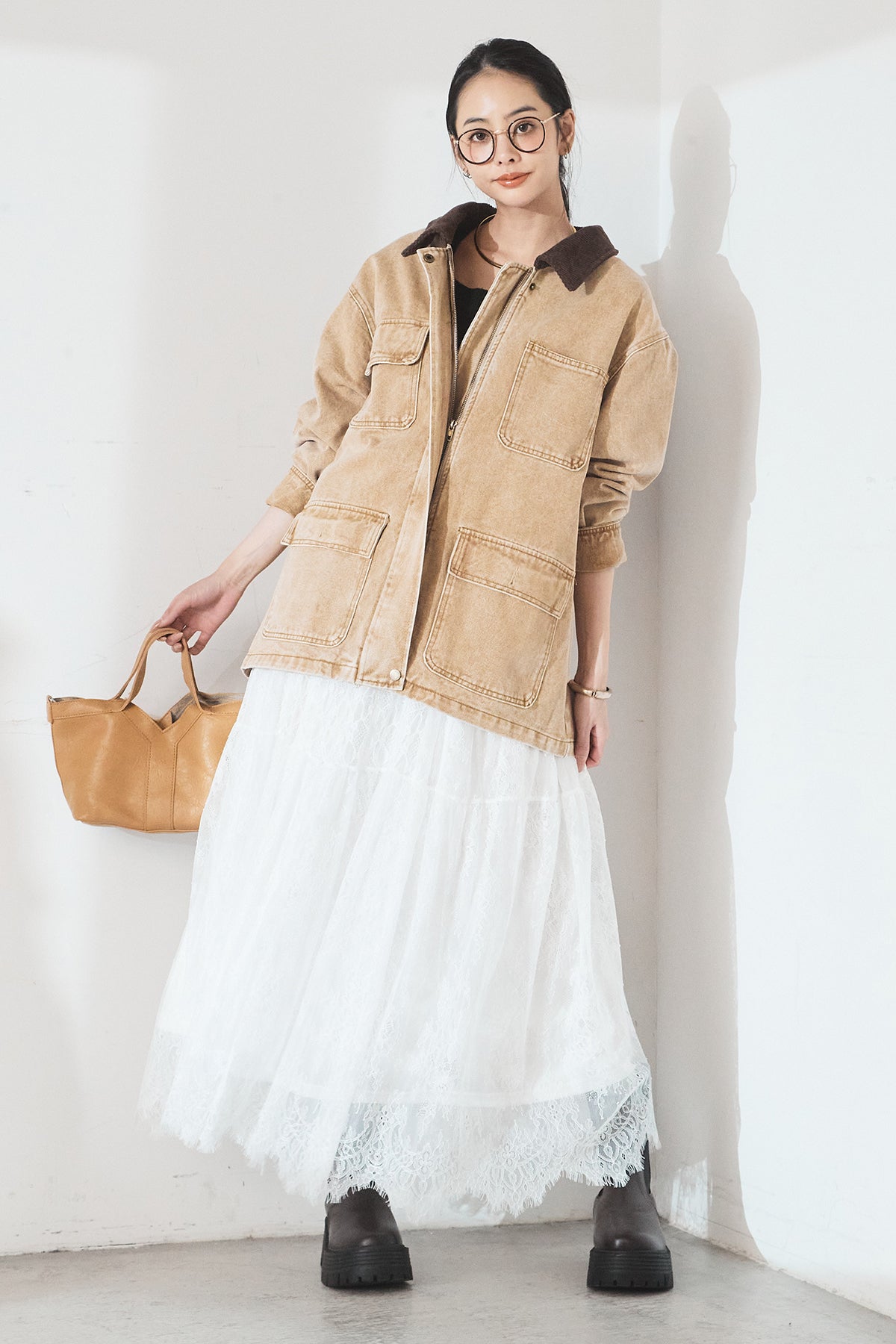 [SET]襟コーデュロイジップデニム調カバーオール+ひげレース切替ロング丈スカート(2set)