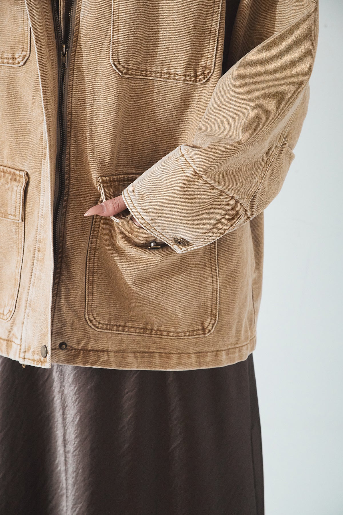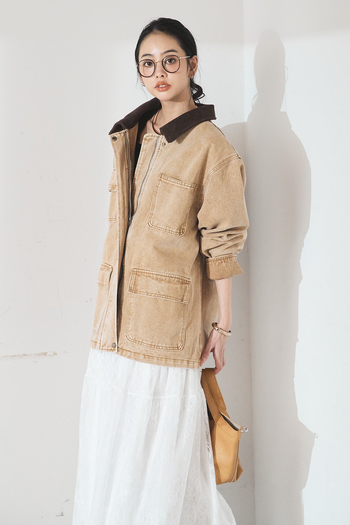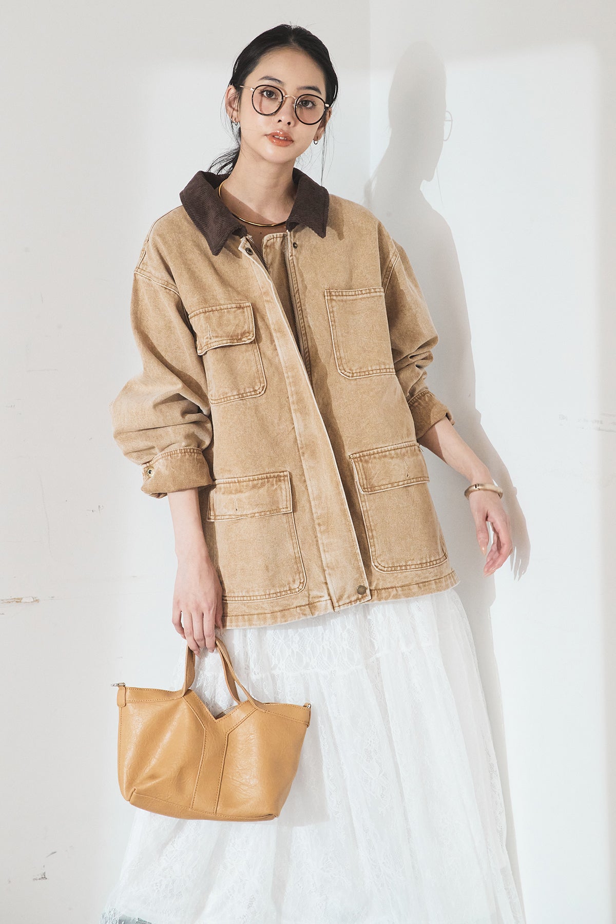 デニム調の素材に、衿元のコーデュロイがアクセントになったカバーオール。程よくラフな風合いがありながら、異素材の切り替えで季節感と表情をプラスします。ゆとりのあるシルエットで重ね着もしやすく、ジップ仕様で着脱もスムーズ。パンツにもスカートにも合わせやすく、デイリーに活躍する一枚です。