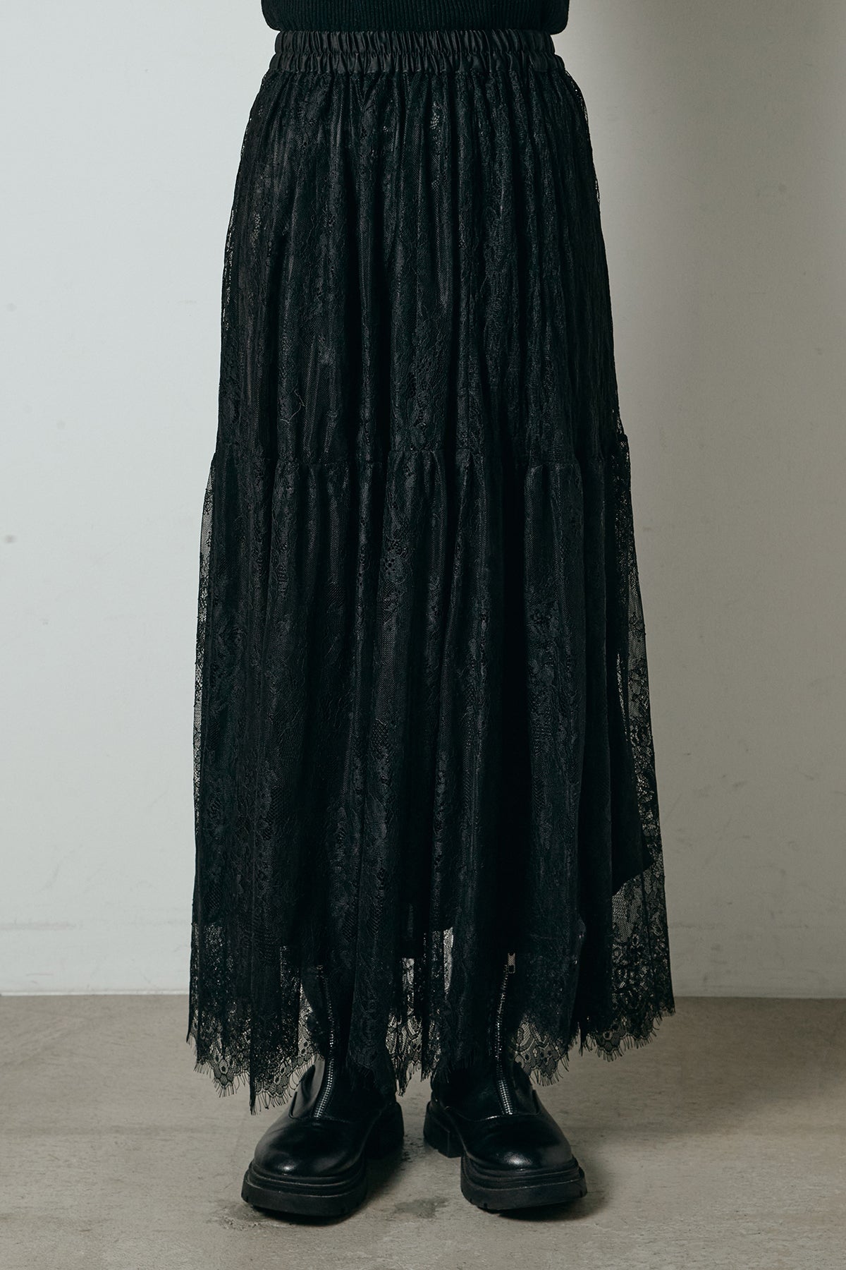 繊細なレース素材を贅沢に使用し、裾にひげレースをあしらったロング丈スカート。切り替えデザインが軽やかな動きを生み、歩くたびに表情のあるシルエットを演出します。ウエストはゴム仕様で穿き心地も快適。ニットやスウェットなどカジュアルなトップスとも好相性で、スタイリングにさりげない甘さを添える一枚です。