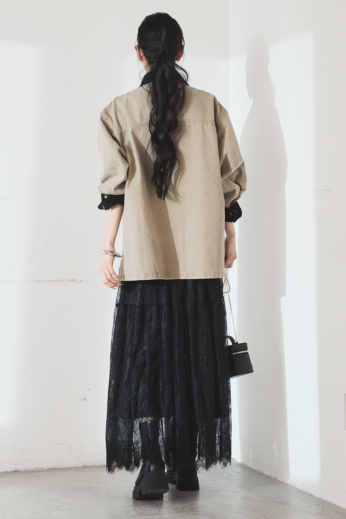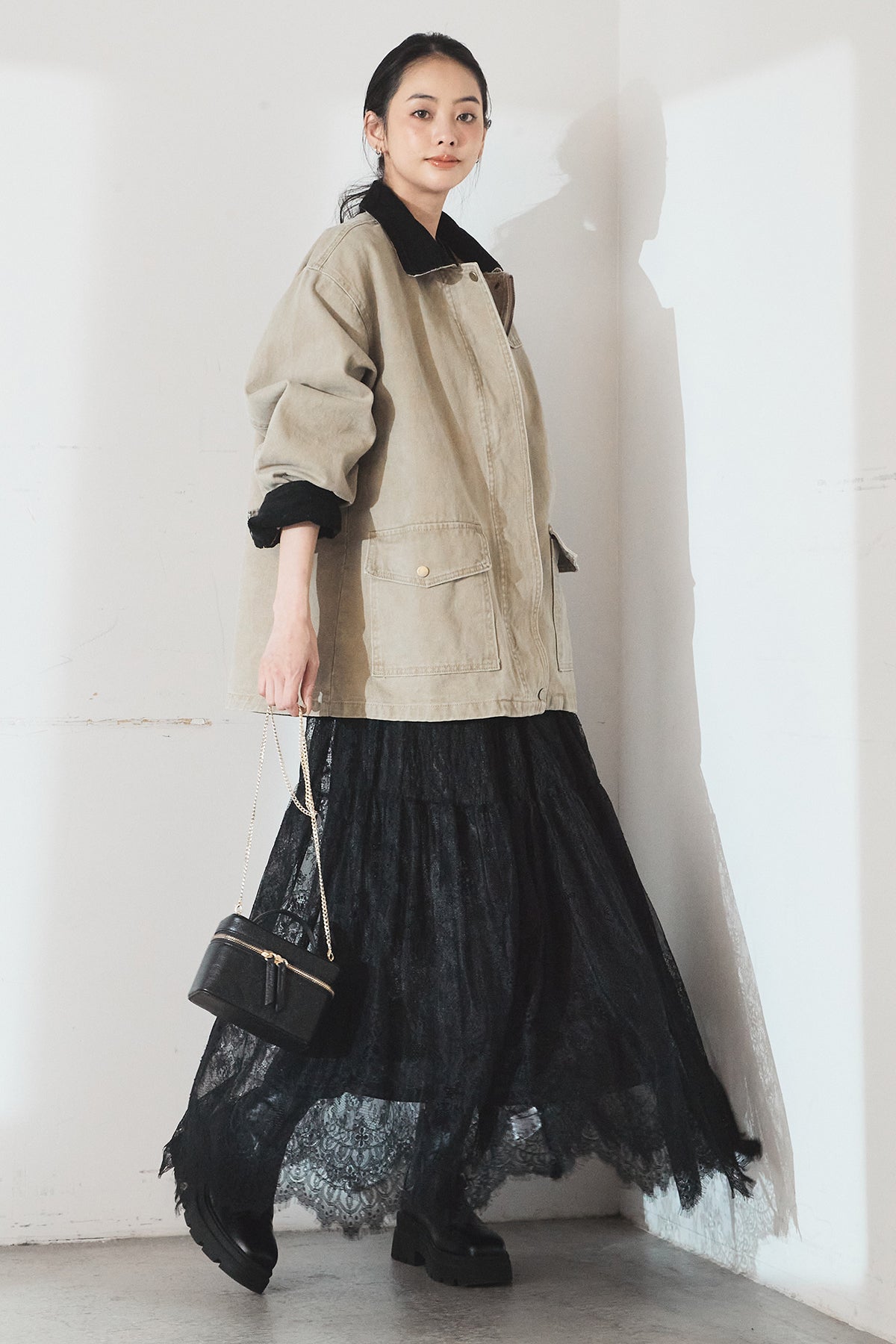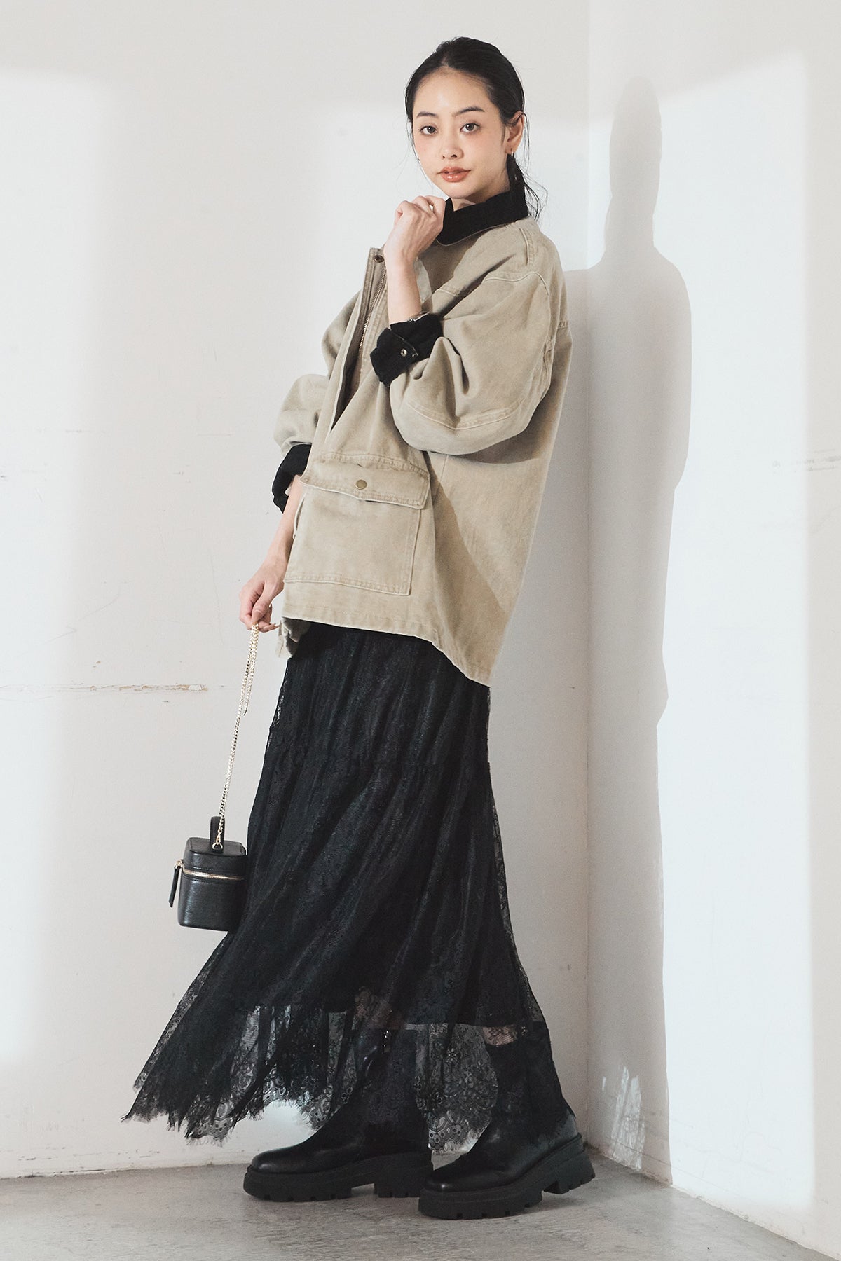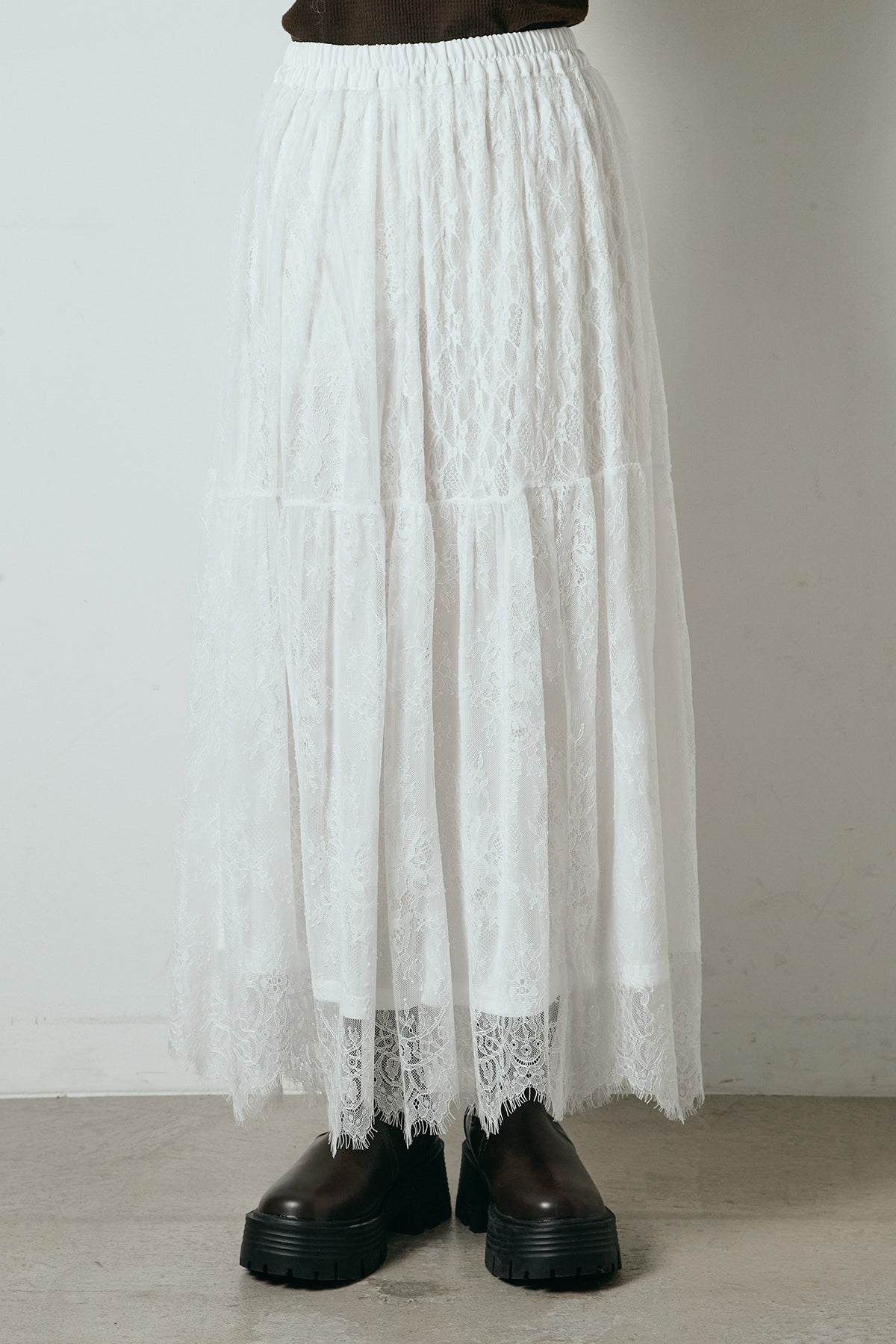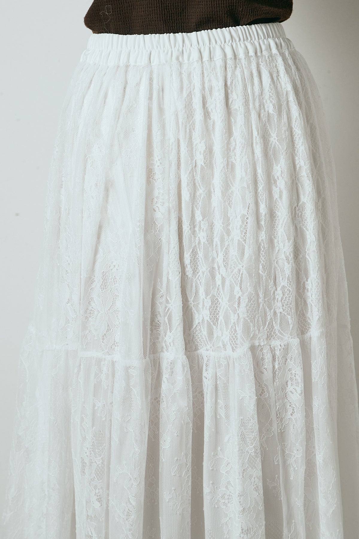 繊細なレース素材を贅沢に使用し、裾にひげレースをあしらったロング丈スカート。切り替えデザインが軽やかな動きを生み、歩くたびに表情のあるシルエットを演出します。ウエストはゴム仕様で穿き心地も快適。ニットやスウェットなどカジュアルなトップスとも好相性で、スタイリングにさりげない甘さを添える一枚です。