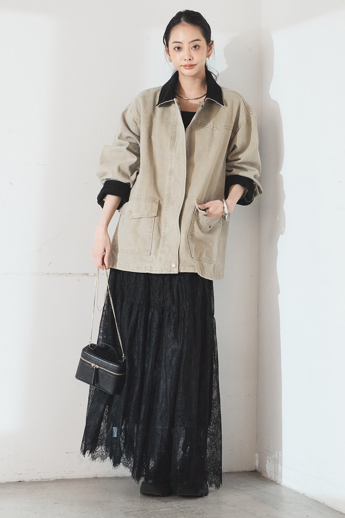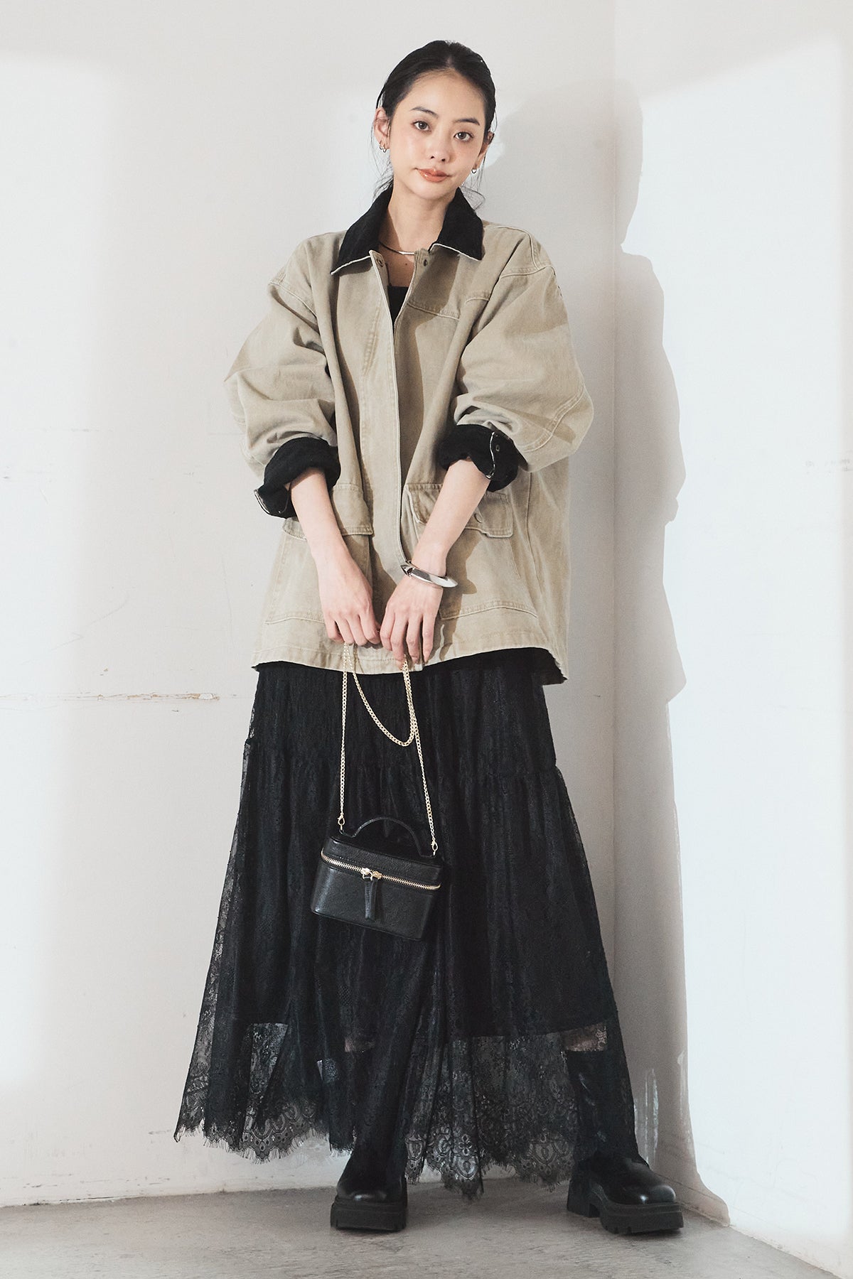 [SET]襟コーデュロイデザインデニム調カバーオール+ひげレース切替ロング丈スカート(2set)