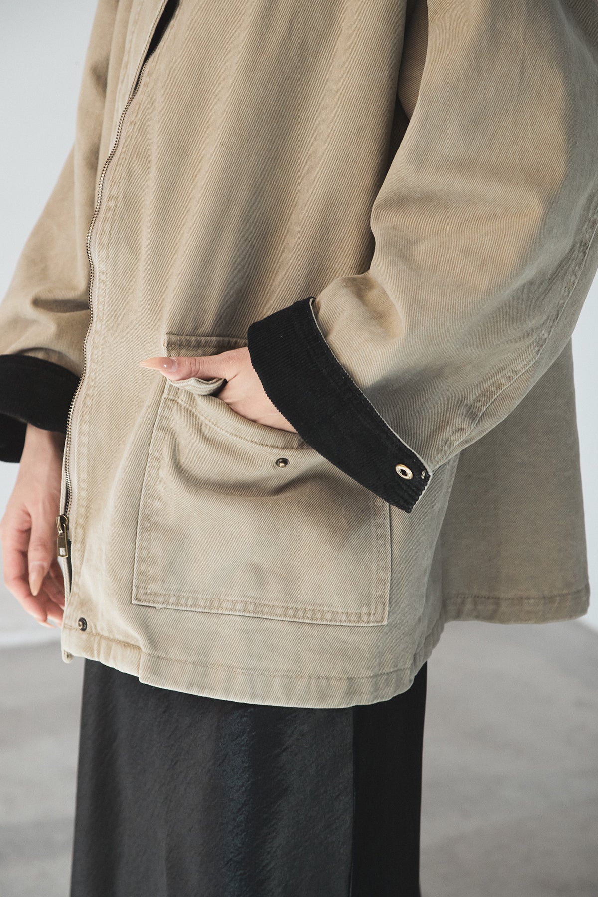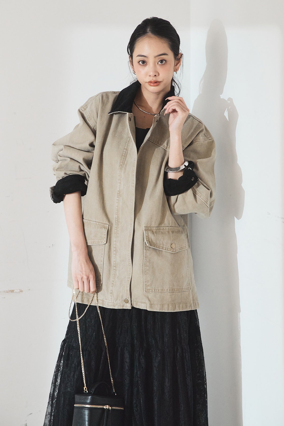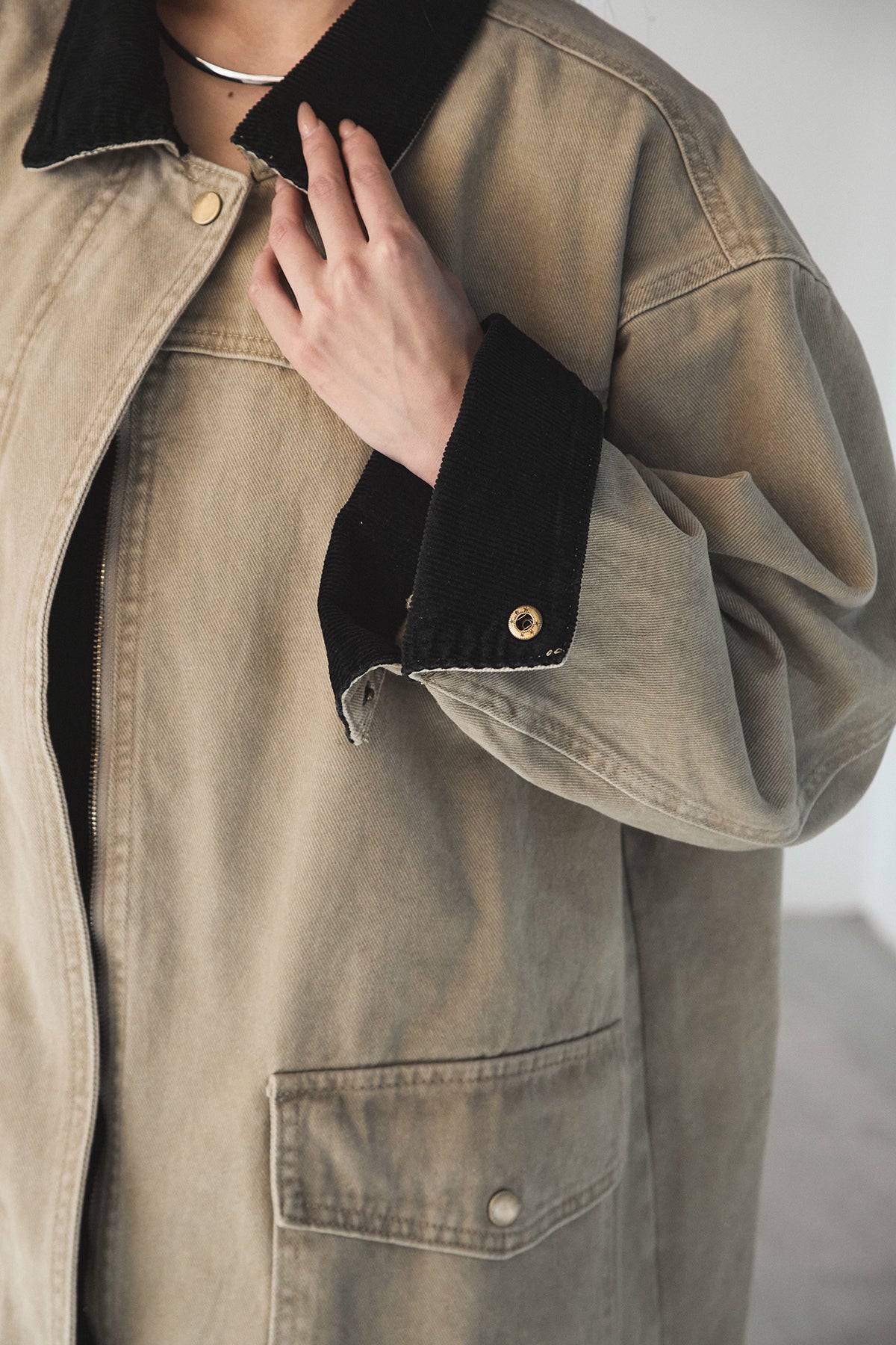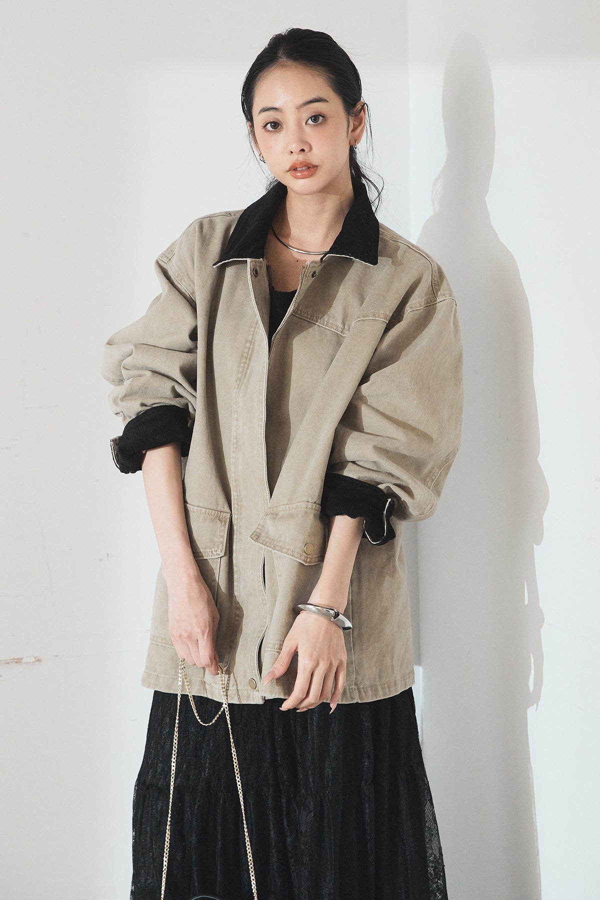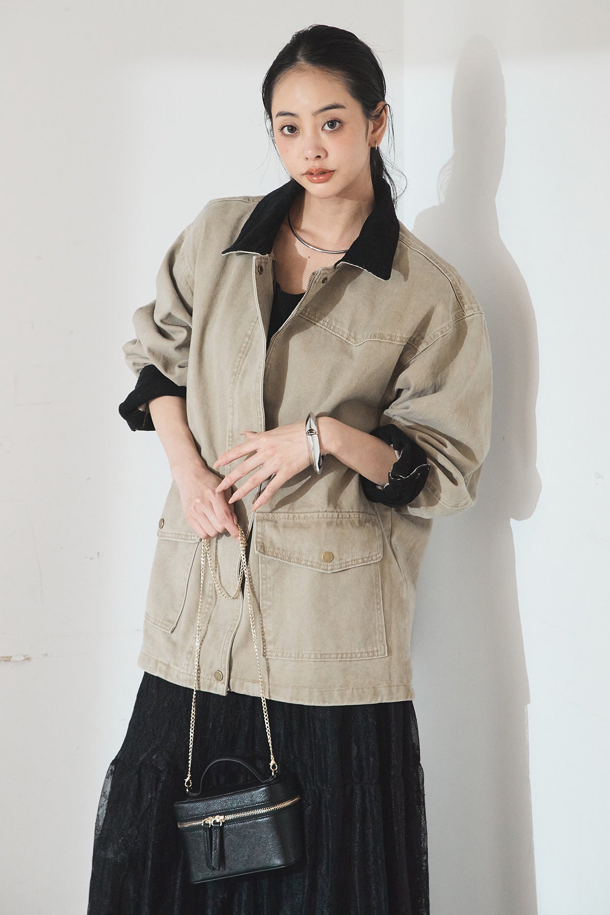 デニム調の素材に、衿元のコーデュロイ切り替えが映えるカバーオール。程よくゆとりのあるシルエットで、ラフさの中にも大人っぽいバランスを演出します。異素材のコントラストがさりげないアクセントとなり、袖をロールアップしても表情のある着こなしに。パンツにもスカートにも合わせやすく、デイリーに取り入れやすい一枚です。