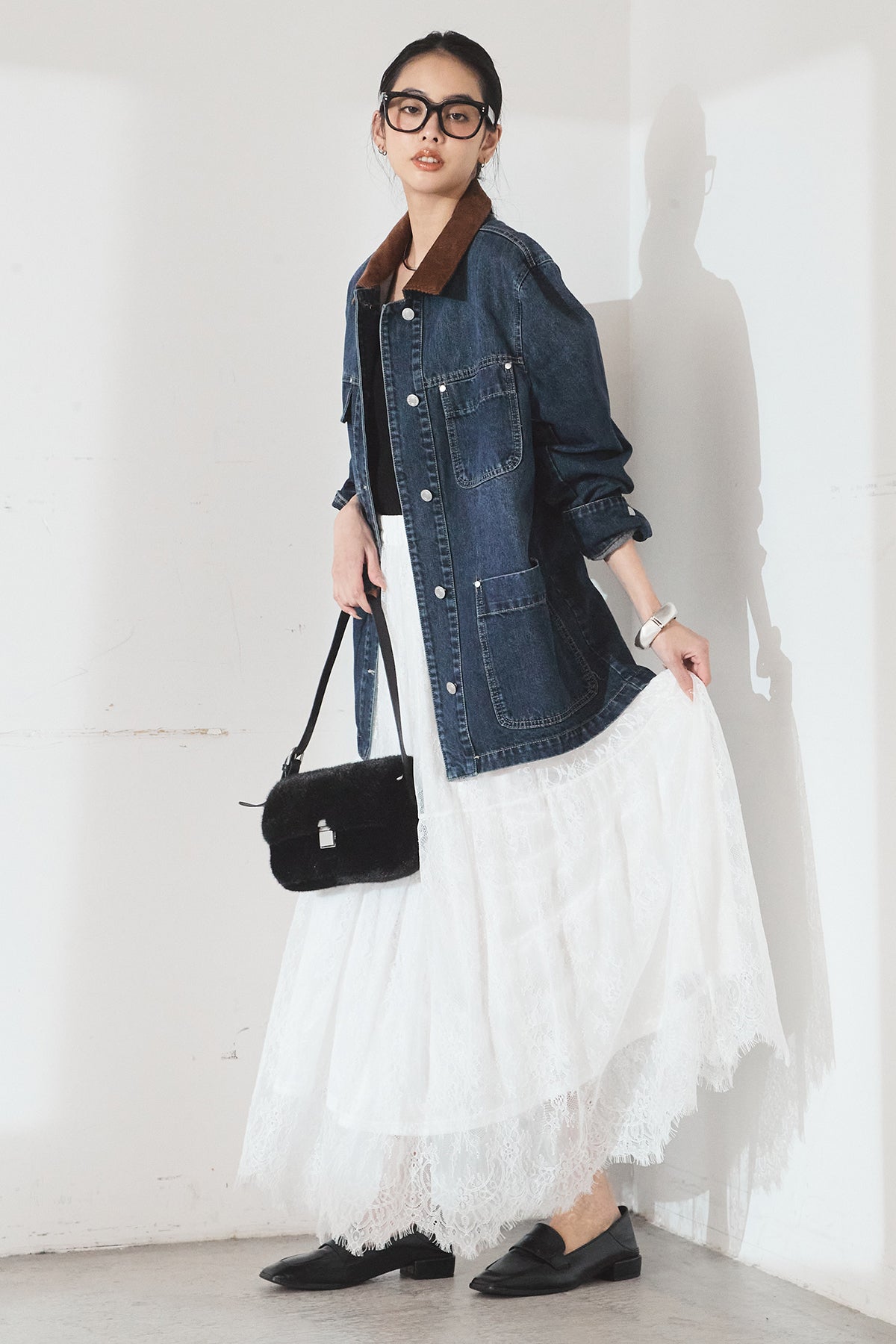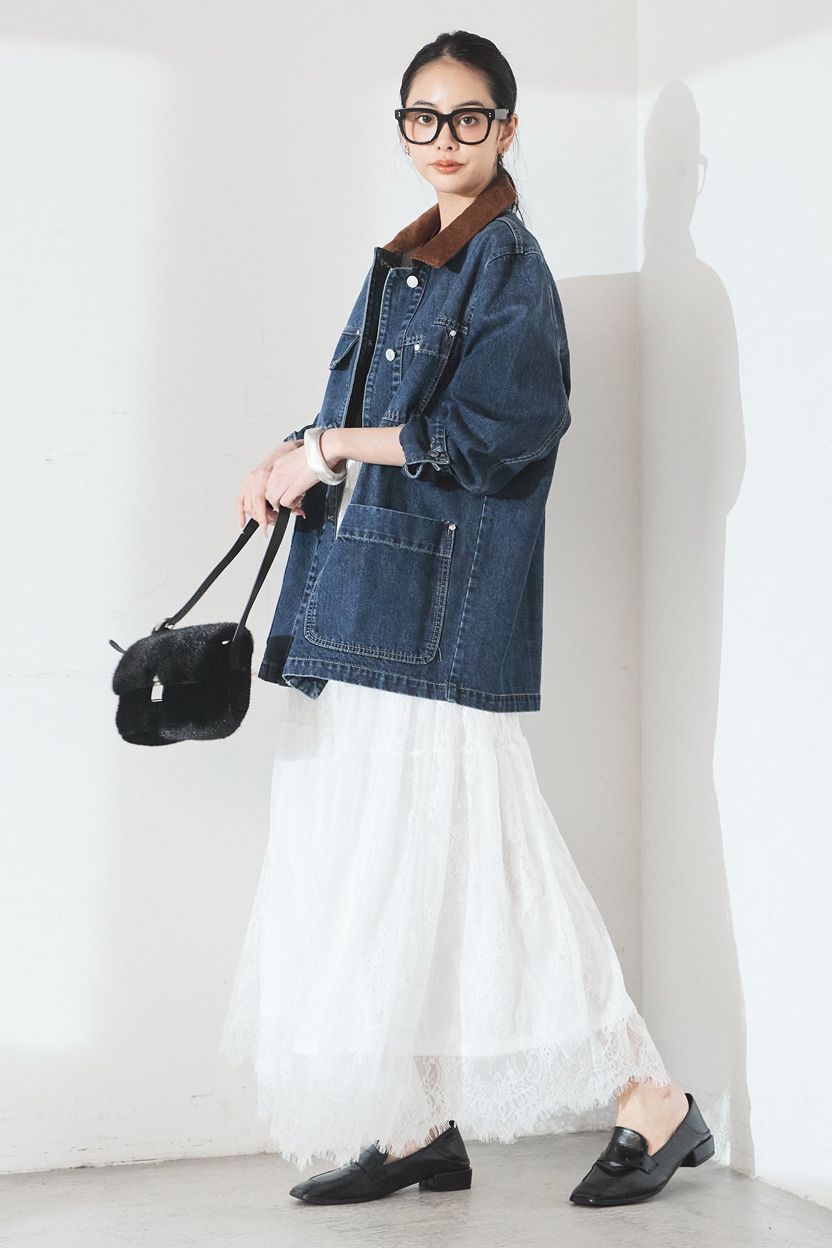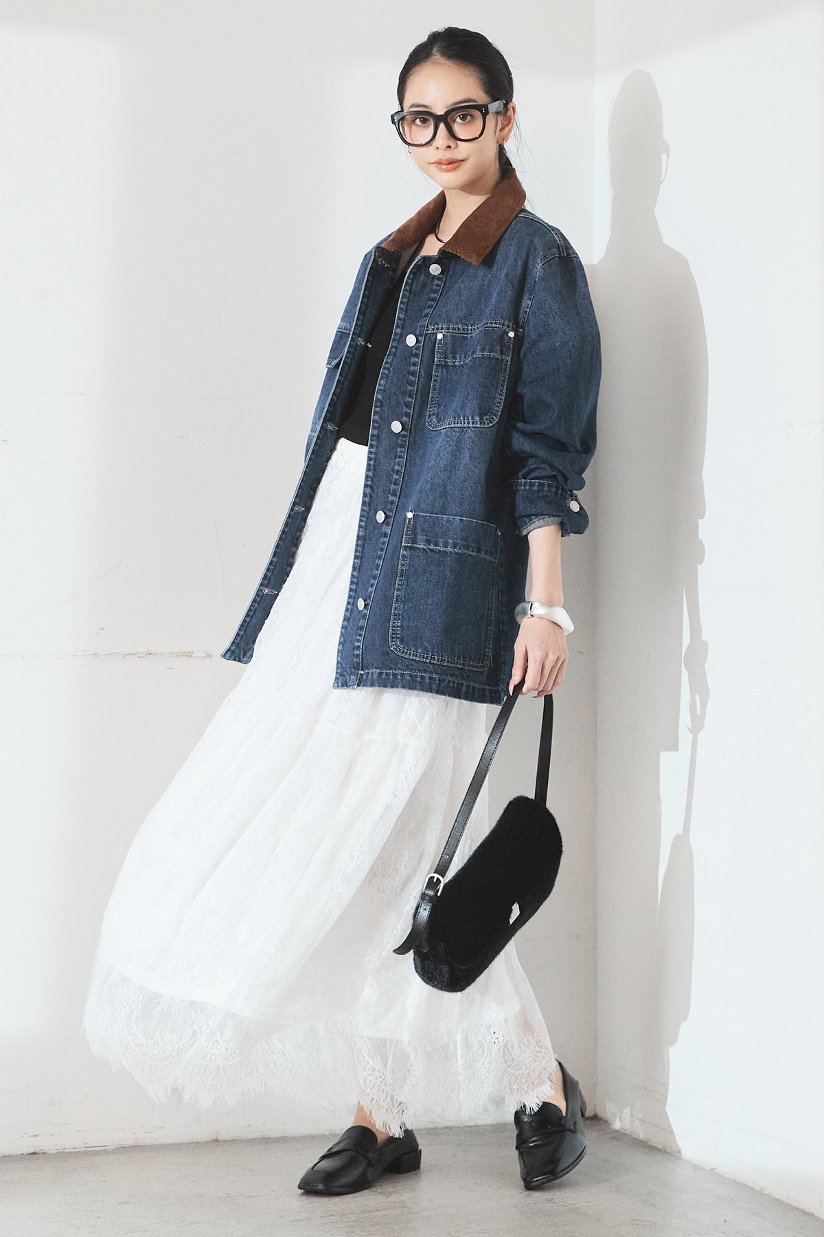 [SET]襟コーデュロイデニムカバーオール+ひげレース切替ロング丈スカート(2set)