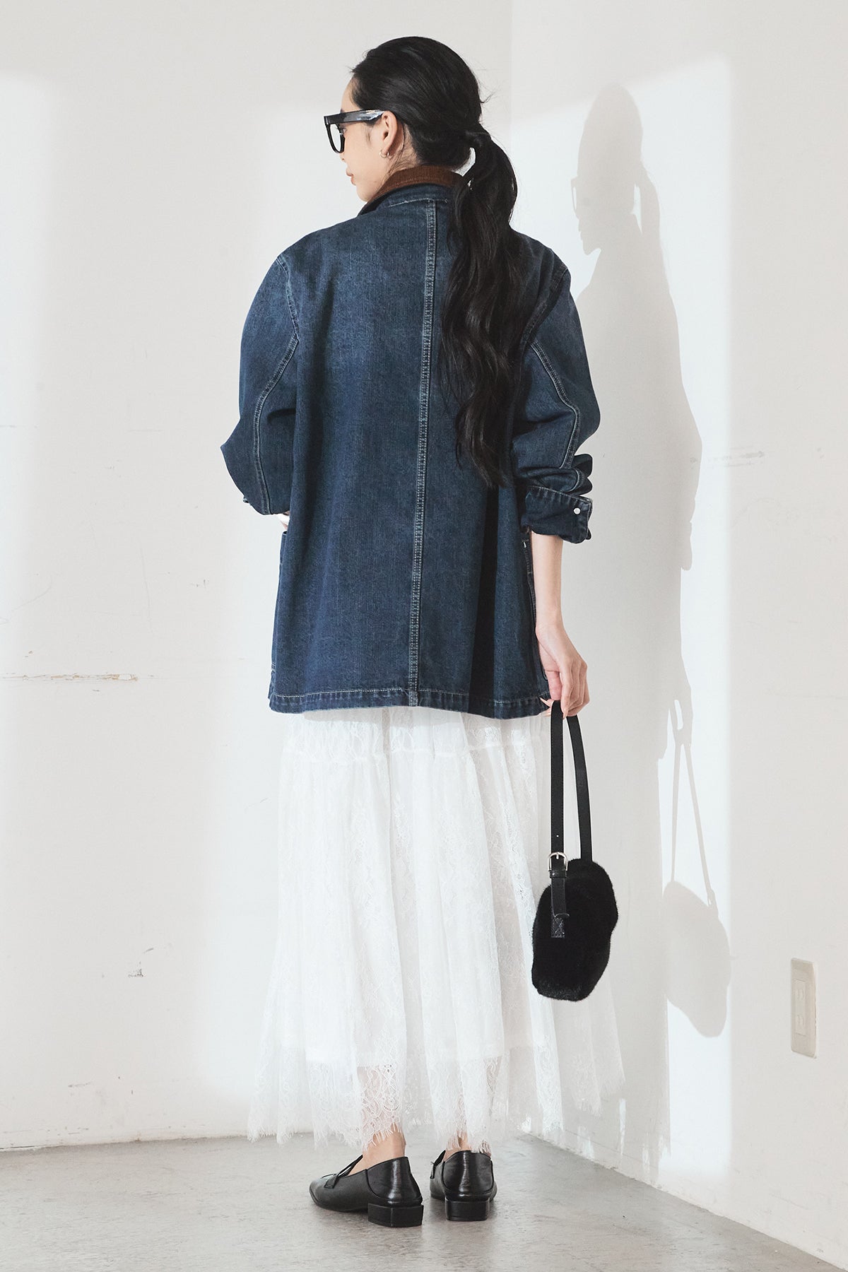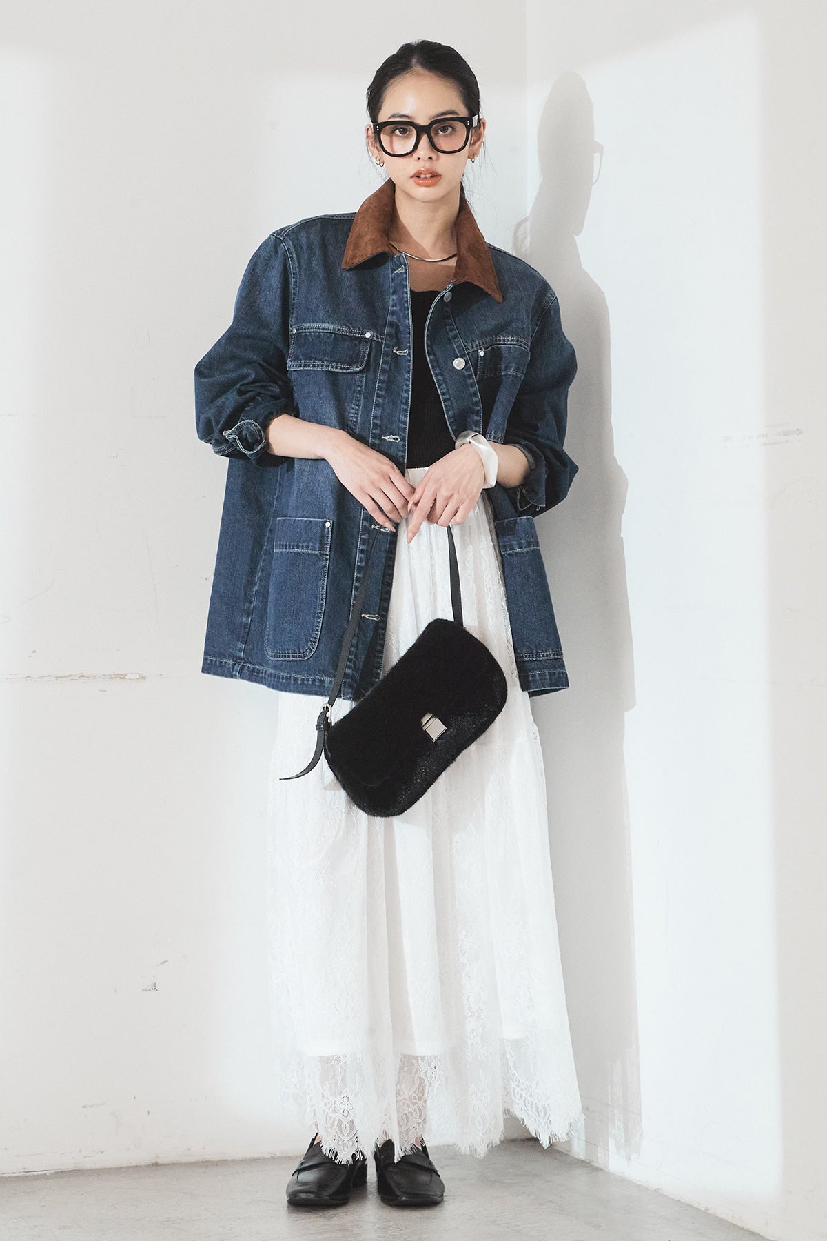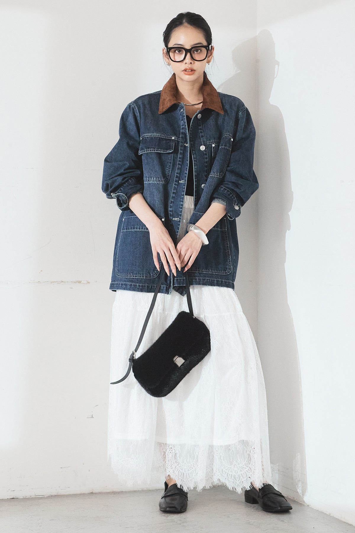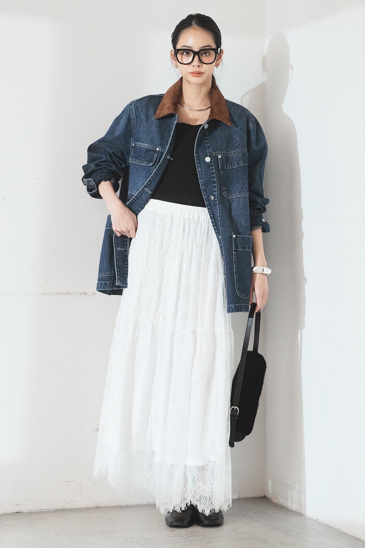 [SET]襟コーデュロイデニムカバーオール+ひげレース切替ロング丈スカート(2set)